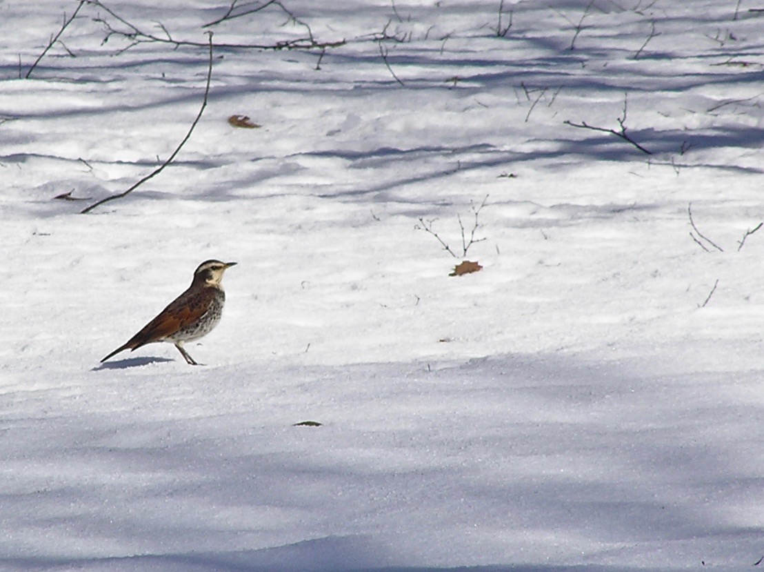冬に最もよく見かけるのが、このツグミ。大きさもヒヨドリぐらいで目立ちます。
