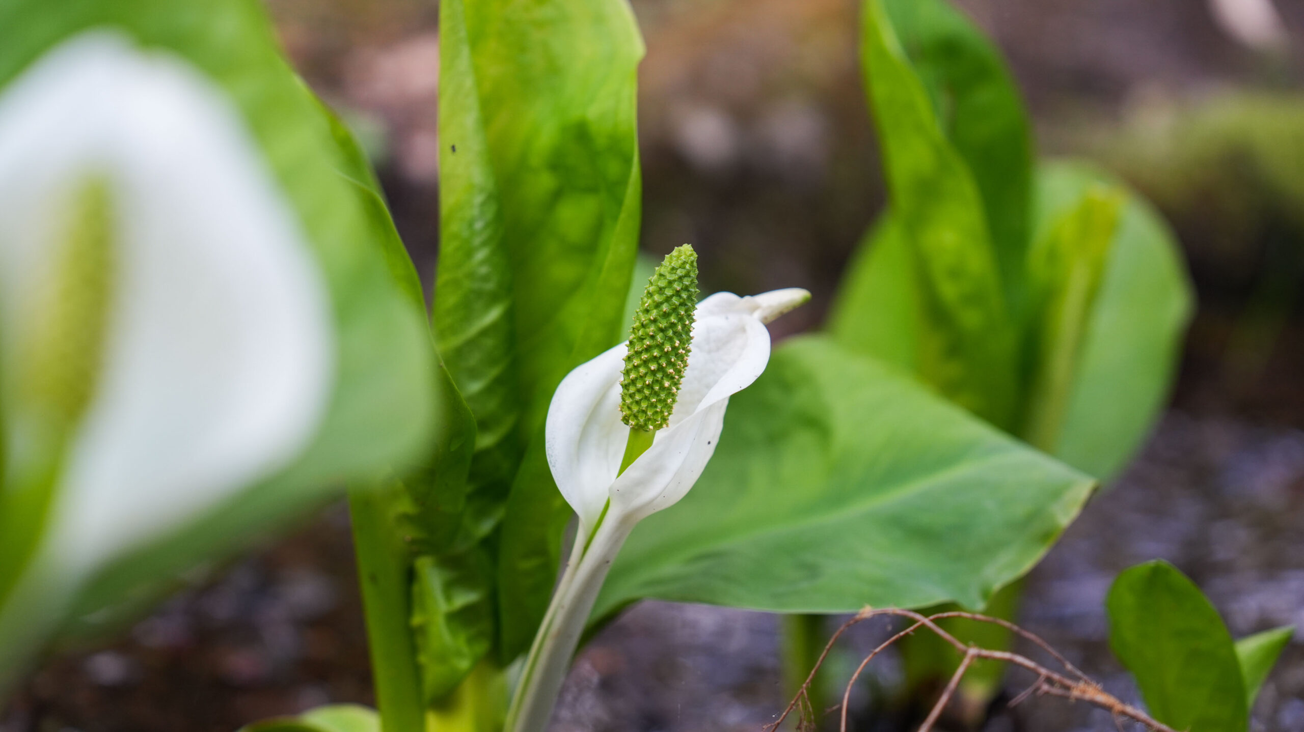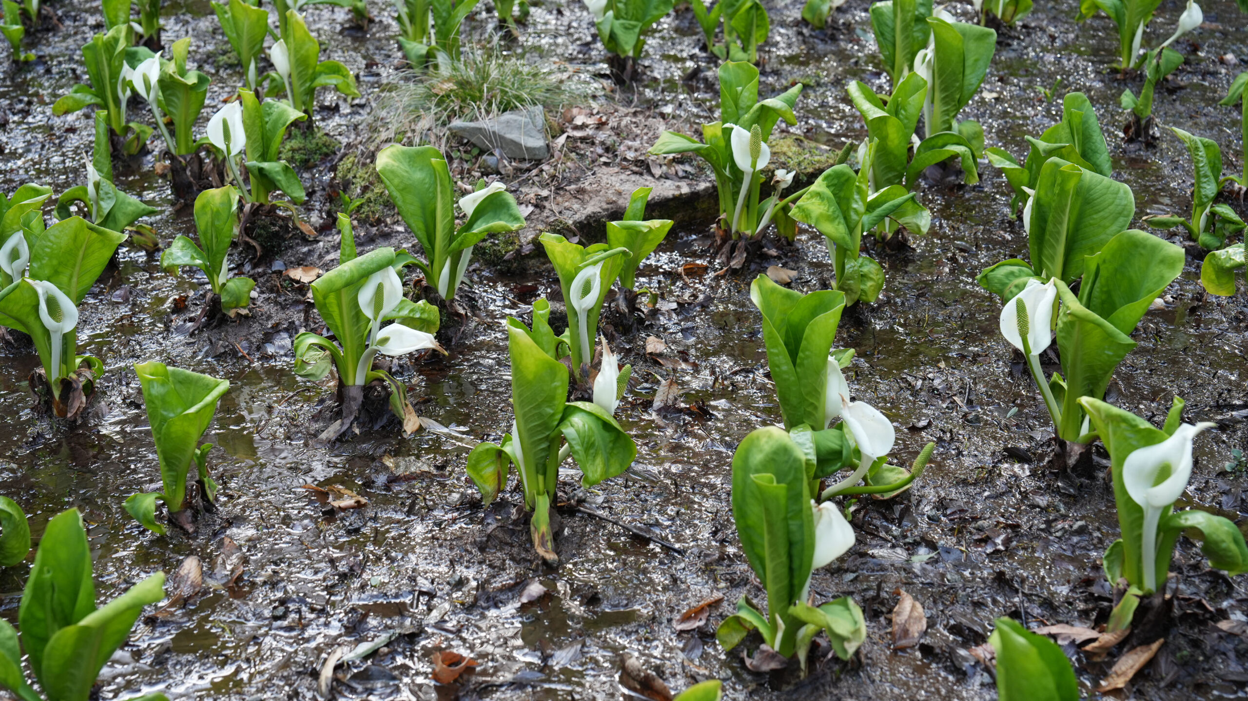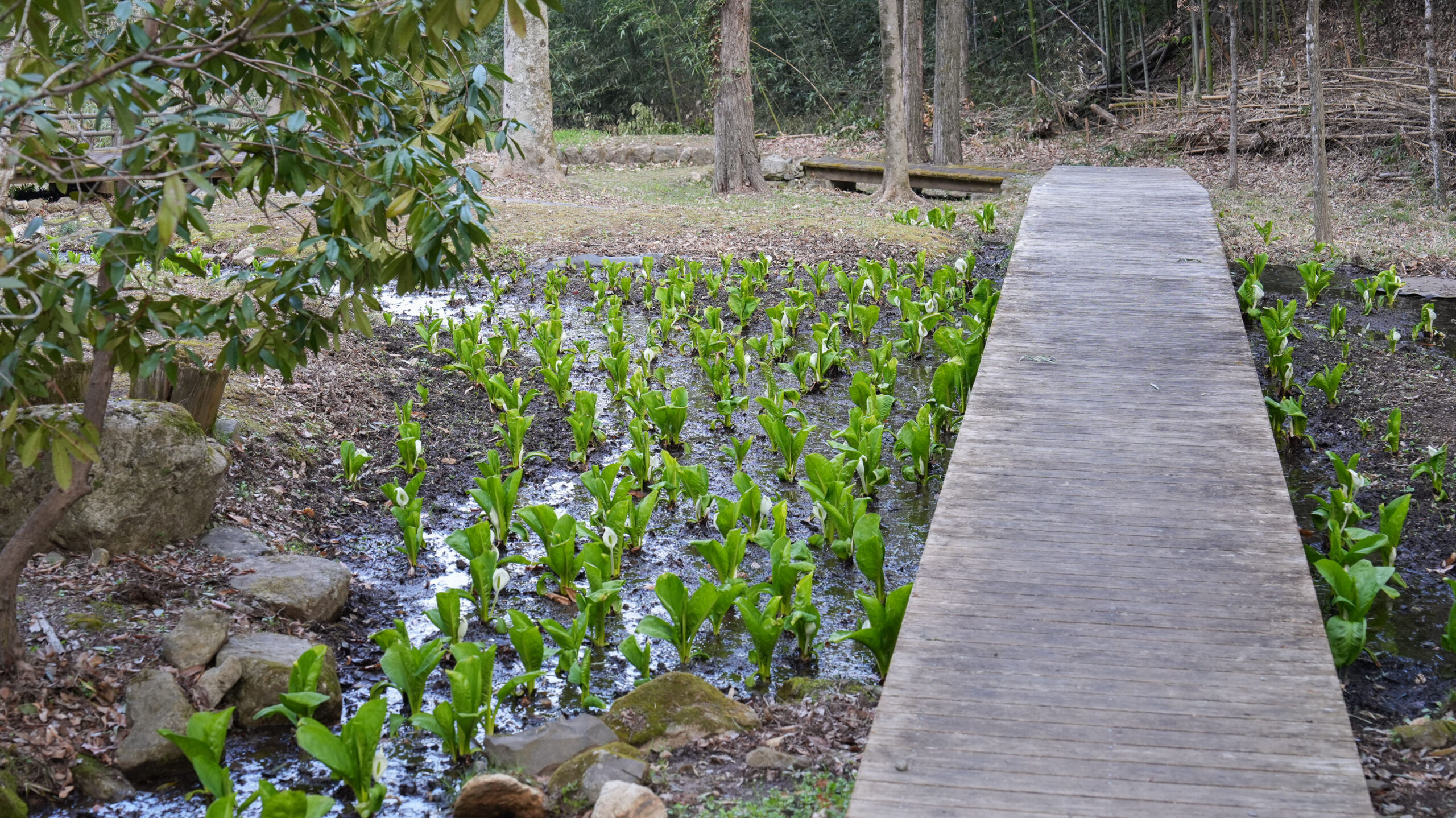 ここ大窪いやしの杜公園では、水芭蕉の葉の成長とともに真っ白な仏炎苞が美しく顔をのぞかせており、見頃を迎えています。