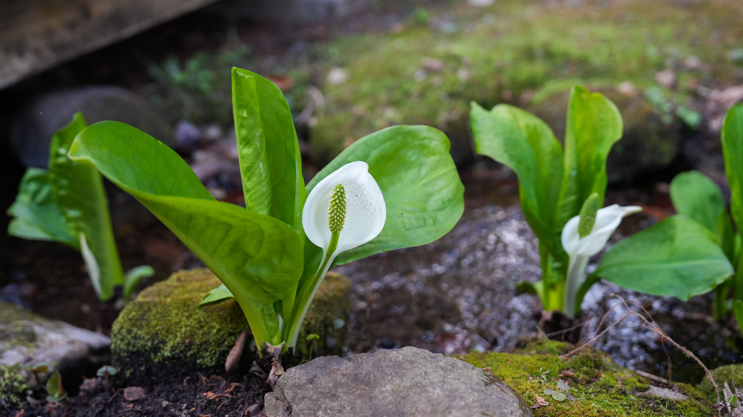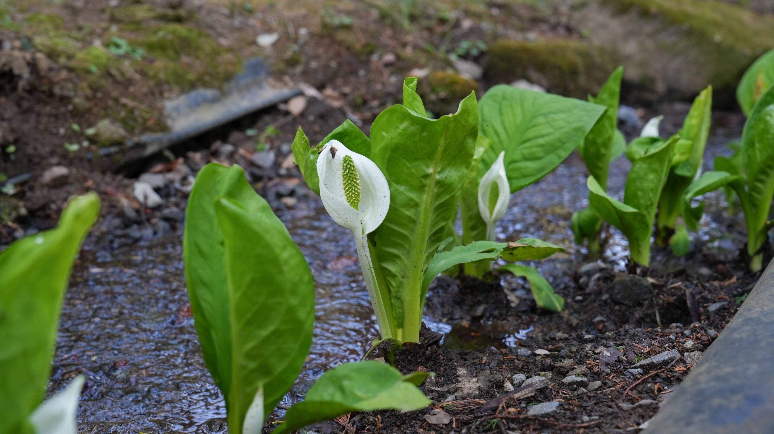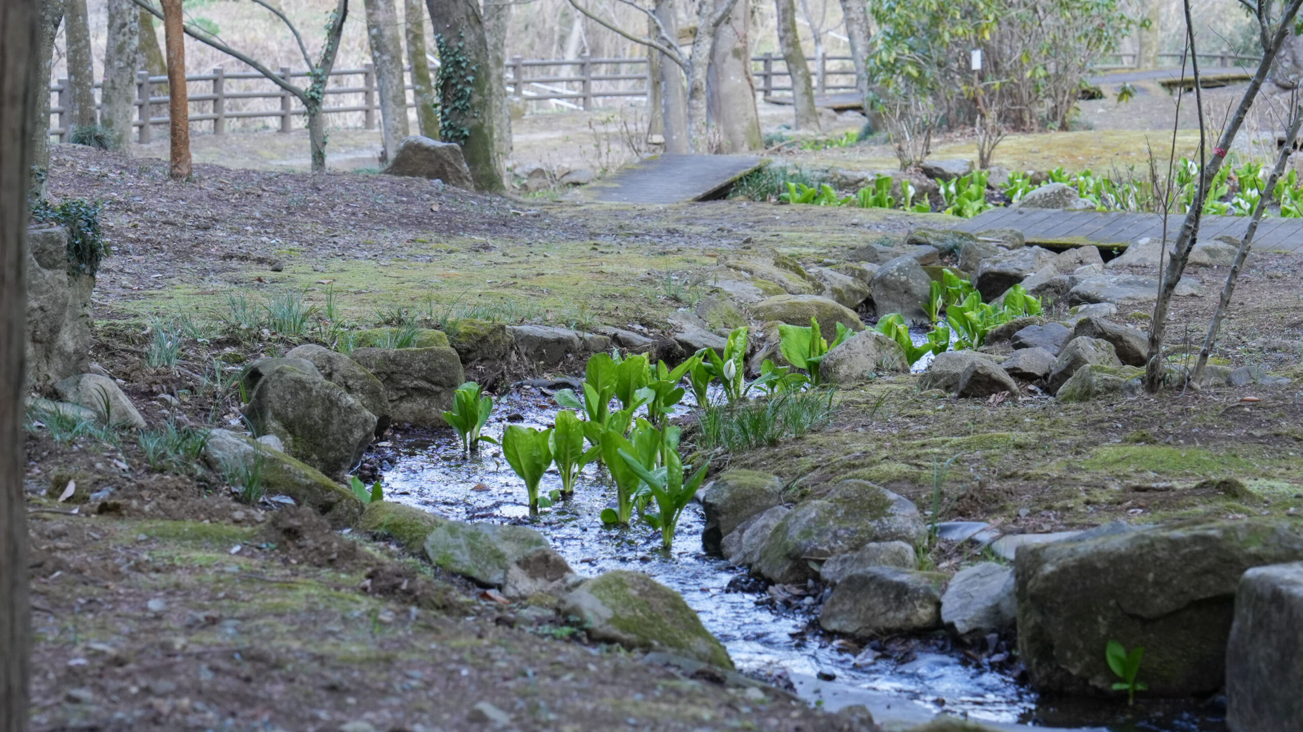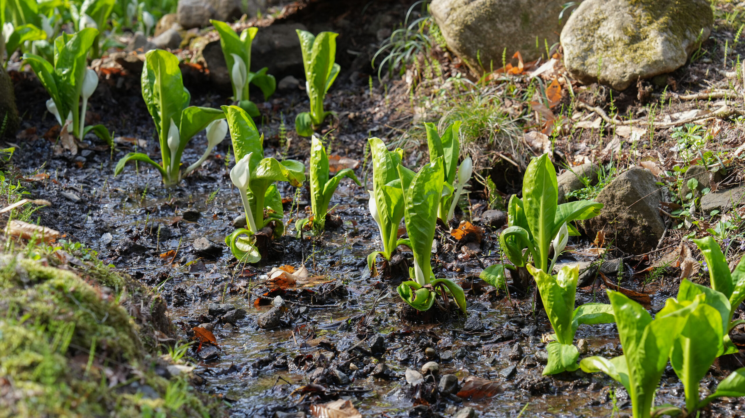 ここ大窪いやしの杜公園では、水芭蕉の葉の成長とともに真っ白な仏炎苞が美しく顔をのぞかせており、見頃を迎えています。