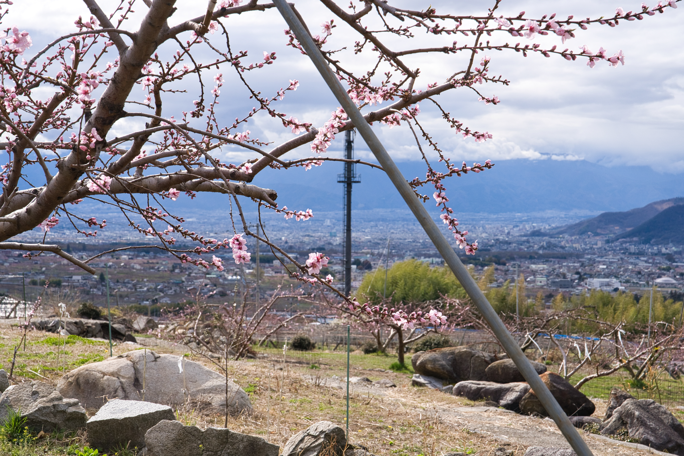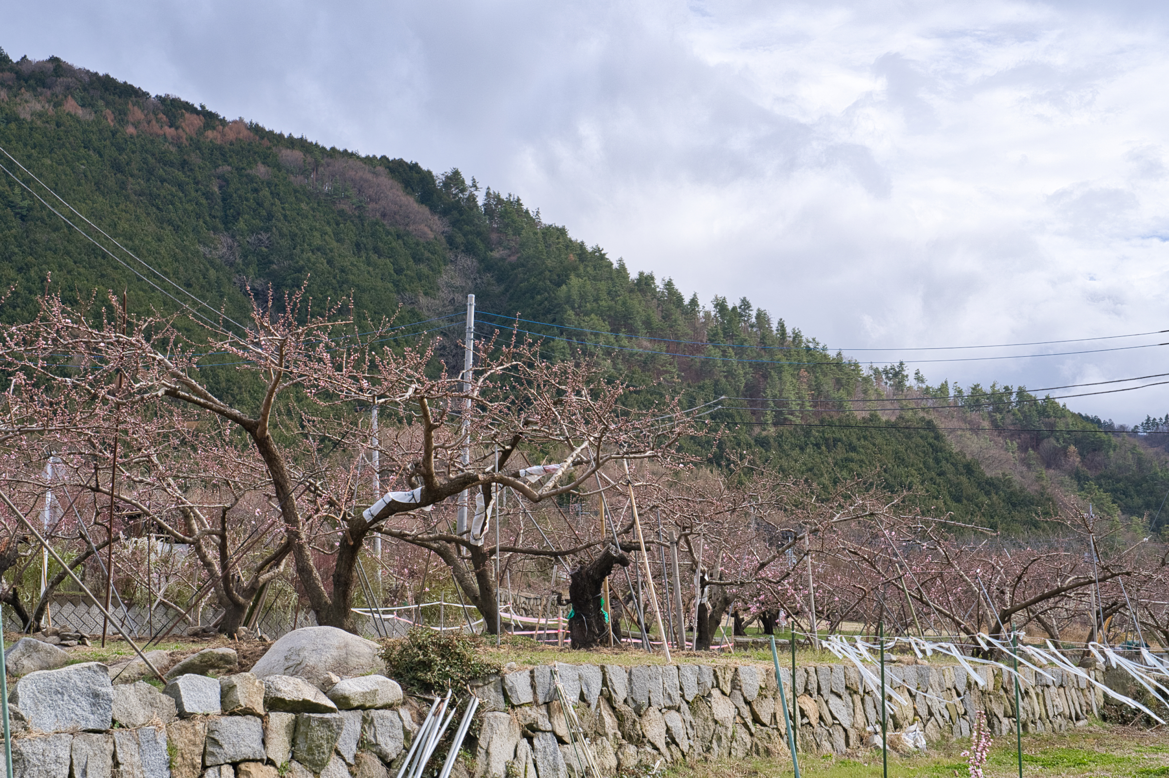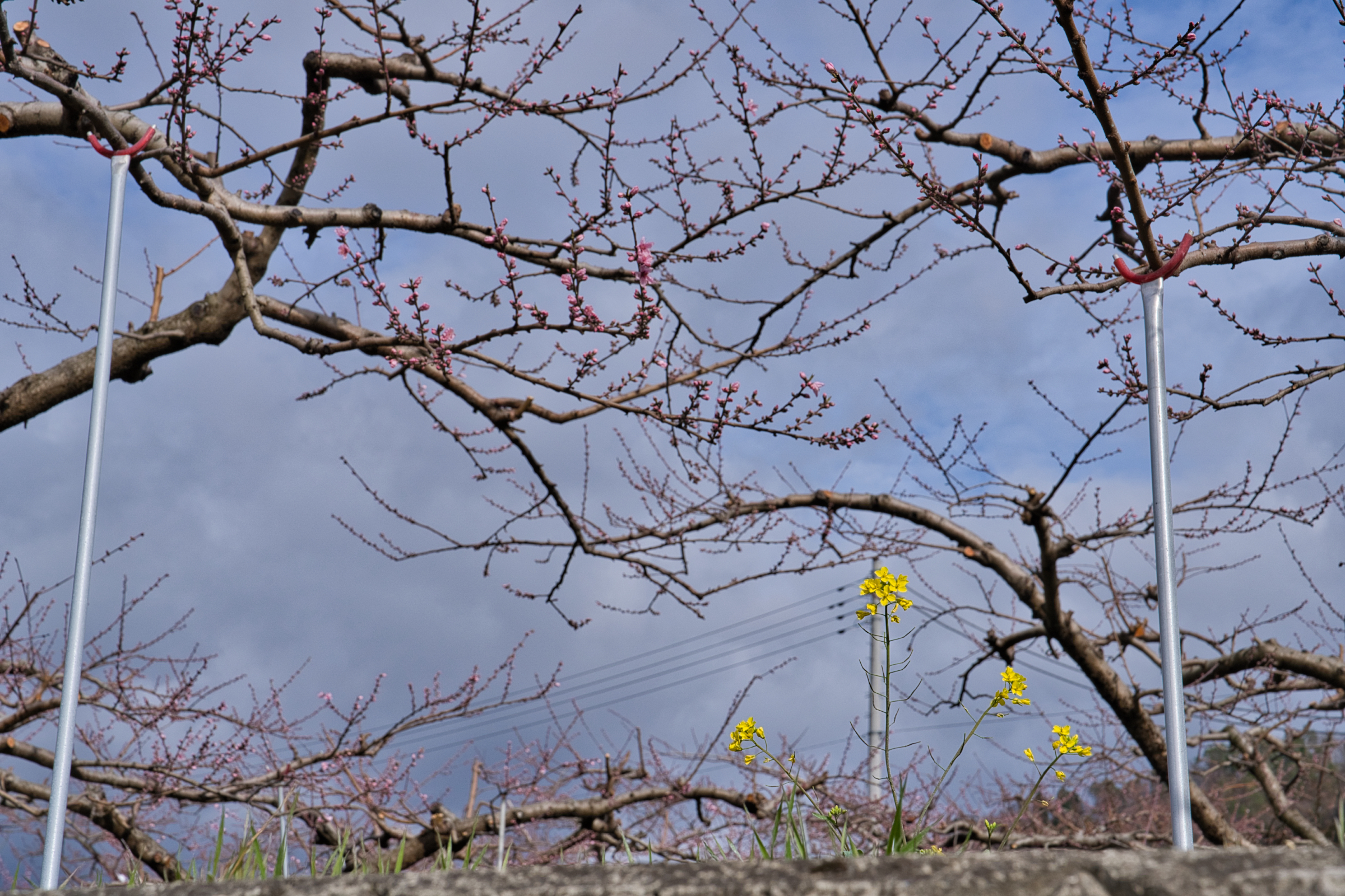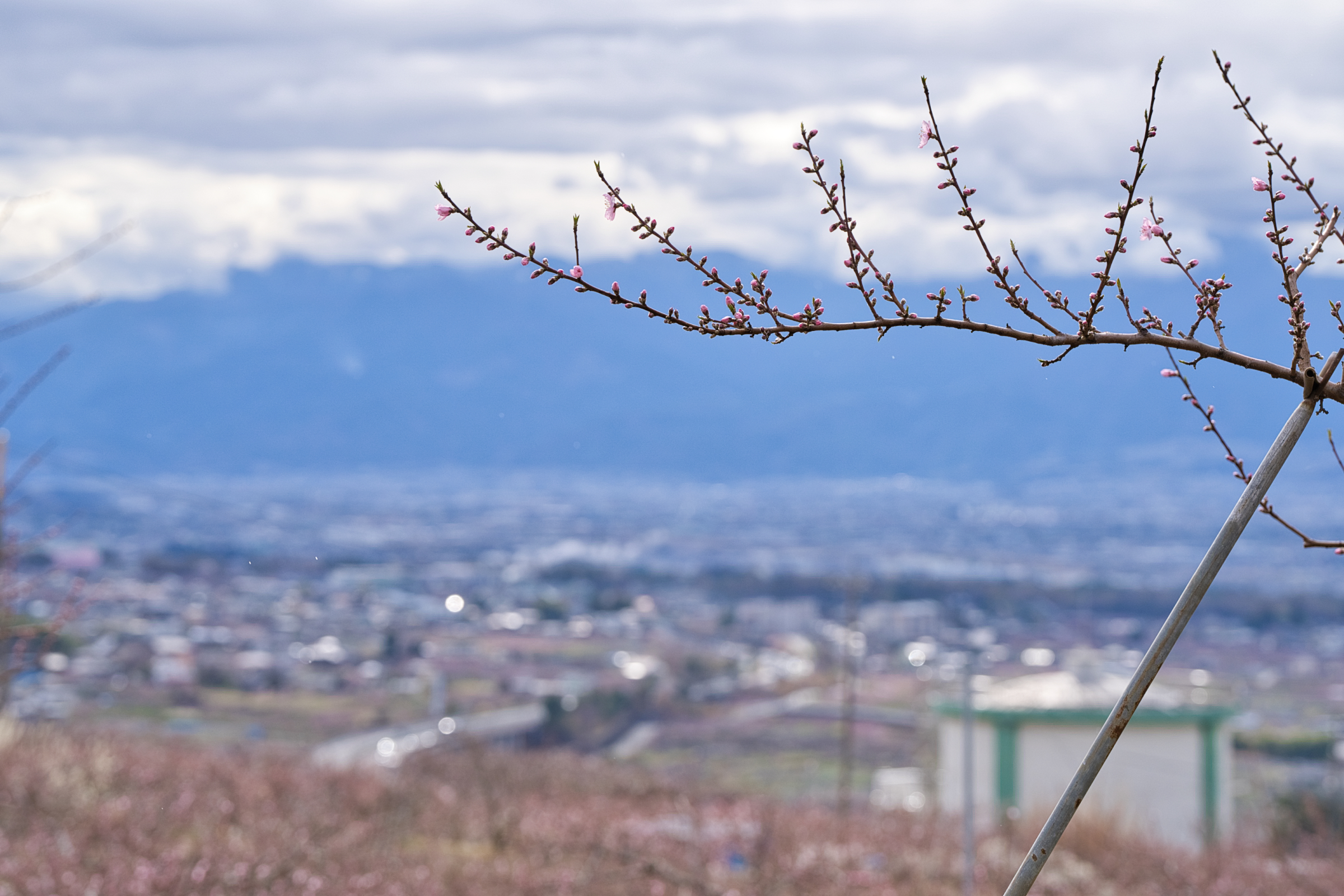 笛吹市一宮町釈迦堂周辺、今季1回目の桃の開花情報です。場所的には釈迦堂博物館の裏手を上がった付近の農道が通る付近です。中央自動車道の釈迦堂SA(下り線)から徒歩でSA左上に建つ釈迦堂博物館へ出られるので、高速で甲府方面へ向かう途中で立ち寄ることも可能です。博物館から、斜面を少し上がった辺りに見晴らしの良い場所が散策コースとなってあります。一般路からは博物館駐車場と臨時駐車場もありますがそれほど広くはないので、ピーク時は早い時間か夕方が良いかもしれません。さて、現在の開花状況的には平均的には蕾〜咲き始めといった感じで、一部の若木などで咲き始めています。見事的には来週に入ってからだと思いますが、今週末は鑑賞にはまだ早い状況です。