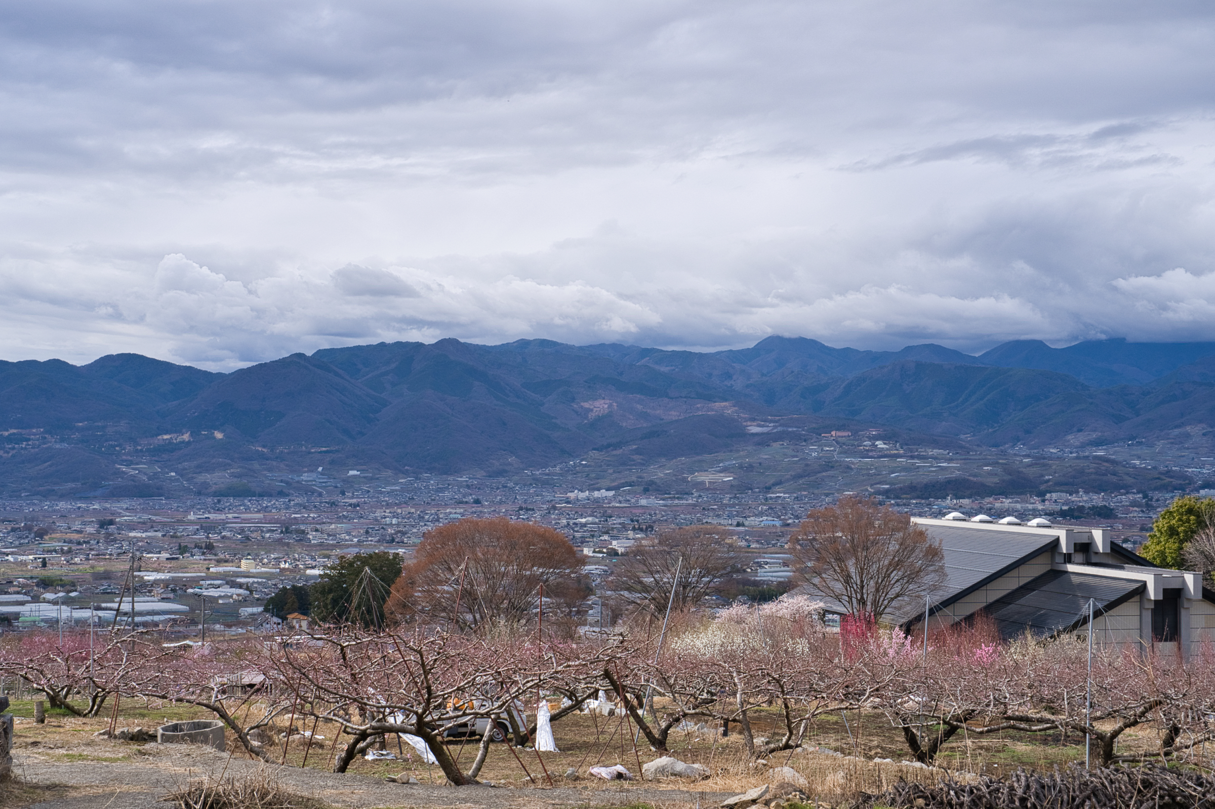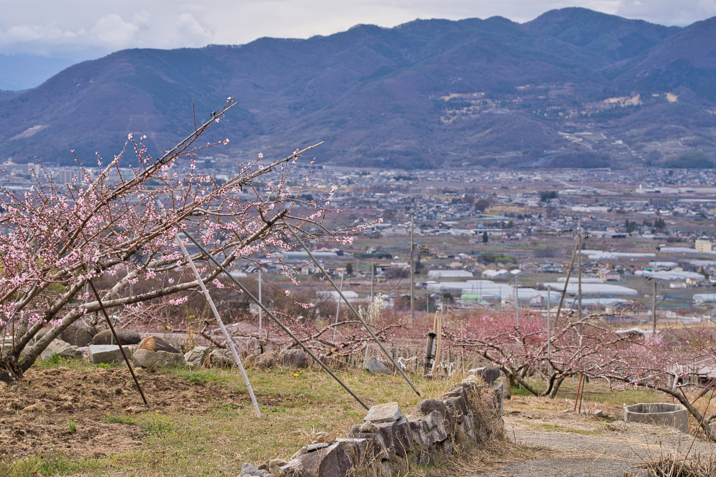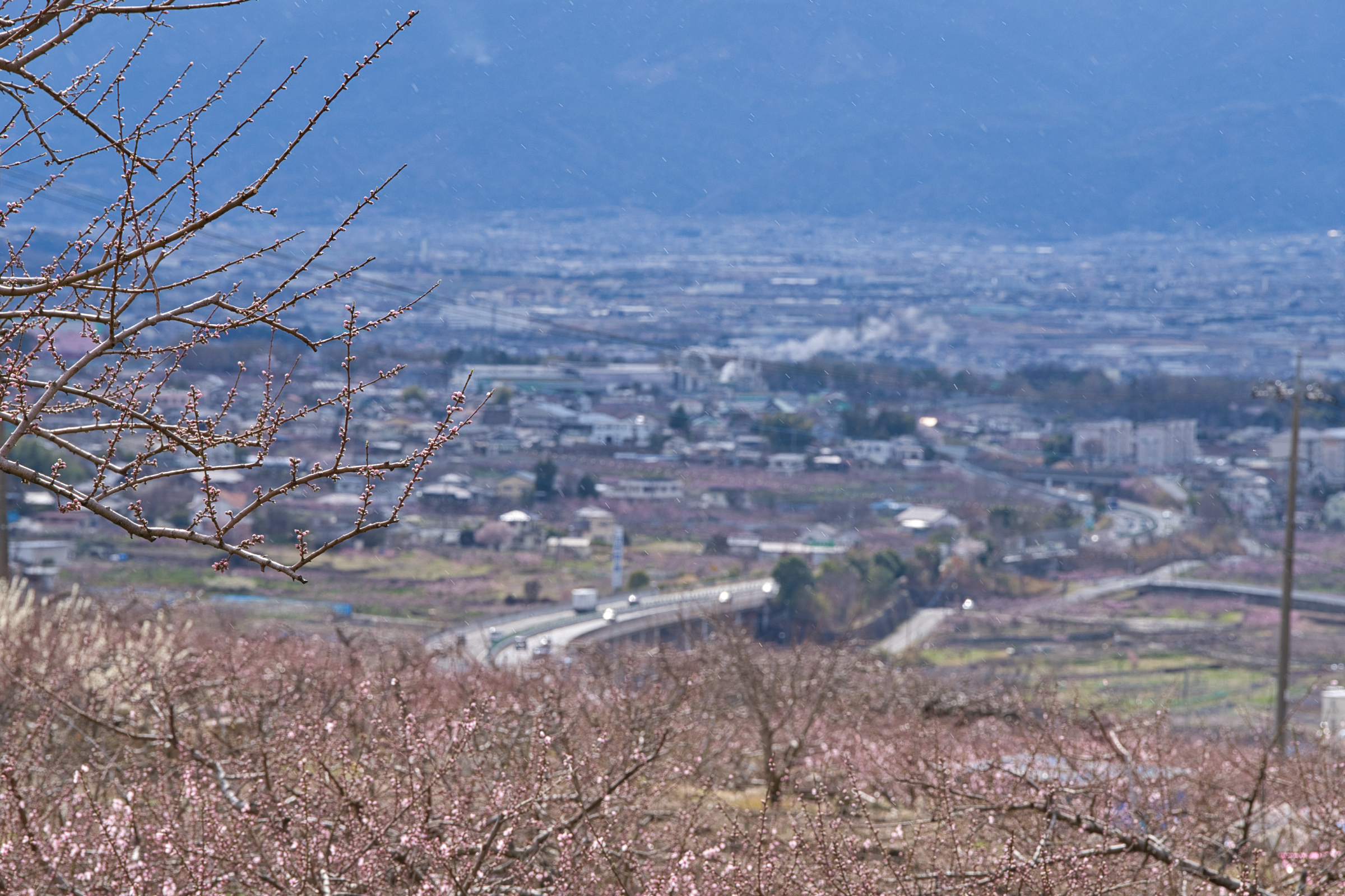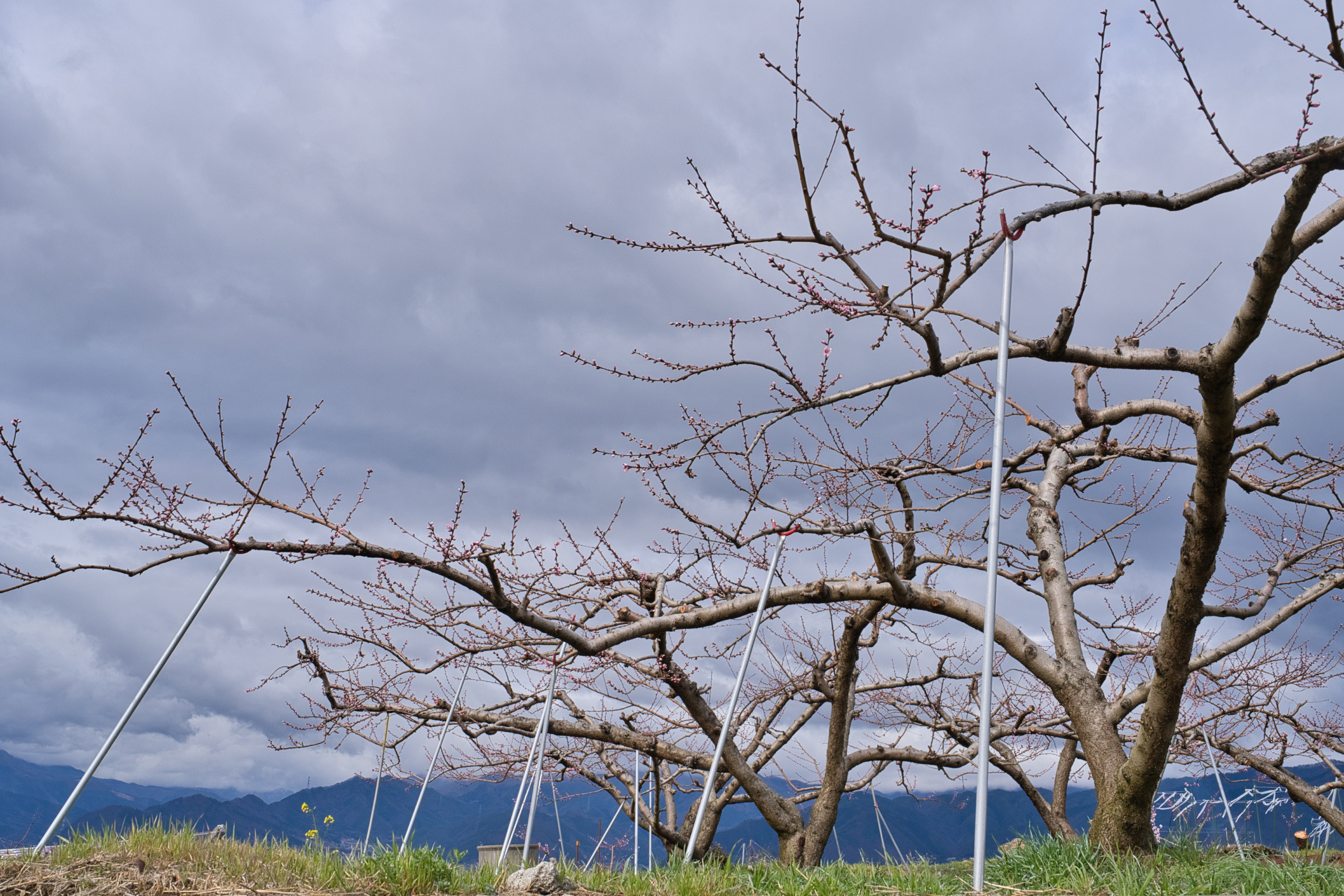 笛吹市一宮町釈迦堂周辺、今季1回目の桃の開花情報です。場所的には釈迦堂博物館の裏手を上がった付近の農道が通る付近です。中央自動車道の釈迦堂SA(下り線)から徒歩でSA左上に建つ釈迦堂博物館へ出られるので、高速で甲府方面へ向かう途中で立ち寄ることも可能です。博物館から、斜面を少し上がった辺りに見晴らしの良い場所が散策コースとなってあります。一般路からは博物館駐車場と臨時駐車場もありますがそれほど広くはないので、ピーク時は早い時間か夕方が良いかもしれません。さて、現在の開花状況的には平均的には蕾〜咲き始めといった感じで、一部の若木などで咲き始めています。見事的には来週に入ってからだと思いますが、今週末は鑑賞にはまだ早い状況です。