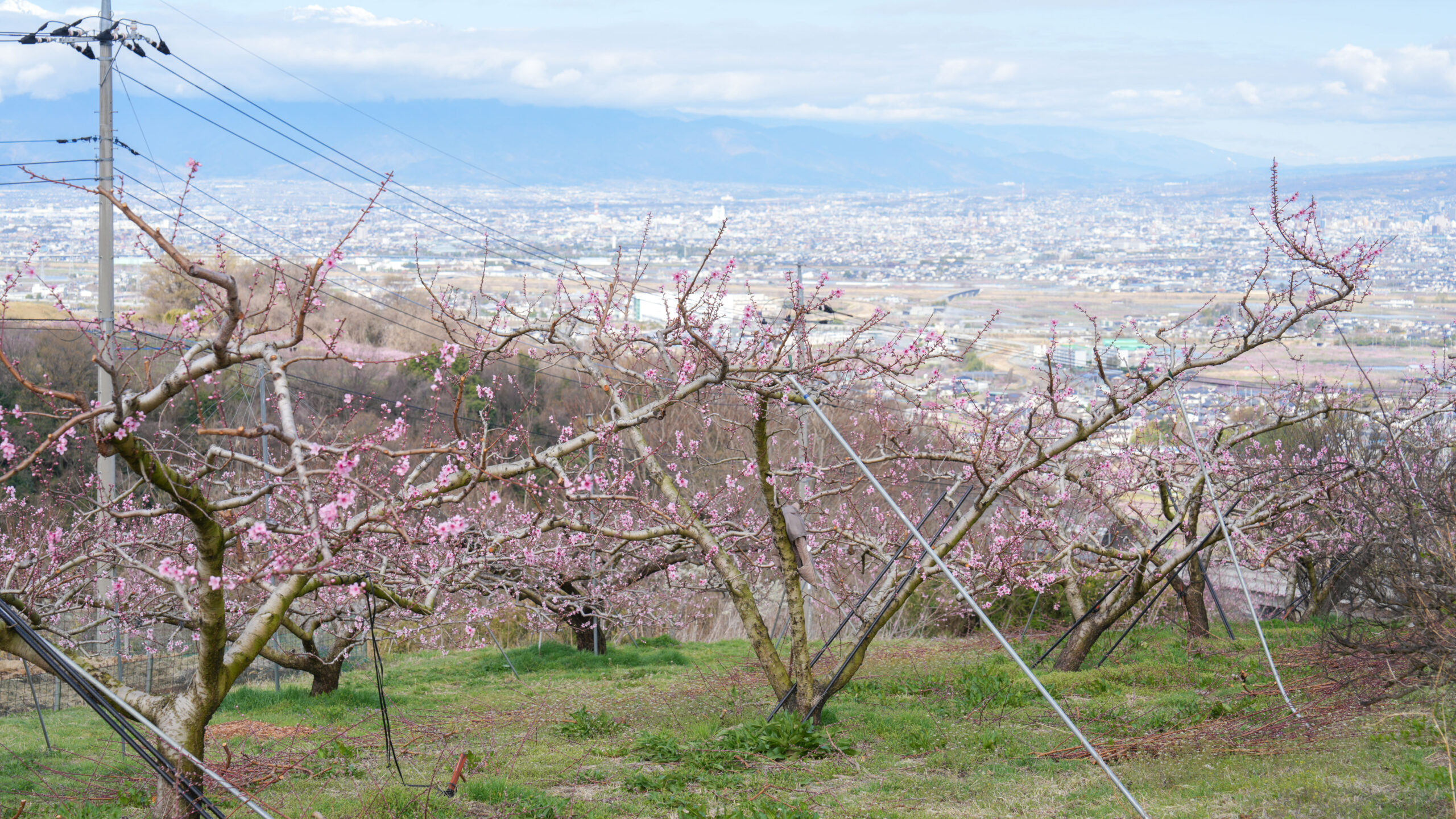 ふるさと公園の桃の花は蕾もふっくらし開花も進んでピンク色が目立ってきています。満開まであと少しといったところです。週末も気温が高くなり、順調に開花が進みそうです。一方、桜は満開となり見頃を迎えておりますので、一緒にお花見を楽しんでいただけたらと思います。晴れた日には南アルプスも見えて絶景ポイントとなります。