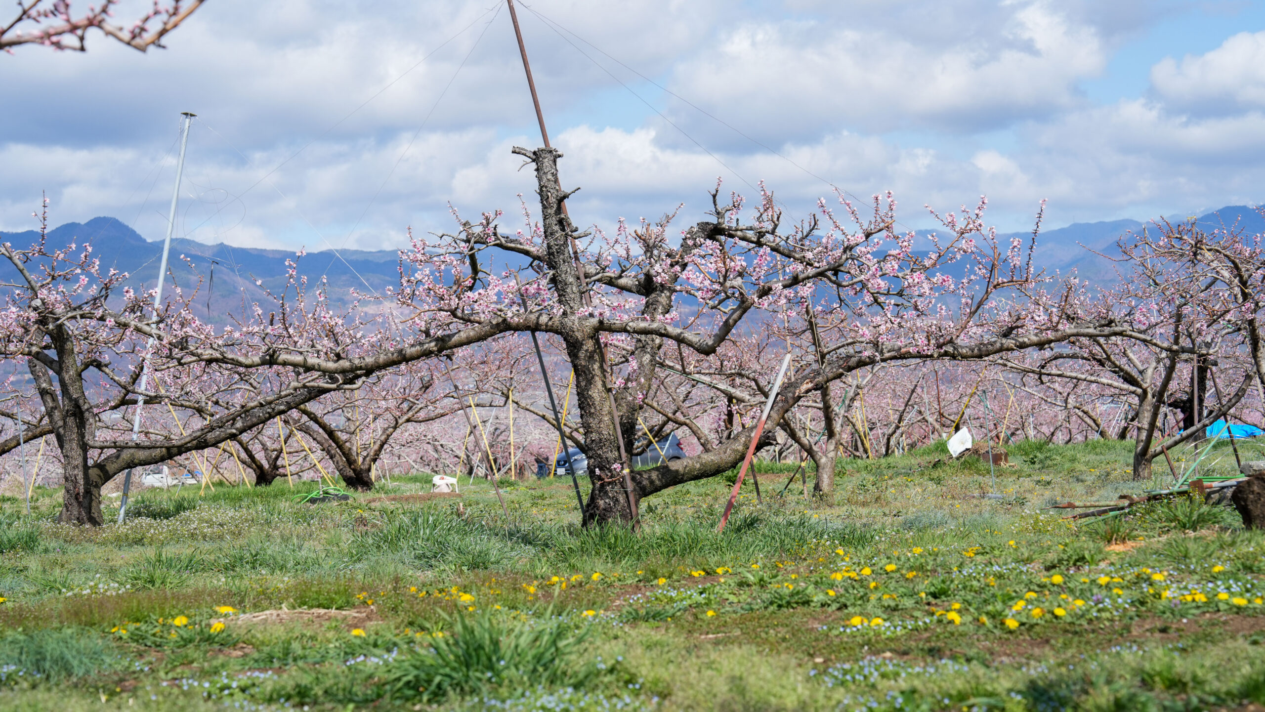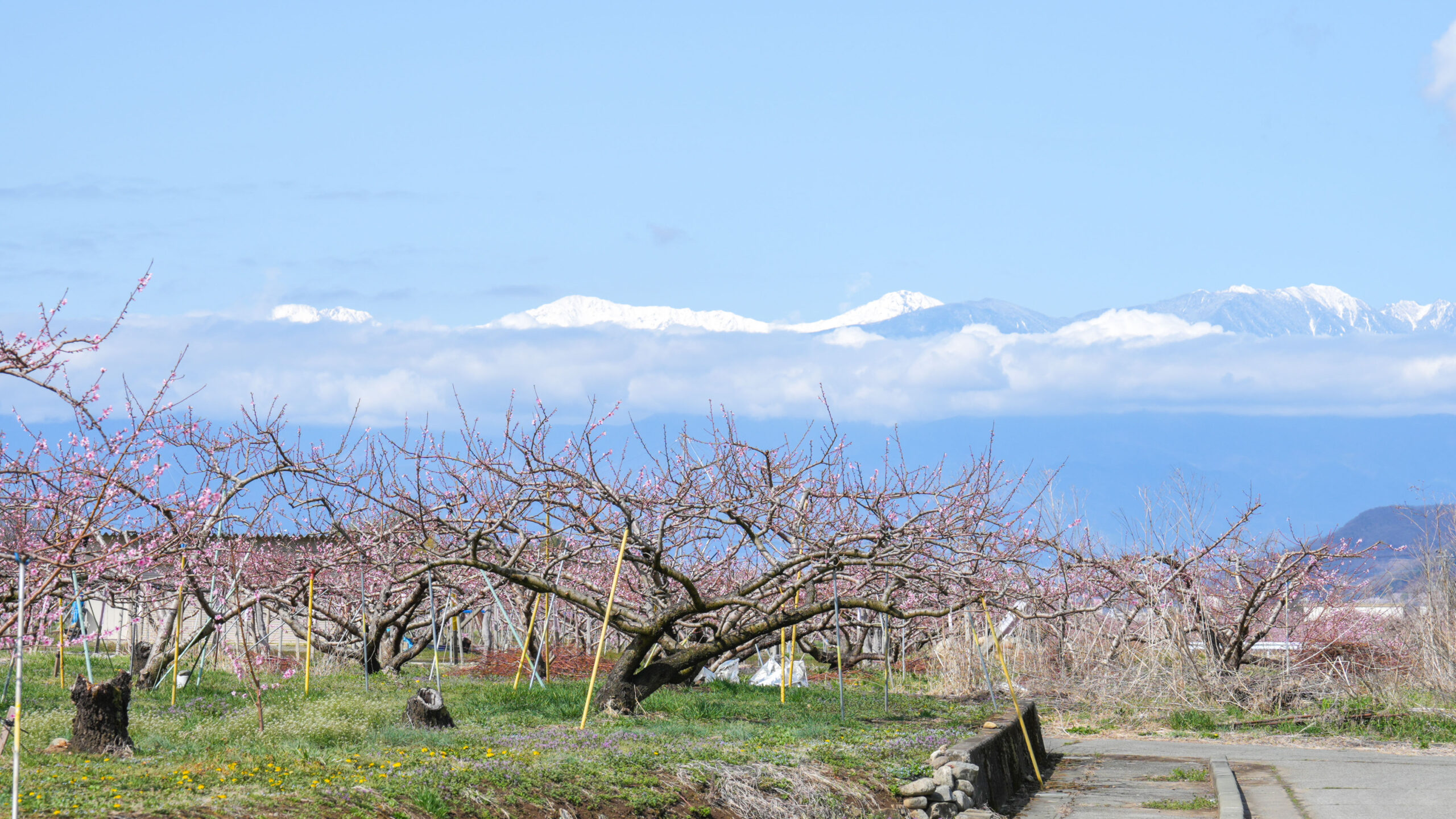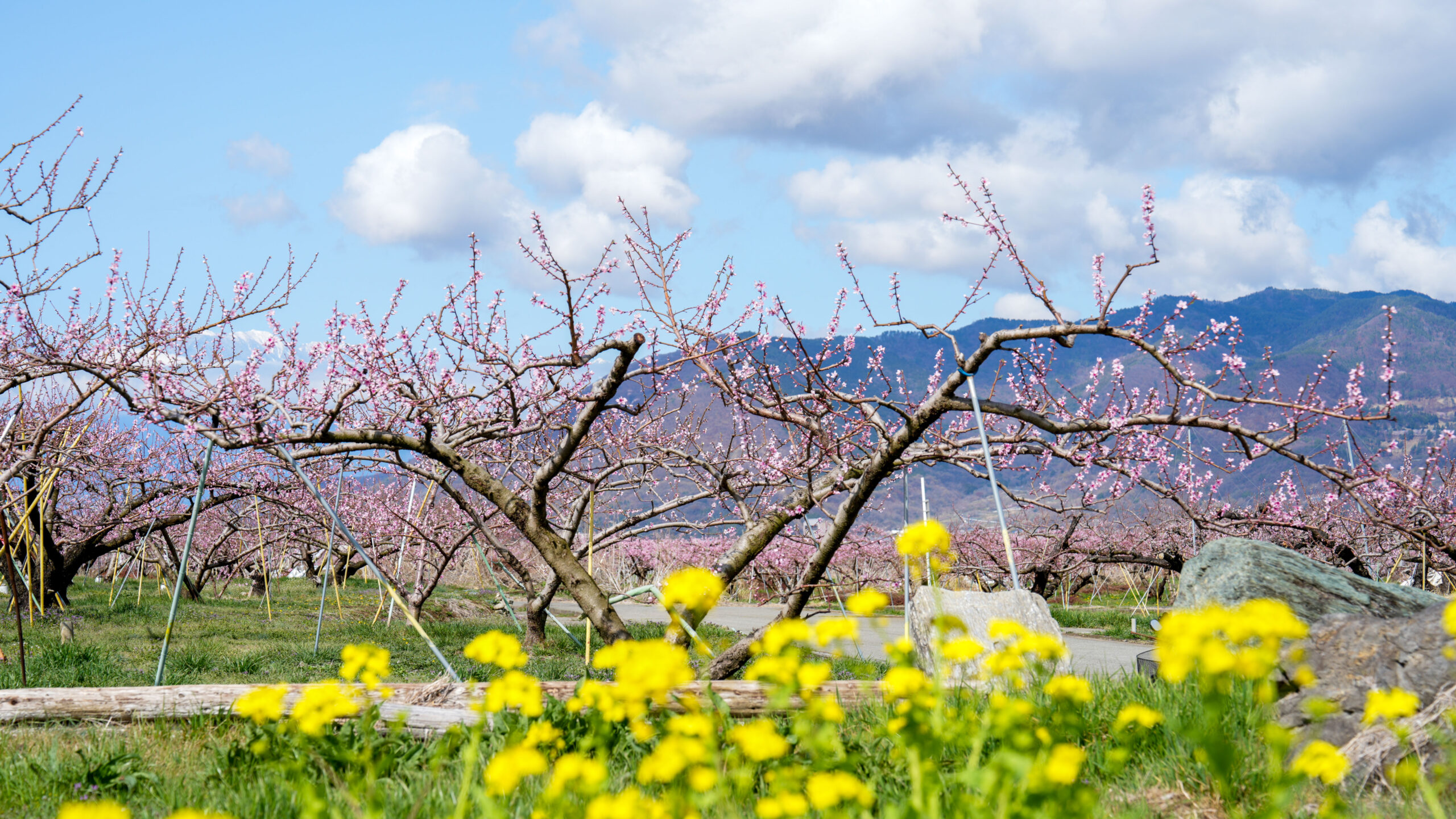 2026年シーズン第1回目の更新となります。このエリアは桃の里スポーツ公園を通り過ぎてすぐのところです。ここは見晴らしがよく南アルプスを一望できます。菜の花も咲いており桃の花と一緒にお楽しみいただけます。さて、桃の花の咲き具合いですが、暖かい気候が続いたため今にも花開きそうなふっくらとした蕾がほとんどで、あと少しで見頃を迎えそうです。