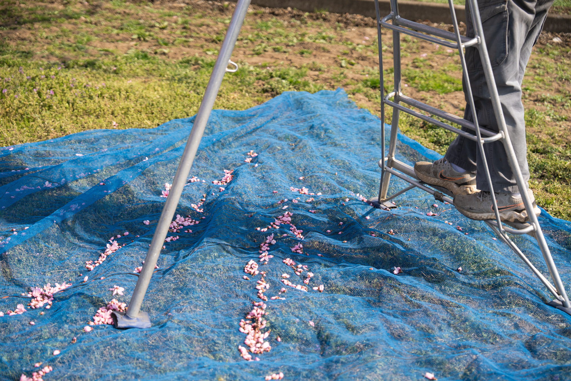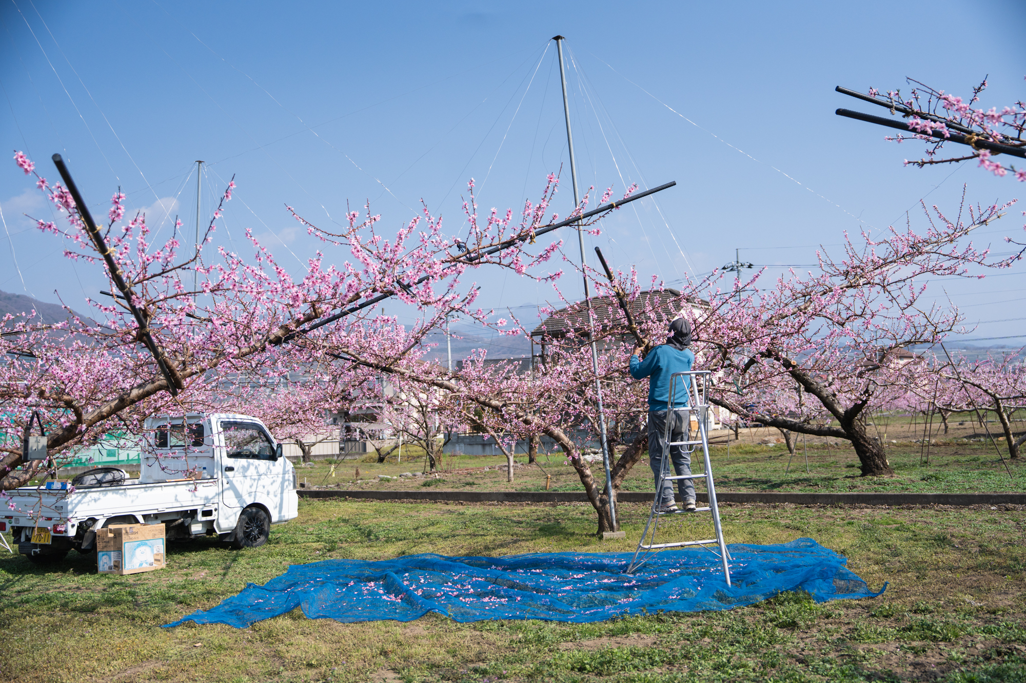 晴天となった第8回目、春日居地区の桃の花の開花状況です。お天気にも恵まれ、春日居町駅前の桃畑では花粉採取の作業が盛んに行われていました。この一週間は、桃の収穫にとっても大切な時期となりそうです。