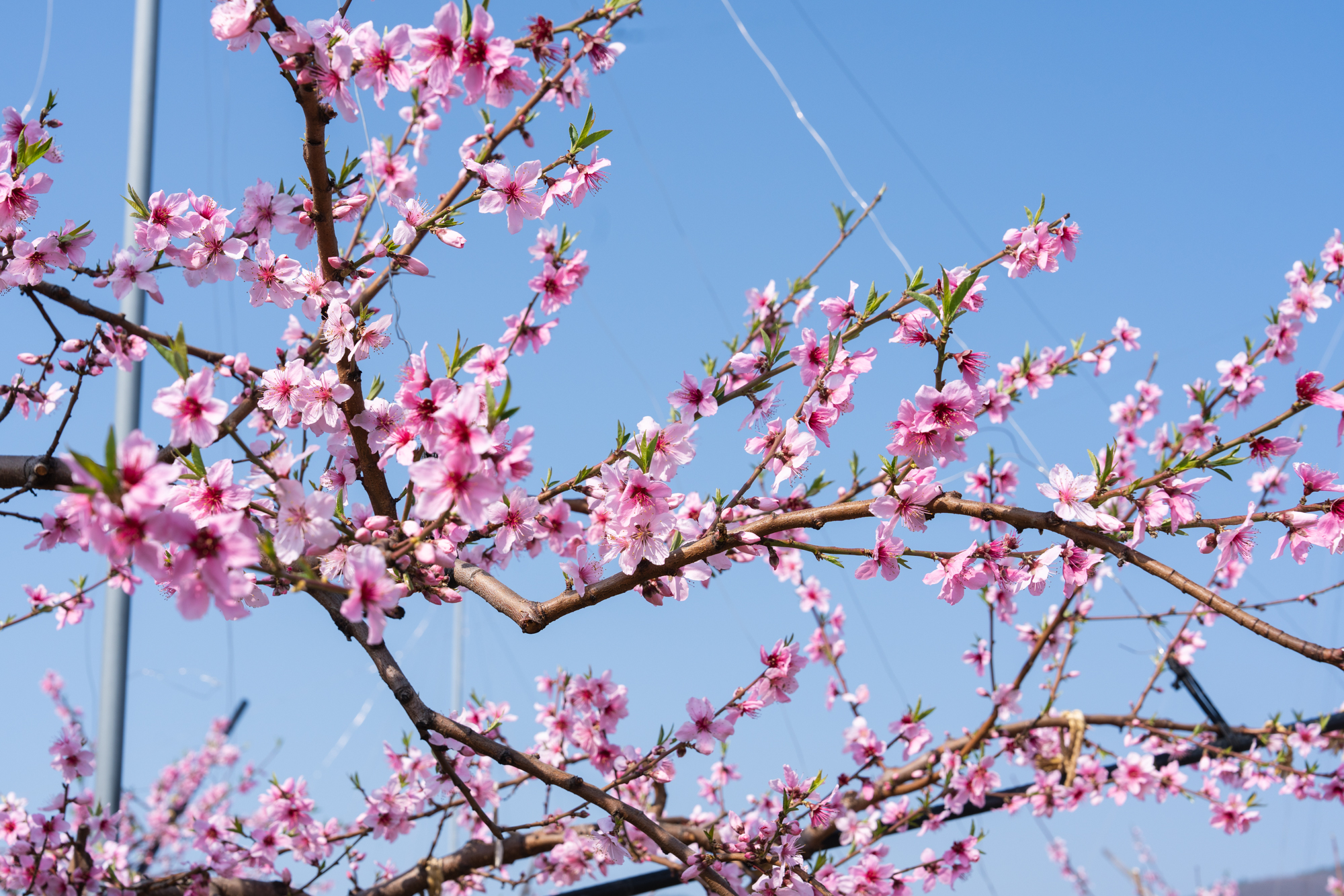 さて、桃の花の進み具合ですが、ピーチライン沿いよりも春日居町駅前のほうがやや早く進んでいる様子です。徐々に新芽が出始めている木もあり、見頃を迎えた木も増え、全体的にピンク色がより一層鮮やかになってきました。
