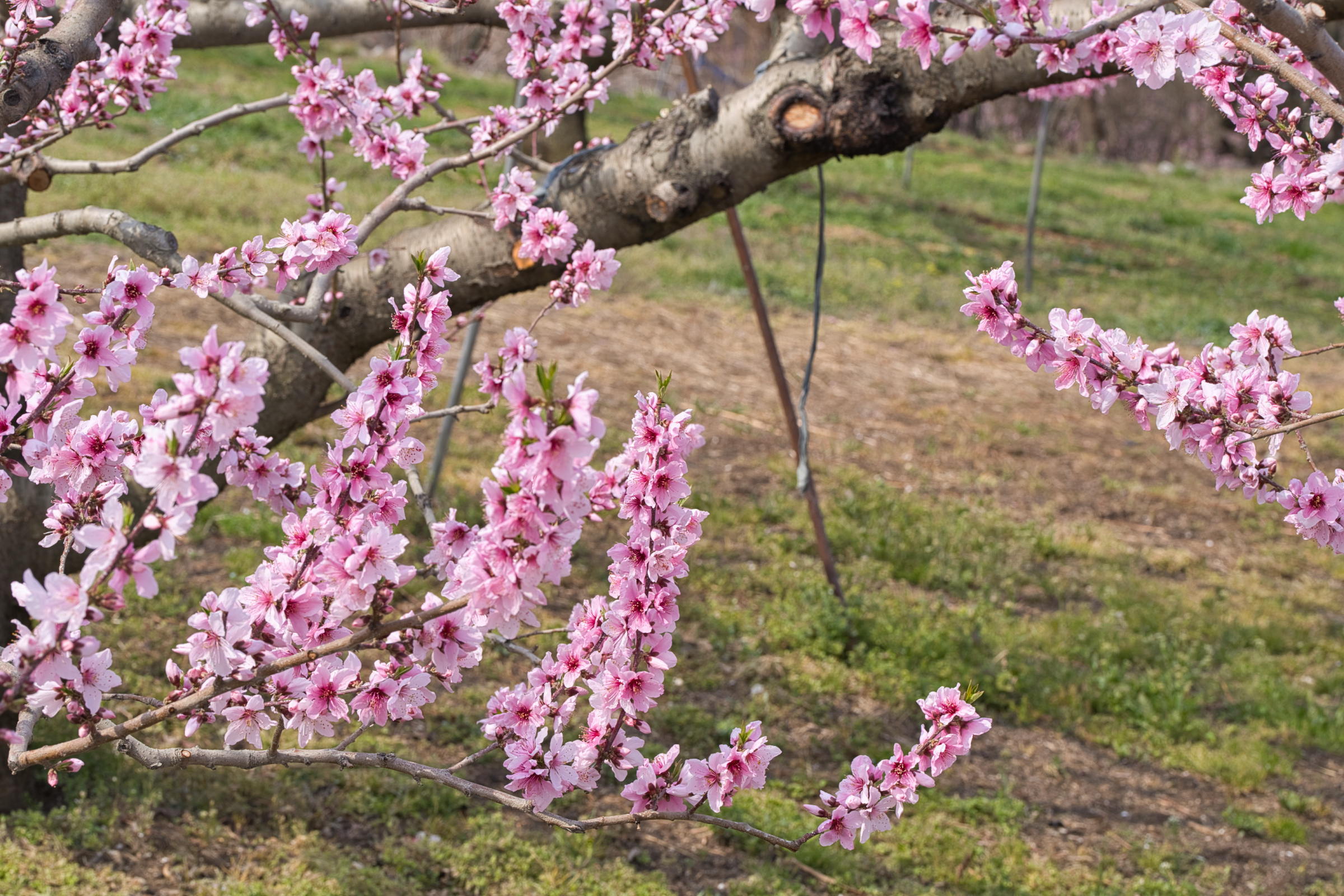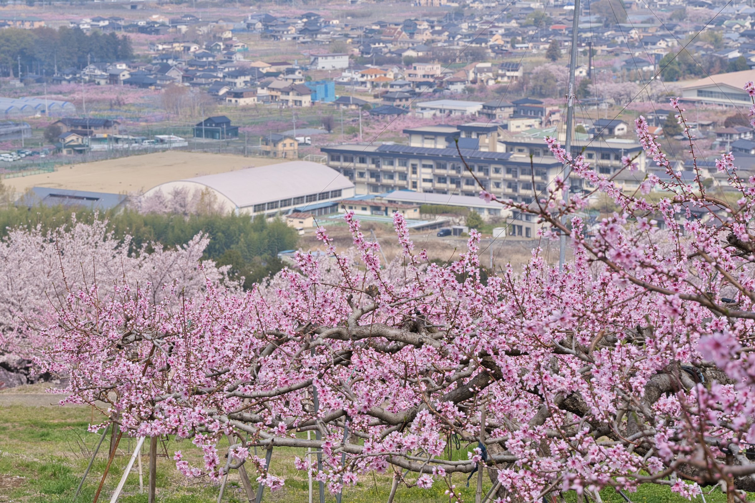 ふるさと公園周辺の桃の開花情報です。甲州蚕影桜をはじめ、園内の桜は満開を迎え(一部散り始めている木もあります)今、正にピーク状態です。そして、追いかけるように桃の花もようやく数日前から見頃となりギリギリ桜と桃の競演となりました。桃の開花状況的には、公園第一駐車場の道路側周辺〜甲州蚕影桜周辺の桃畑まで、品種や日当たりの具合で満開までには至っていませんが、7、8分咲き〜ほぼ満開といった感じです。明日は雨予報ですが、この雨で桃の花が散ることはなさそうですが、桜はなんとか保ちこたえて欲しいところです。