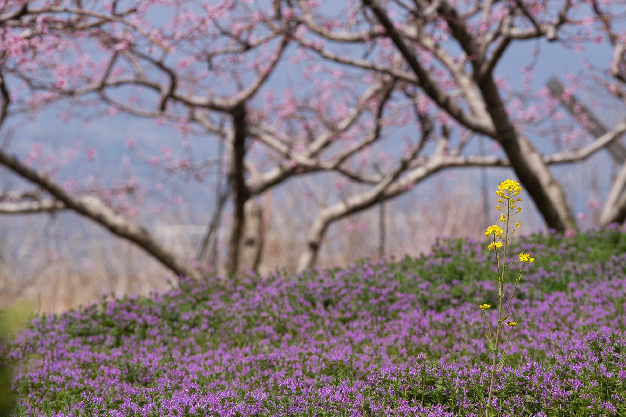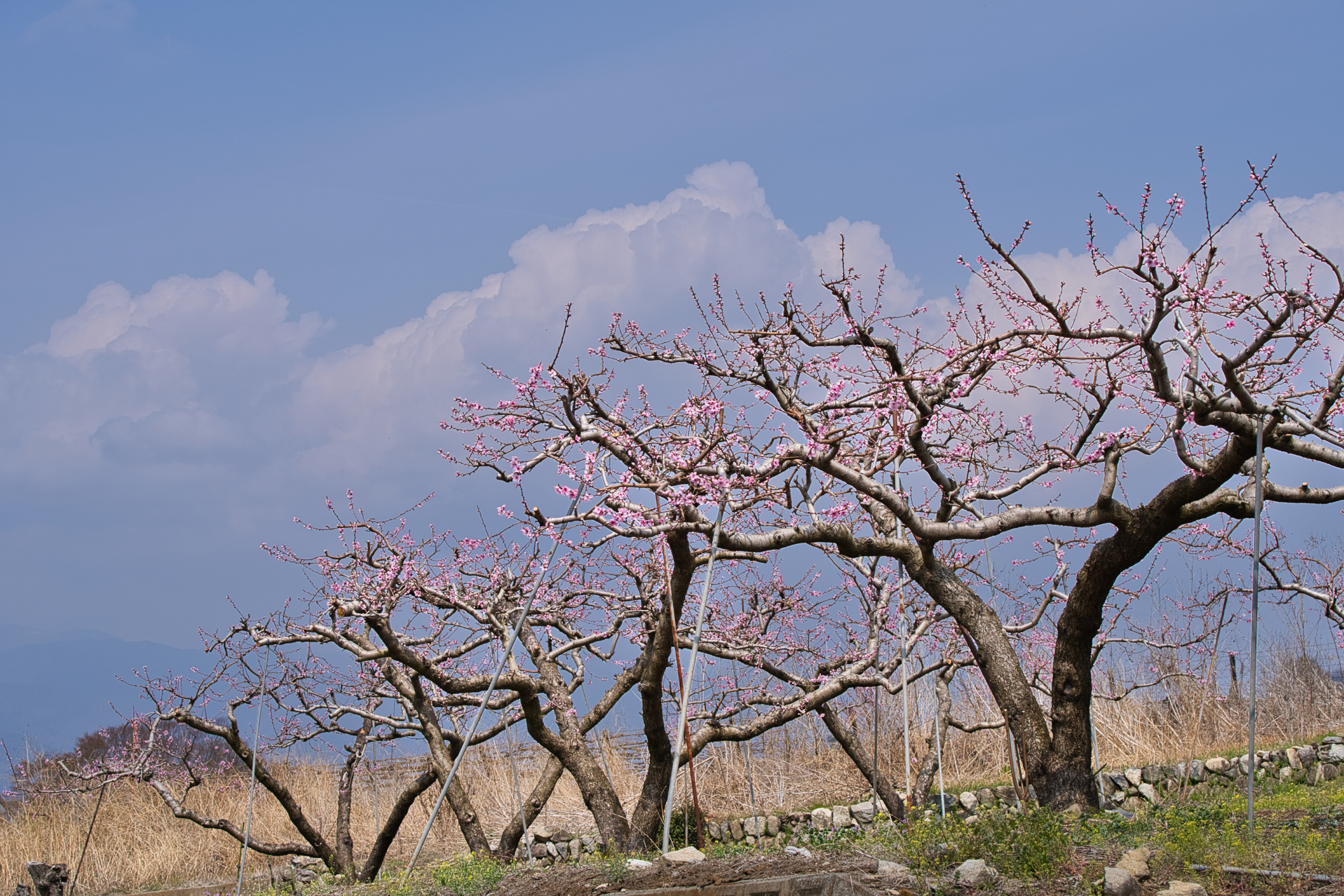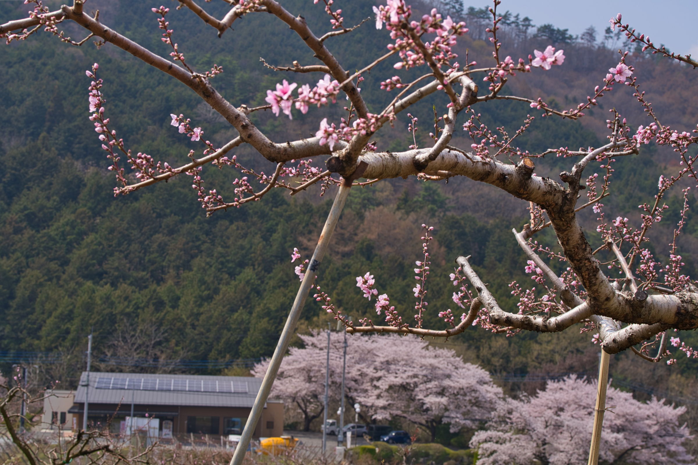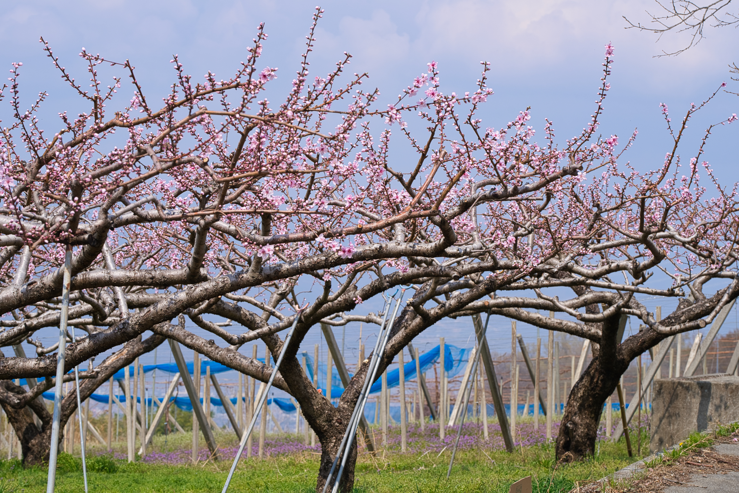 今日撮影の場所は「広済寺」さんの参道付近でしたが、こちらの場所は花鳥山のバックボウルのような場所で、直接甲府盆地に向け大きく開けている場所ではありませんが、長閑で静かな昔ながらの集落エリアとでも言いましょうか、集落に入ると古いお蔵や民家、桃畑の堺の曲線に沿って植えられたチューリップ、そして「江戸屋」。店内には古い道具なども飾られていたり、こだわりの胡麻豆腐はもちろん、極めつけはやっぱり女将。踊るほうとう学校の絶校長!さんです。是非尋ねてみてください。ほうとうも絶品ですし、お食事を楽しんでから、ゆっくりとお花見を満喫してみてはいかがでしょうか。また、車は「浅川砂防公園」に停めて、景色を眺めながらのんびりと散策するのもおすすめのルートです。