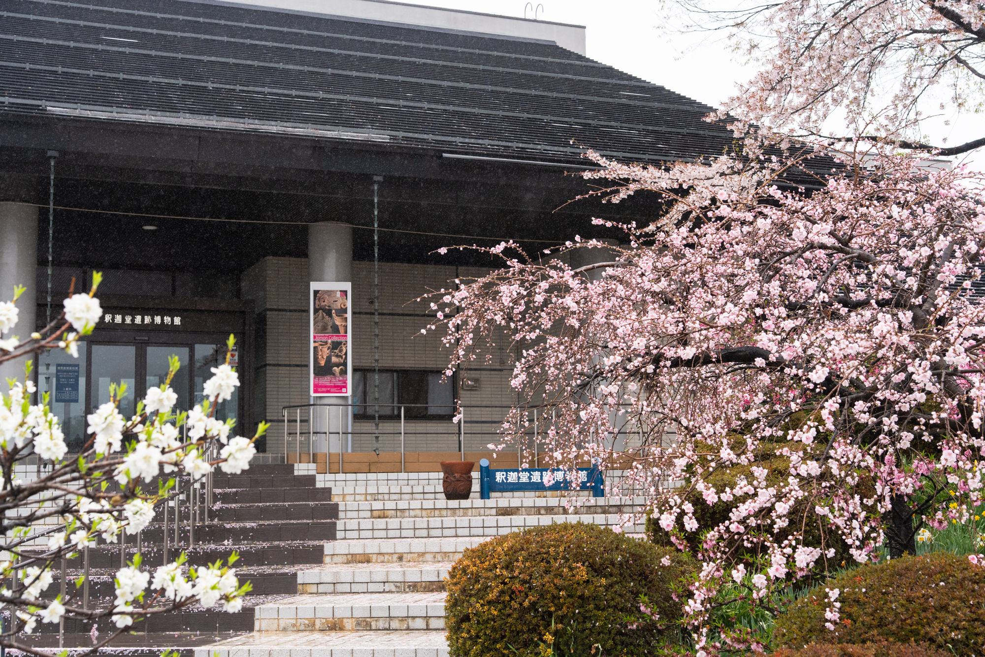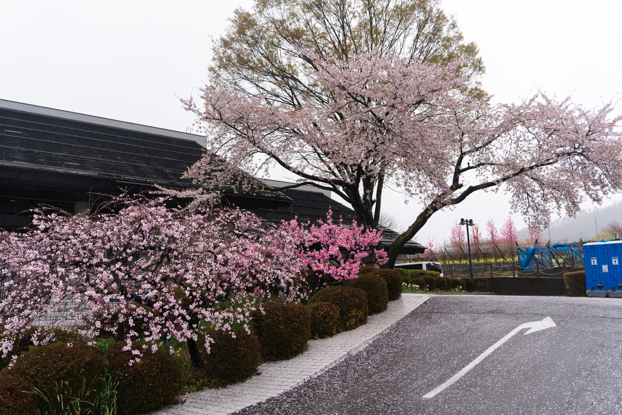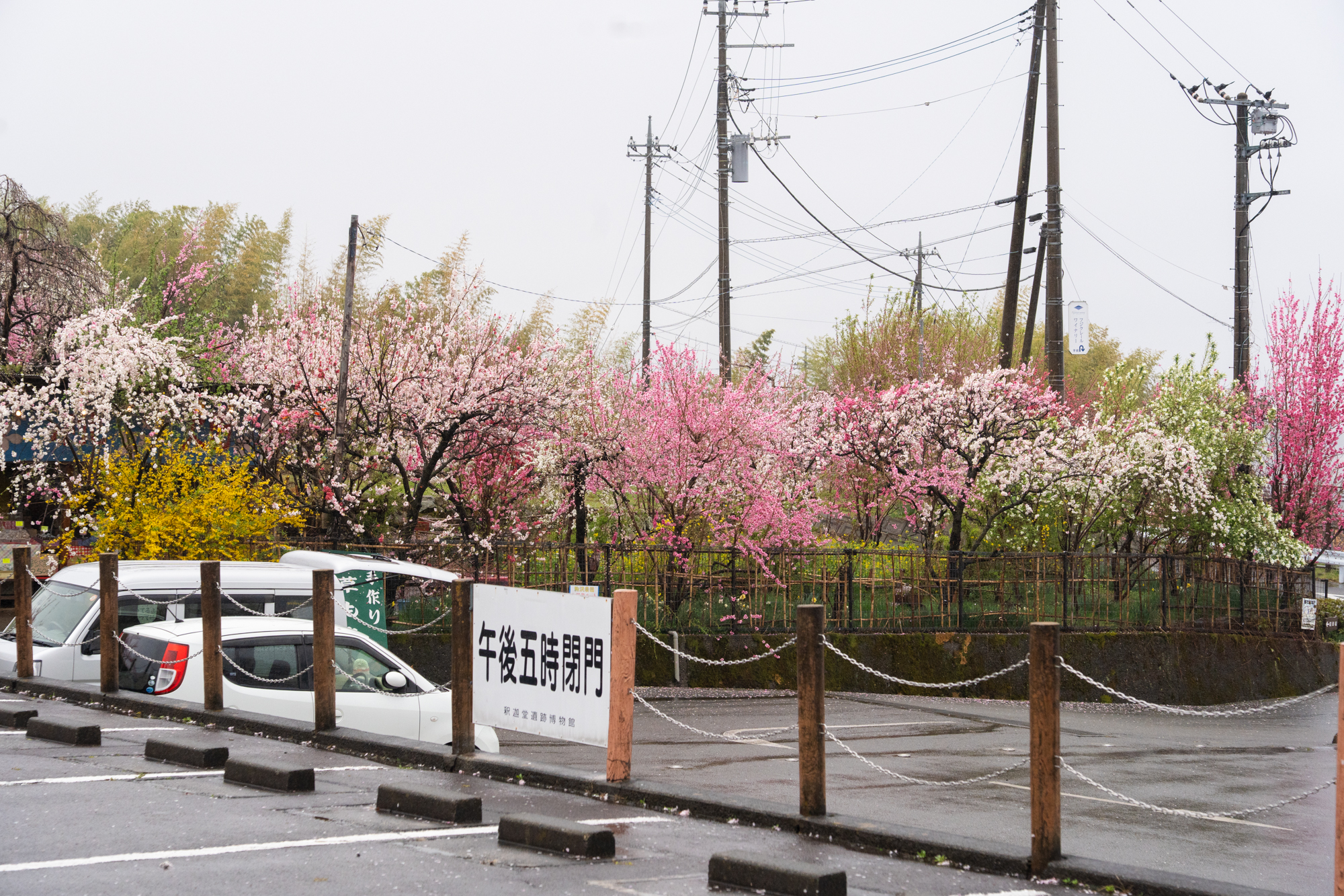 小雨の中での観測となった、第5回目の釈迦堂周辺の桃の開花情報です。釈迦堂遺跡博物館前の桃は、ピークを過ぎてやや落ち着いた様子となっています。そこから少し上がった散策路周辺では、全体としてはこれから見頃を迎える段階ですが、種類によっては満開を過ぎ、新芽の緑が見え始めている木もあります。