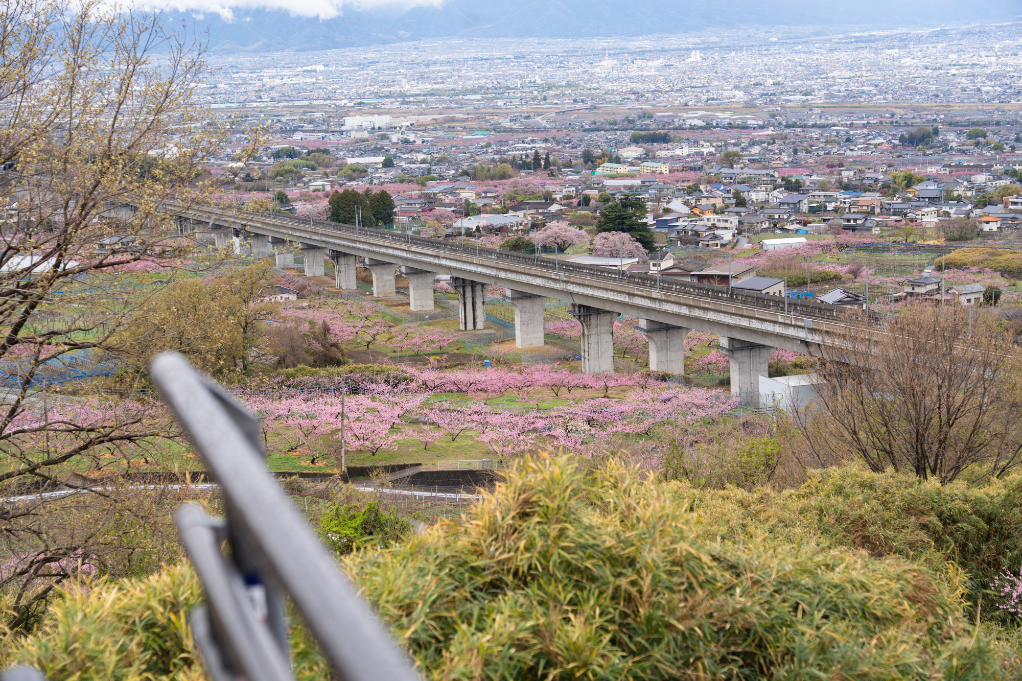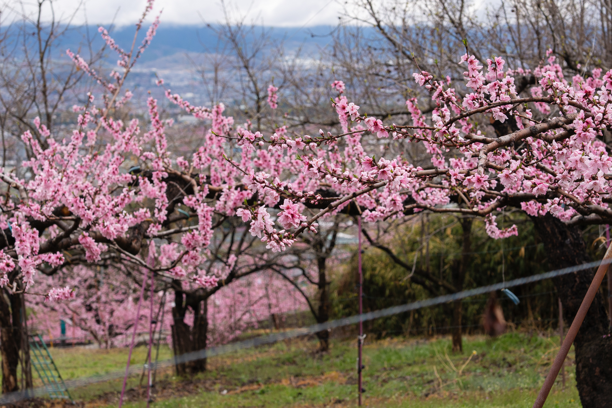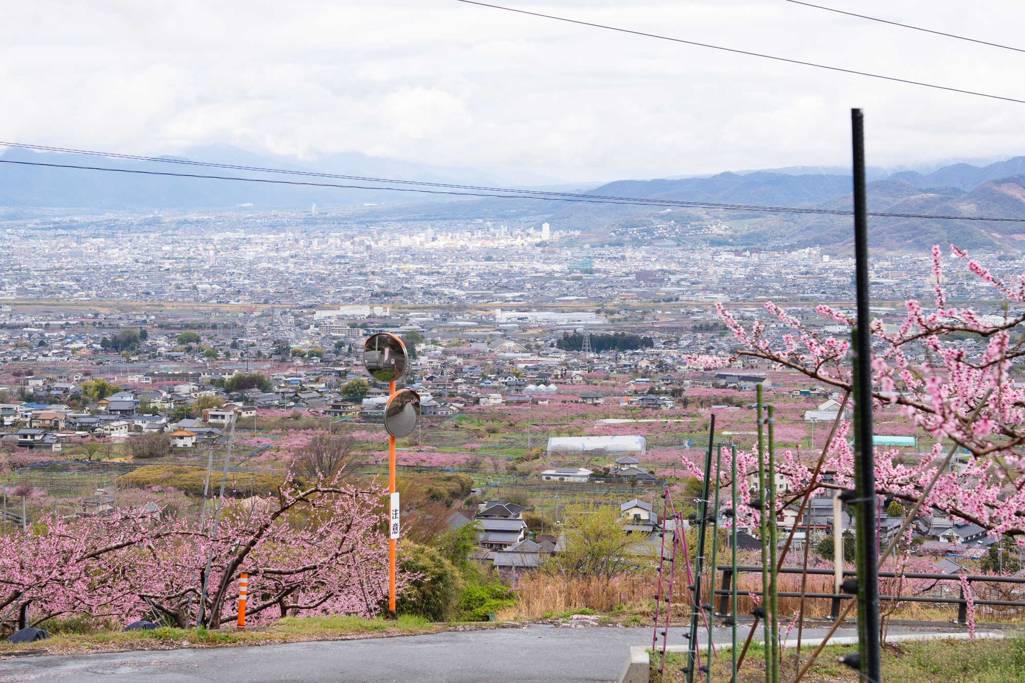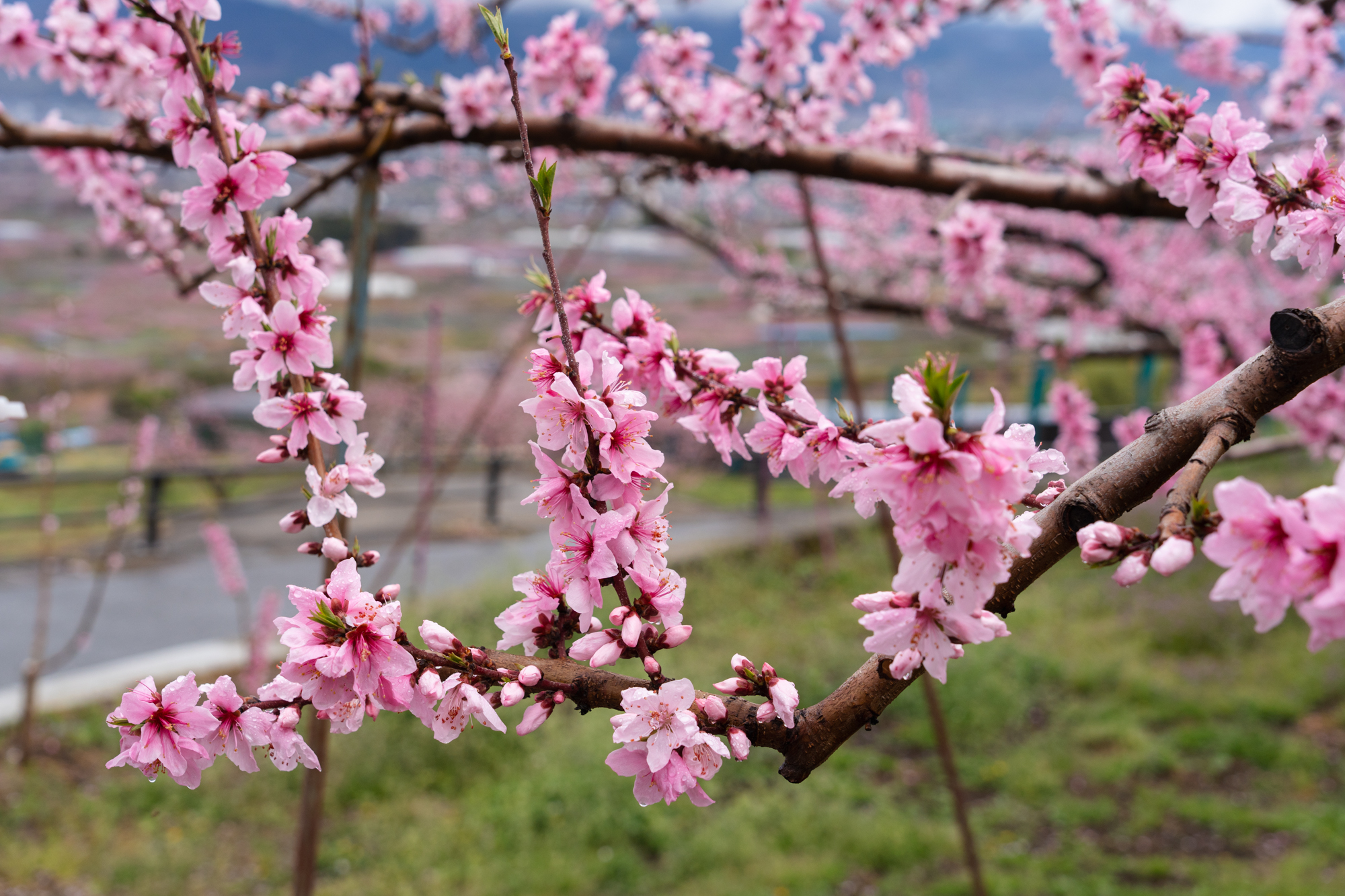 中一日で訪れた御坂町花鳥山の桃の開花情報です。花鳥山周辺はもちろん、眼下に広がる景色も含めると、まさに今が見頃といえそうです。桜はすでにピークを過ぎましたが、笛吹市を一望できるこちら花鳥山には、引き続き多くの人が訪れています。