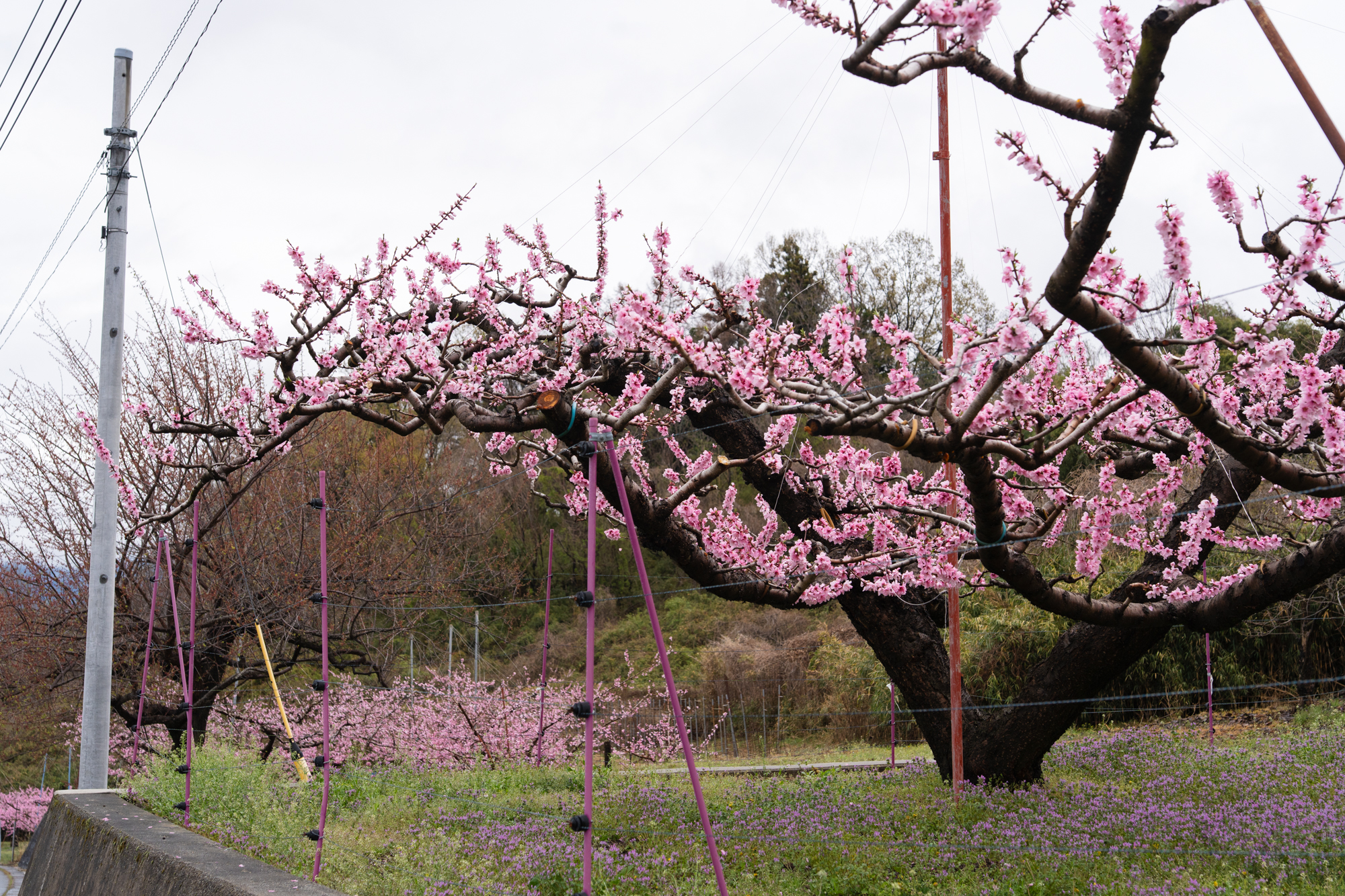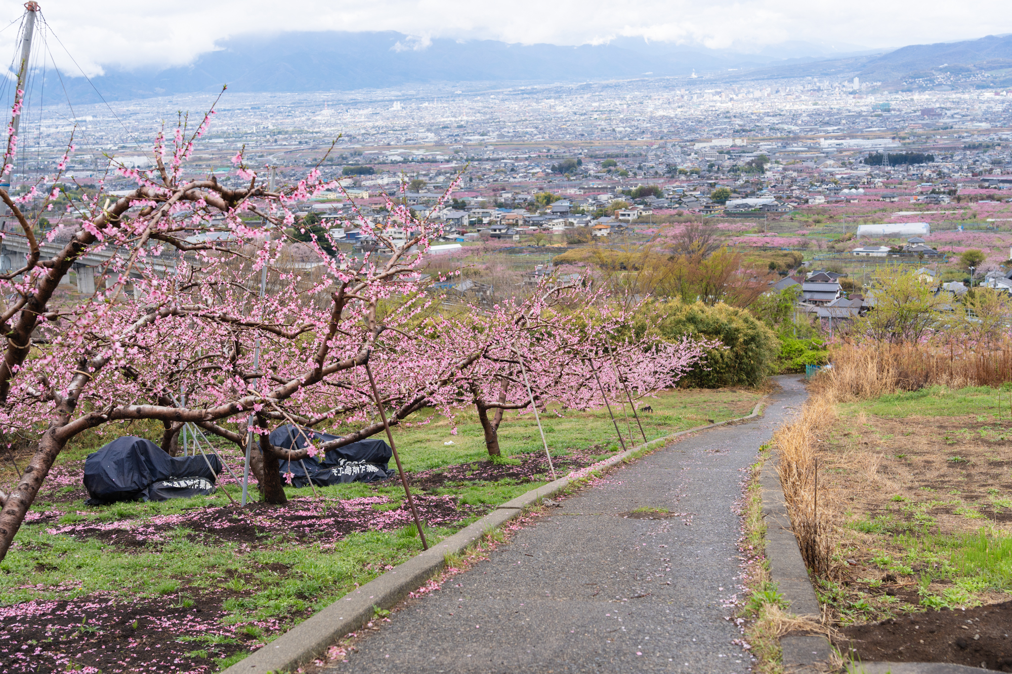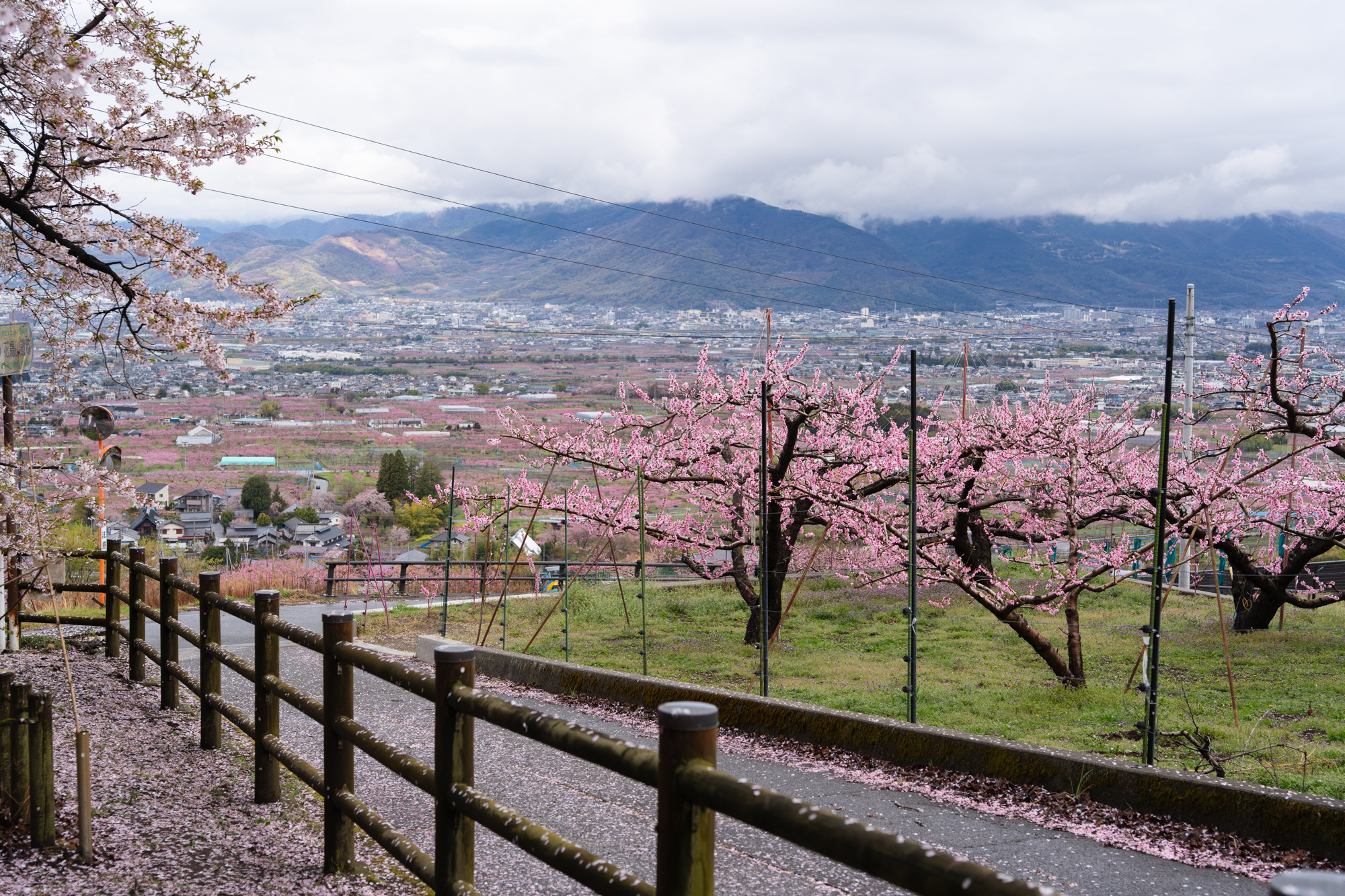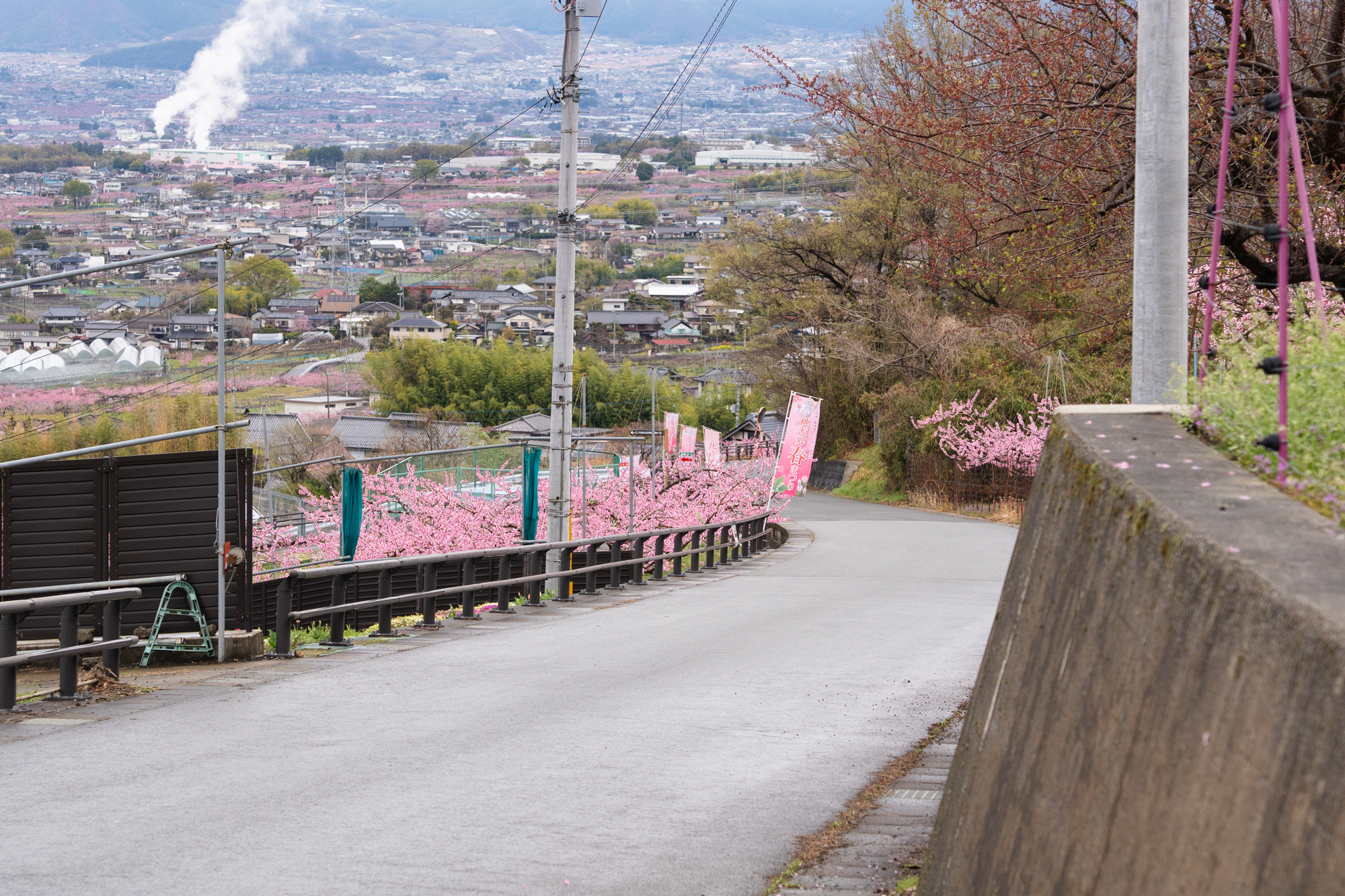 中一日で訪れた御坂町花鳥山の桃の開花情報です。花鳥山周辺はもちろん、眼下に広がる景色も含めると、まさに今が見頃といえそうです。桜はすでにピークを過ぎましたが、笛吹市を一望できるこちら花鳥山には、引き続き多くの人が訪れています。