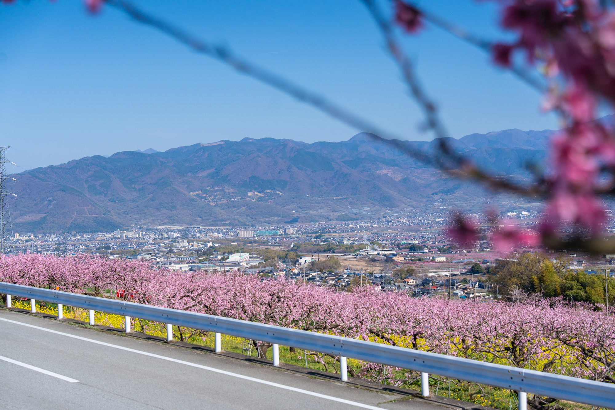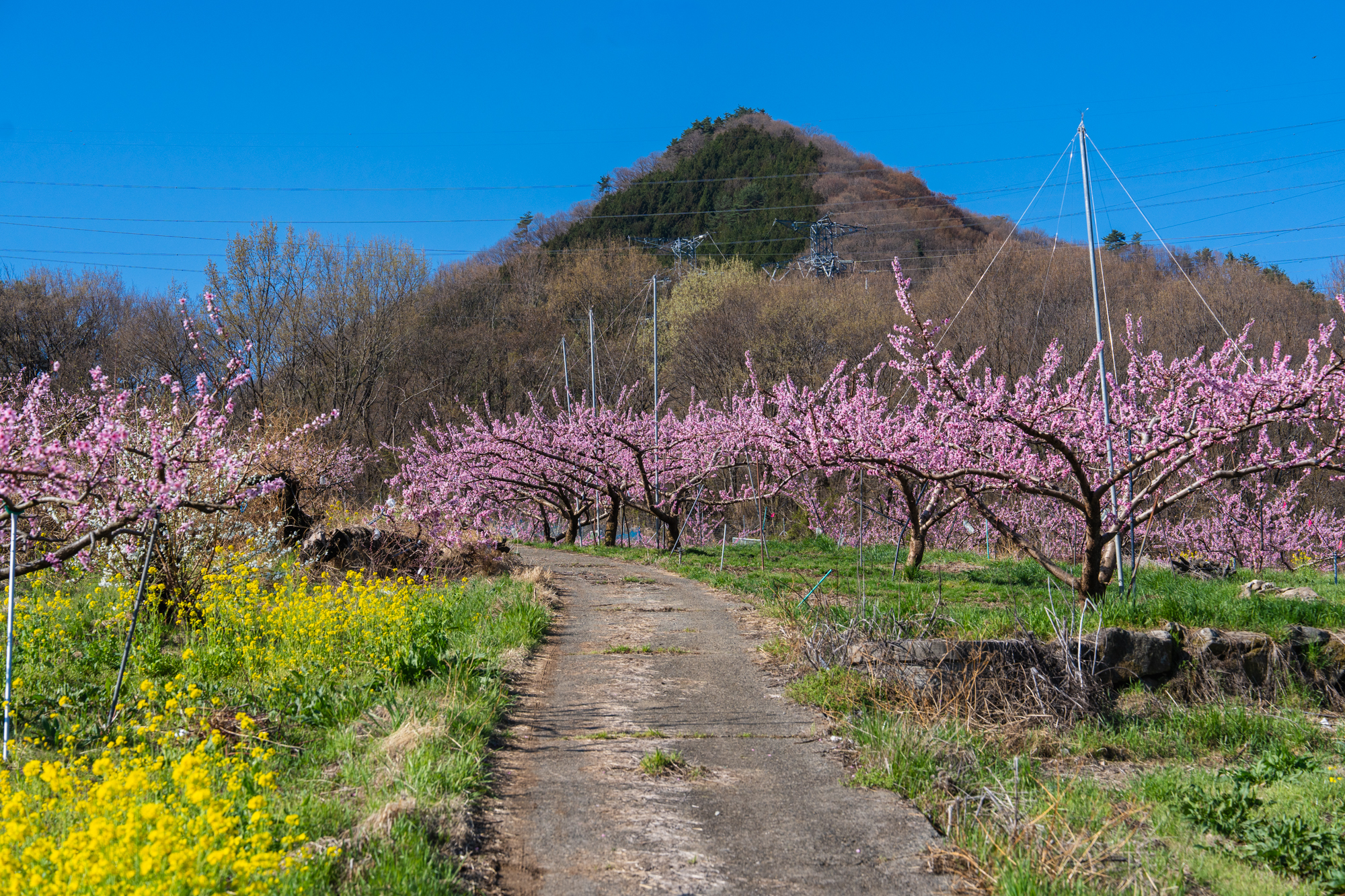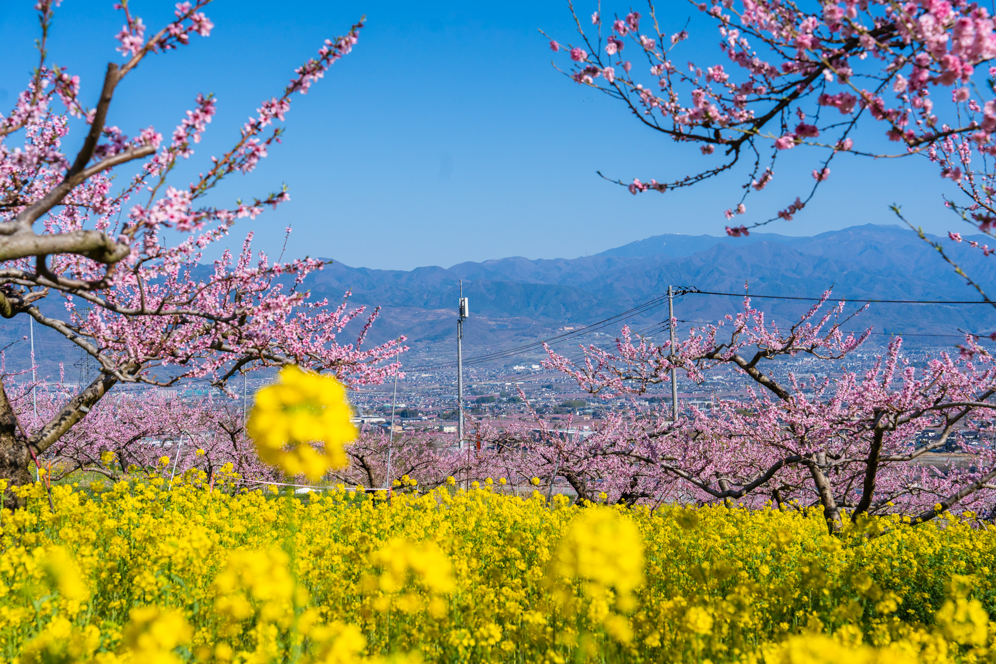 笛吹市御坂町には、甲府盆地や南アルプスを一望できる眺望の良い場所が各所に点在しています。中でもこちら黒駒地区は、桃の花と菜の花に囲まれながら散策を楽しめる、人気の高いスポットです。