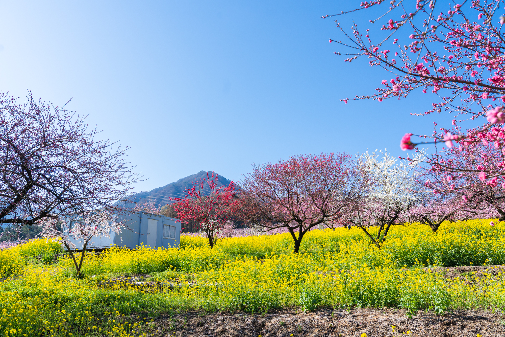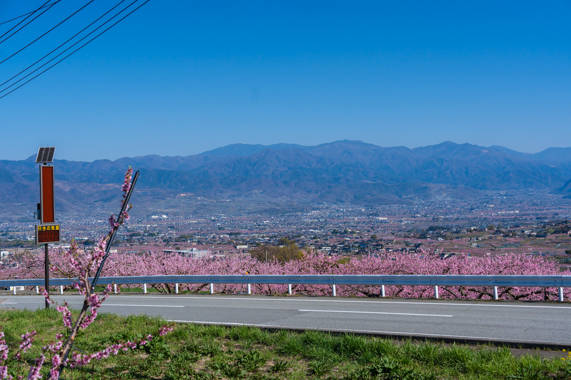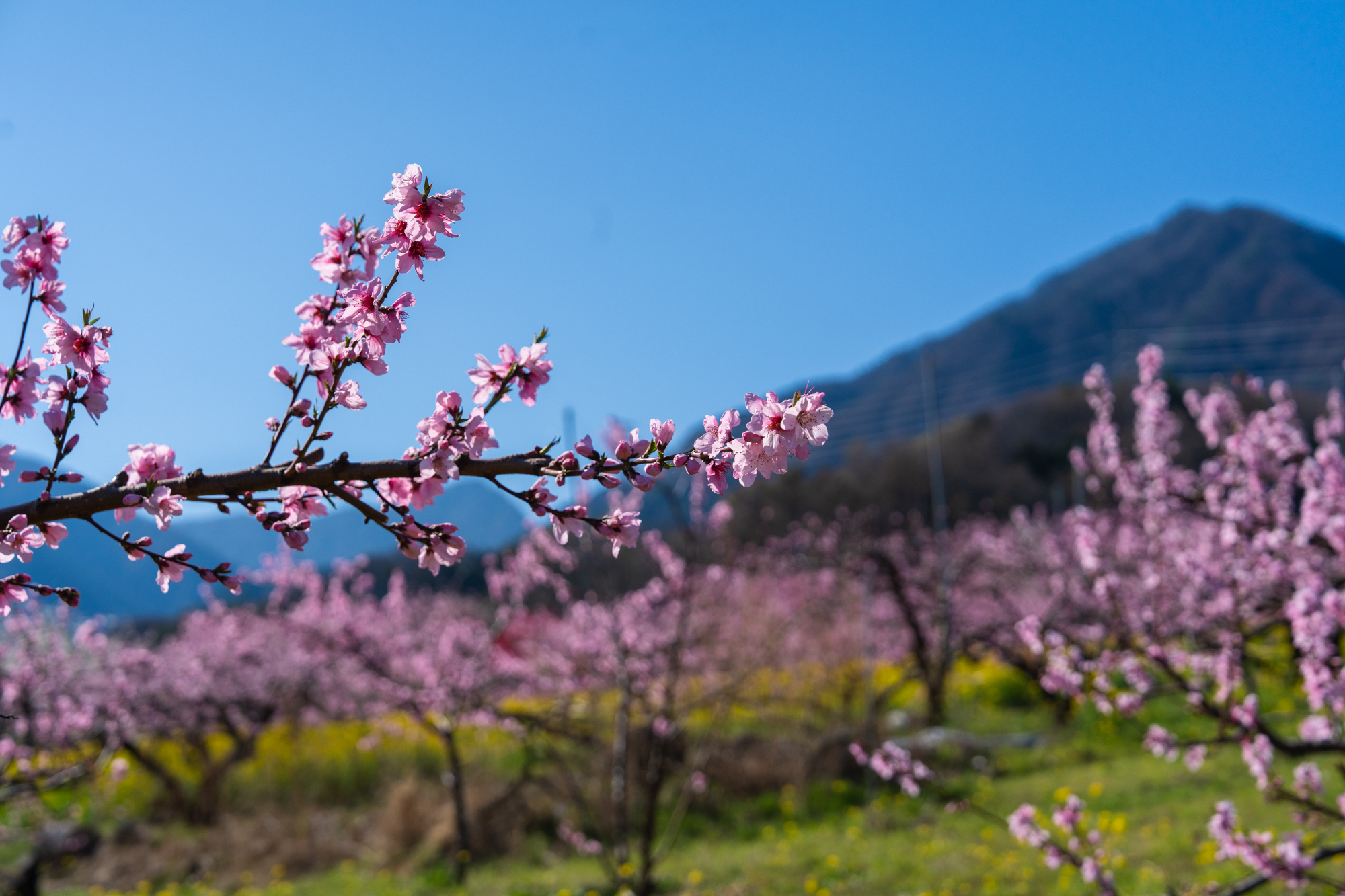 笛吹市御坂町には、甲府盆地や南アルプスを一望できる眺望の良い場所が各所に点在しています。中でもこちら黒駒地区は、桃の花と菜の花に囲まれながら散策を楽しめる、人気の高いスポットです。