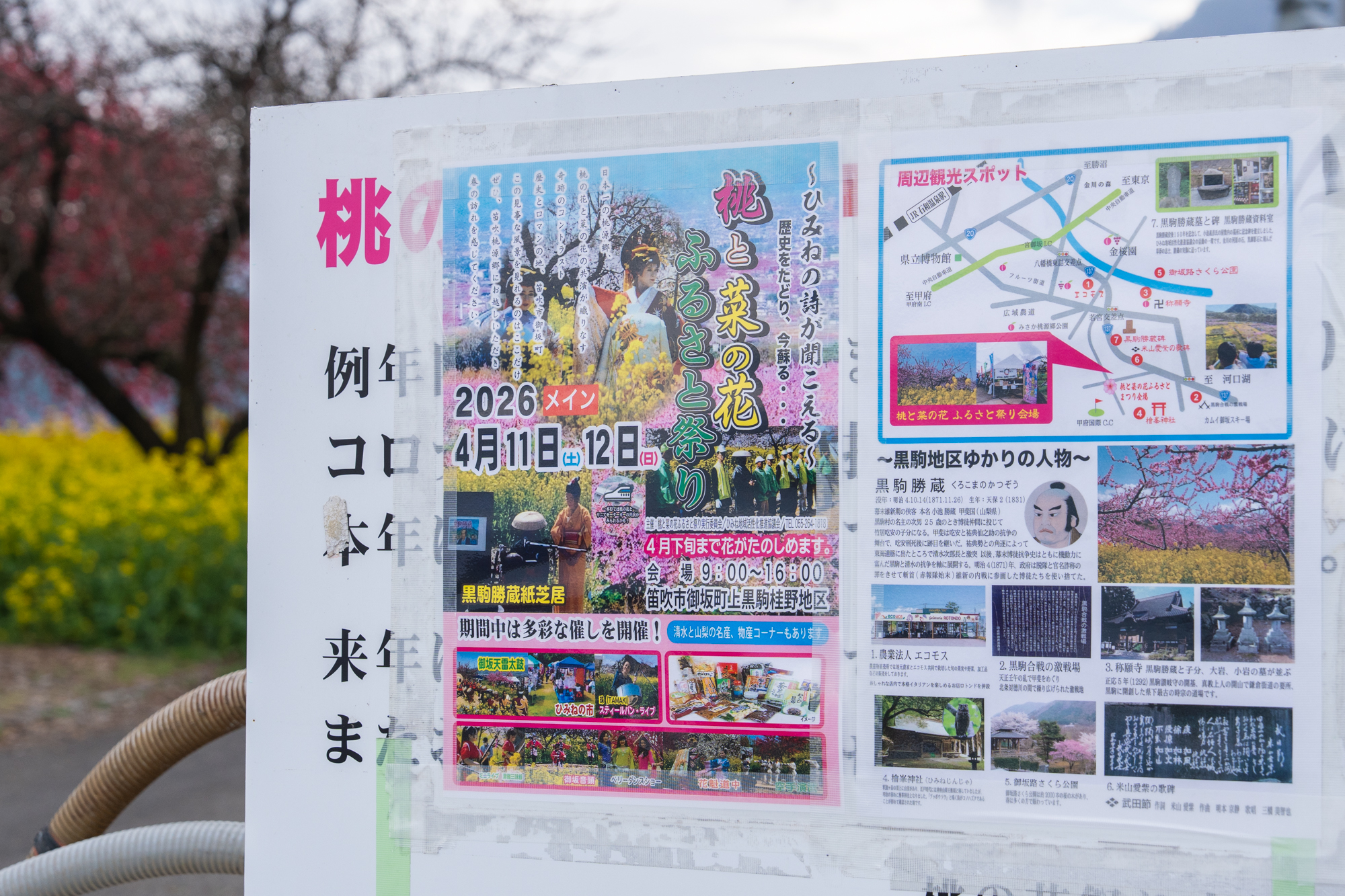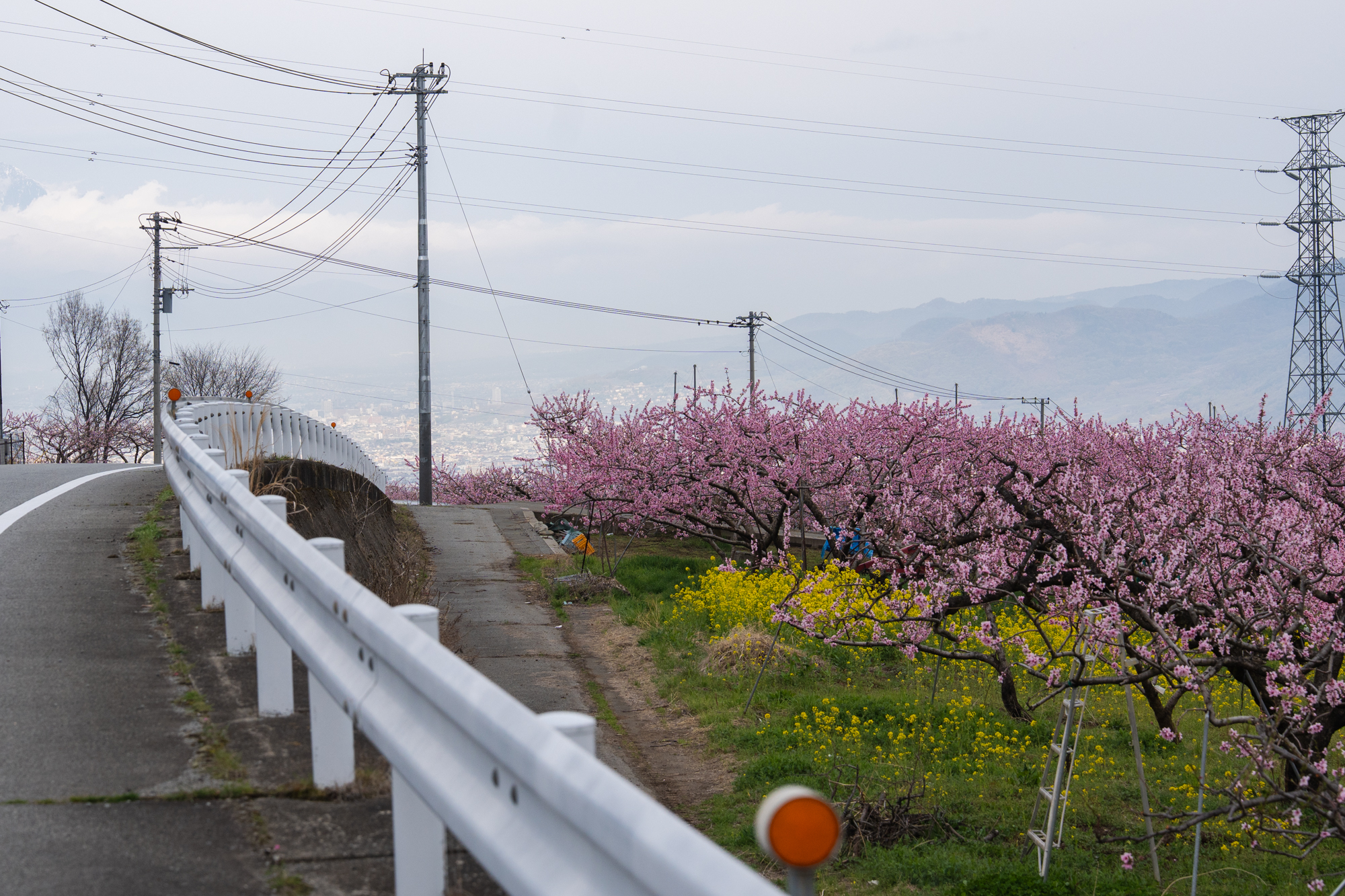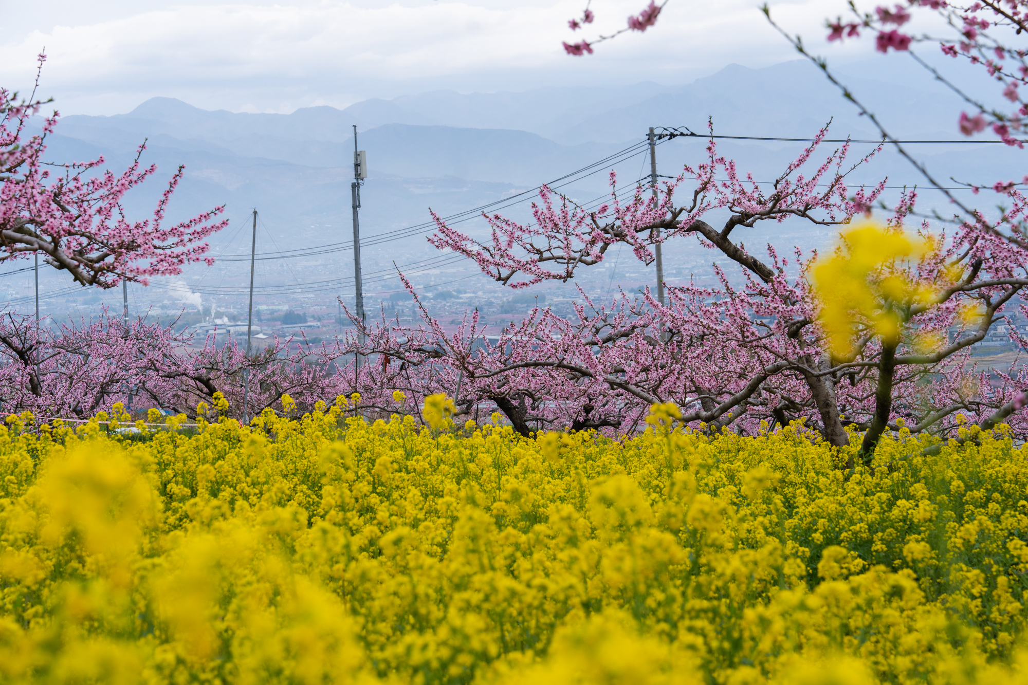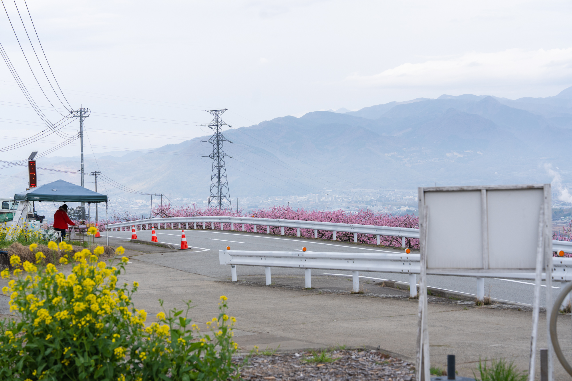 黒駒地区周辺の桃の花は、見頃を迎えています。こちらのエリアでは、桃と菜の花が織りなす美しい景色とともに、眺望の良い景色をお楽しみいただけます。景色を眺めながらドライブされる方も多いため、通行の際は十分にご注意ください。