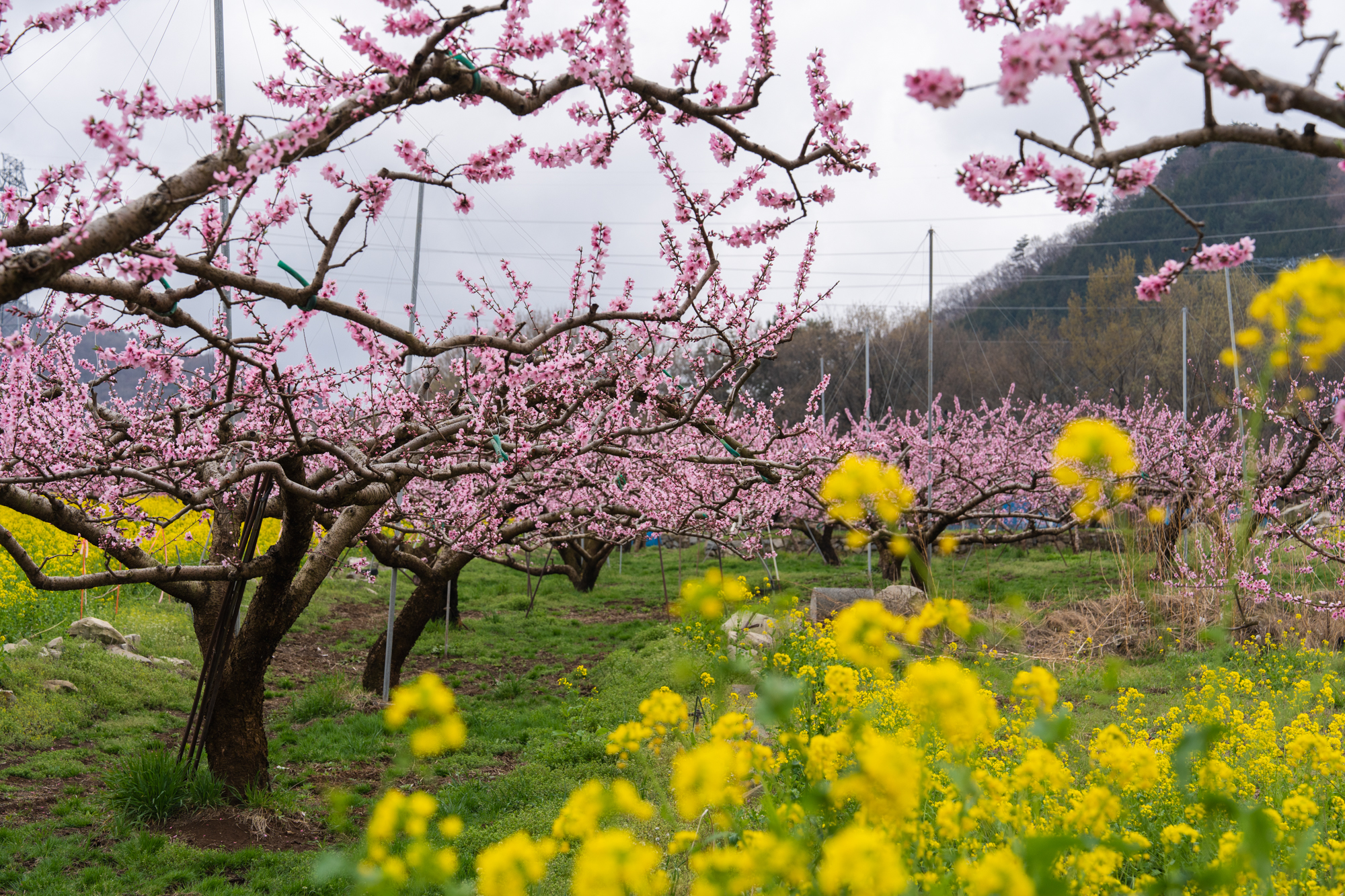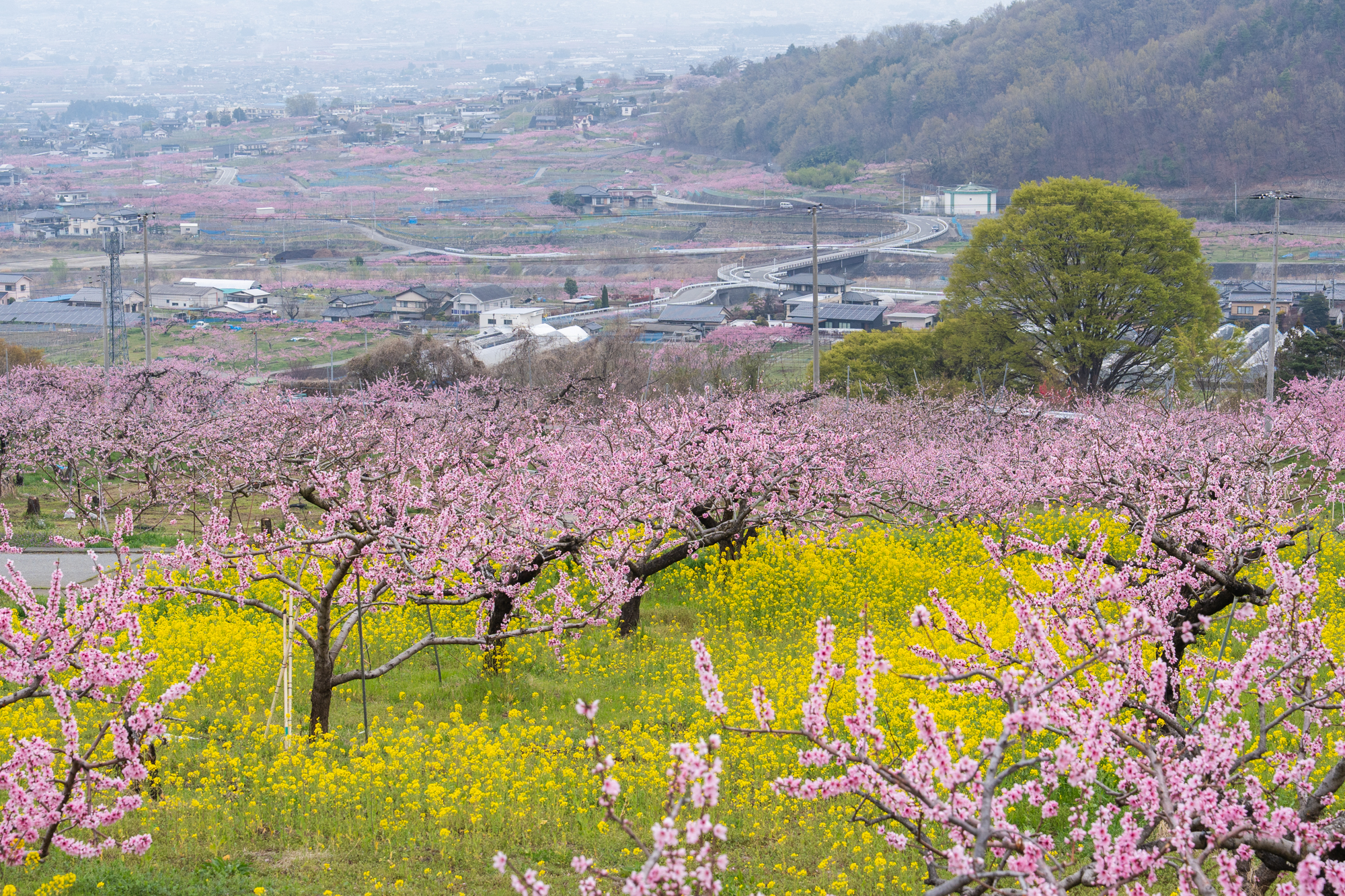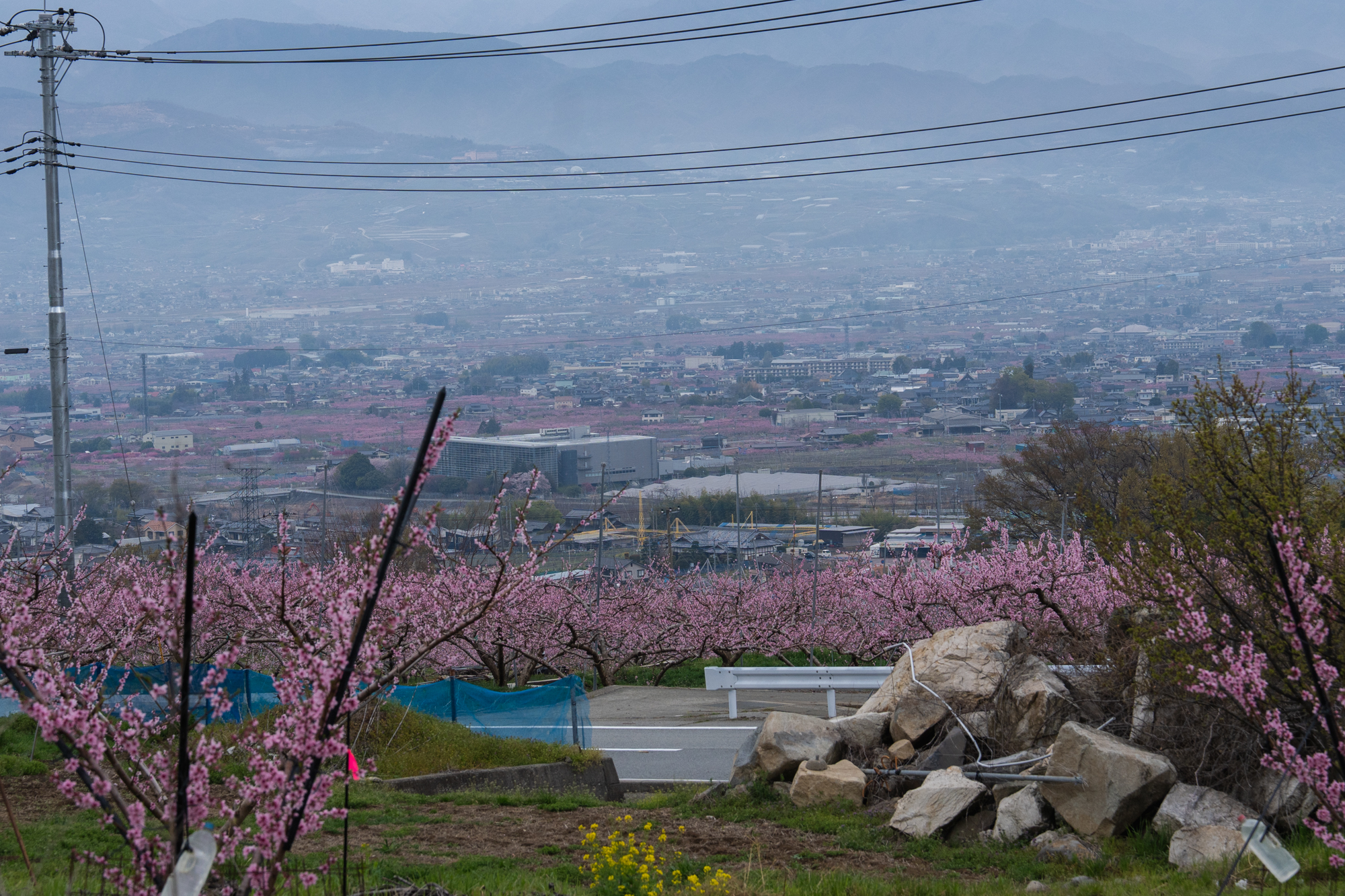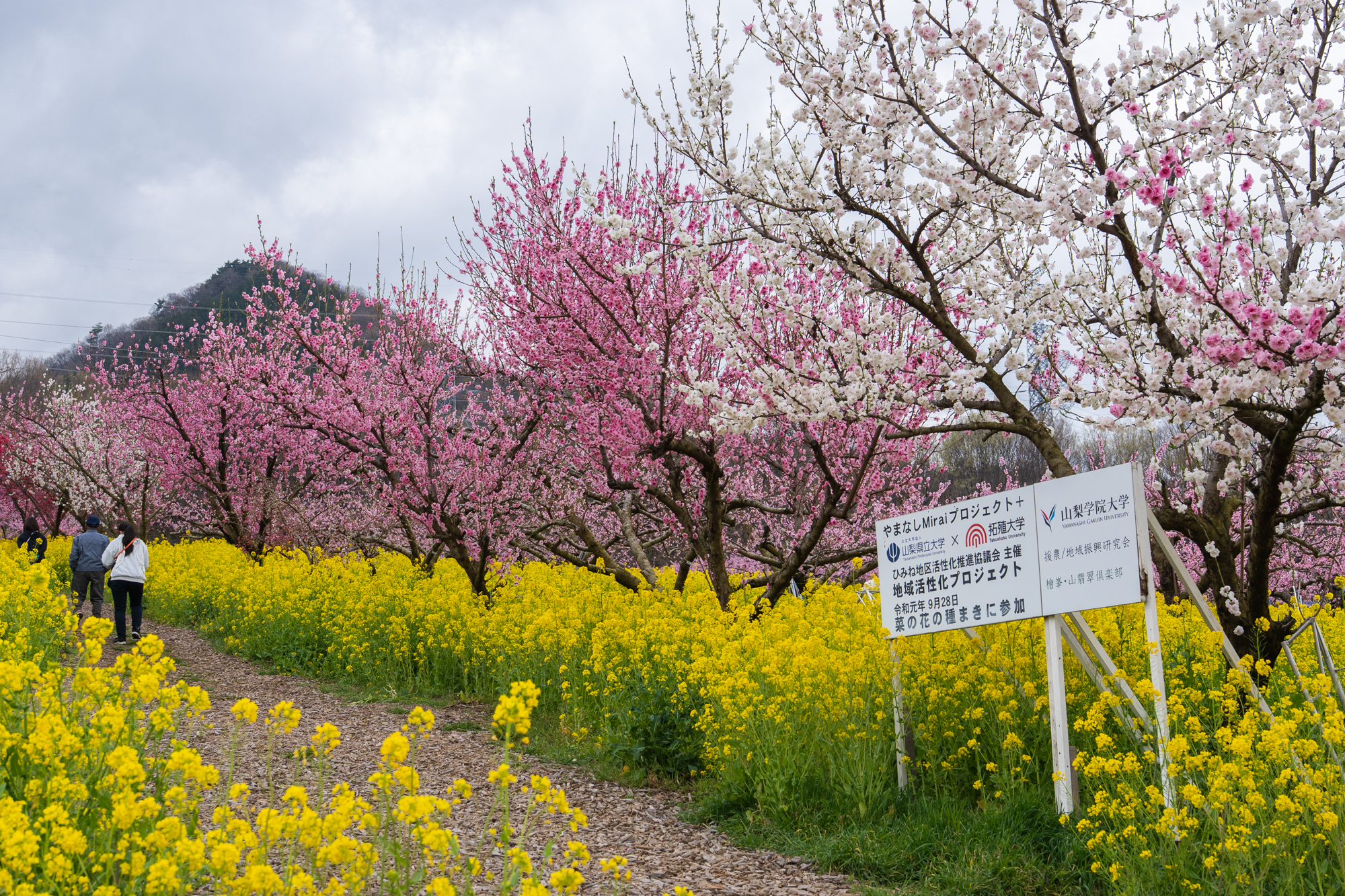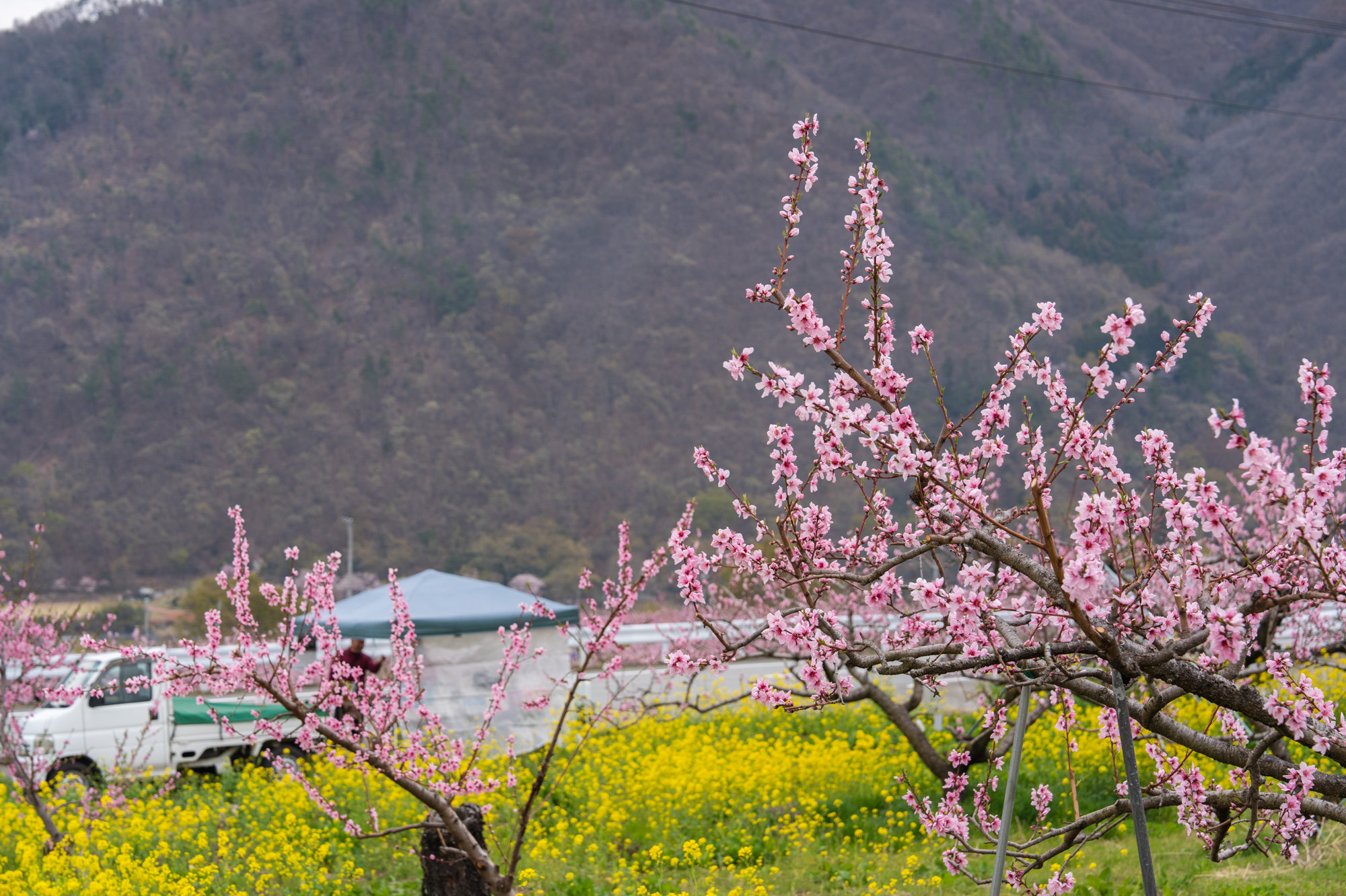 黒駒地区周辺の桃の花は、見頃を迎えています。こちらのエリアでは、桃と菜の花が織りなす美しい景色とともに、眺望の良い景色をお楽しみいただけます。景色を眺めながらドライブされる方も多いため、通行の際は十分にご注意ください。