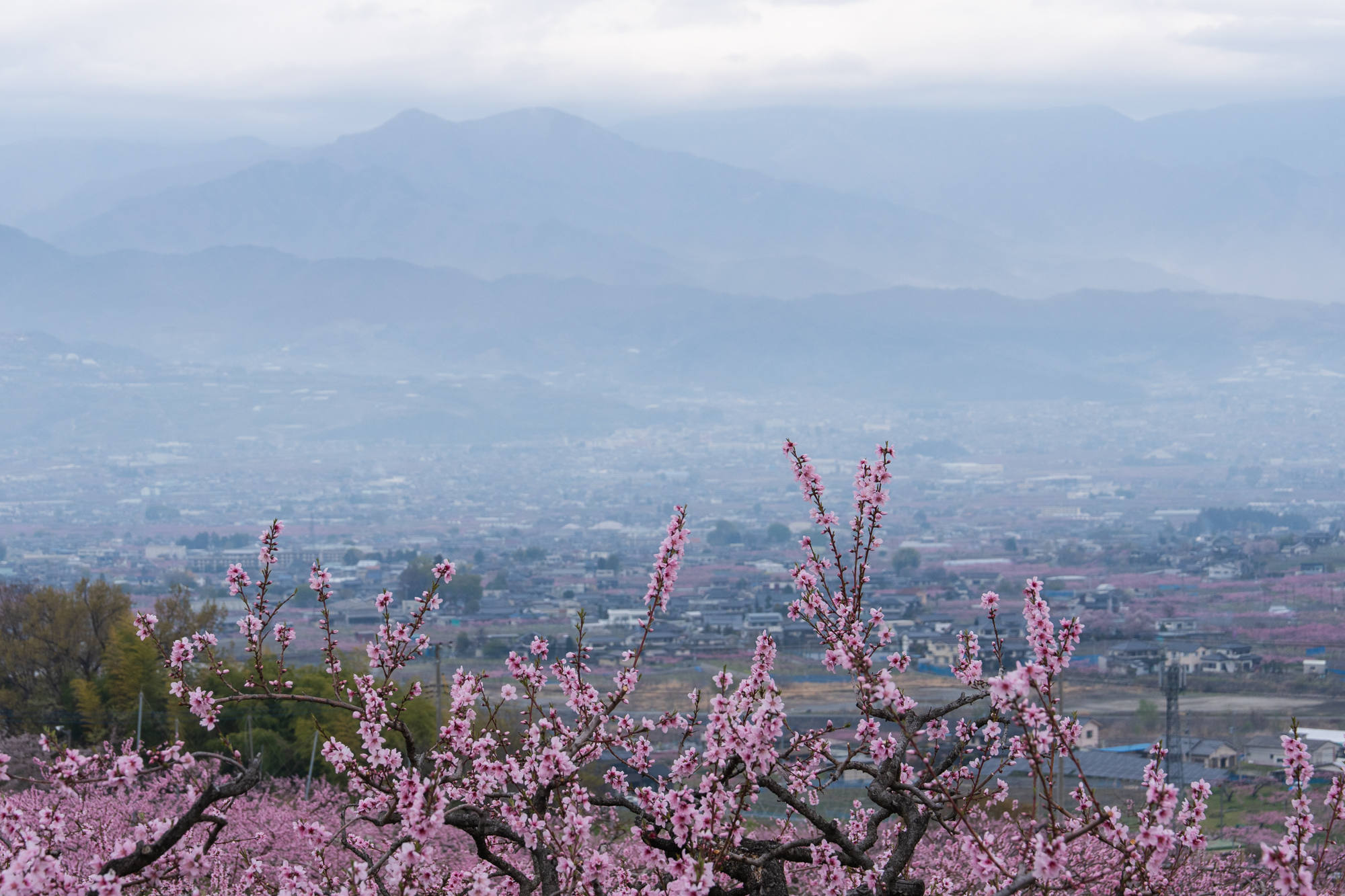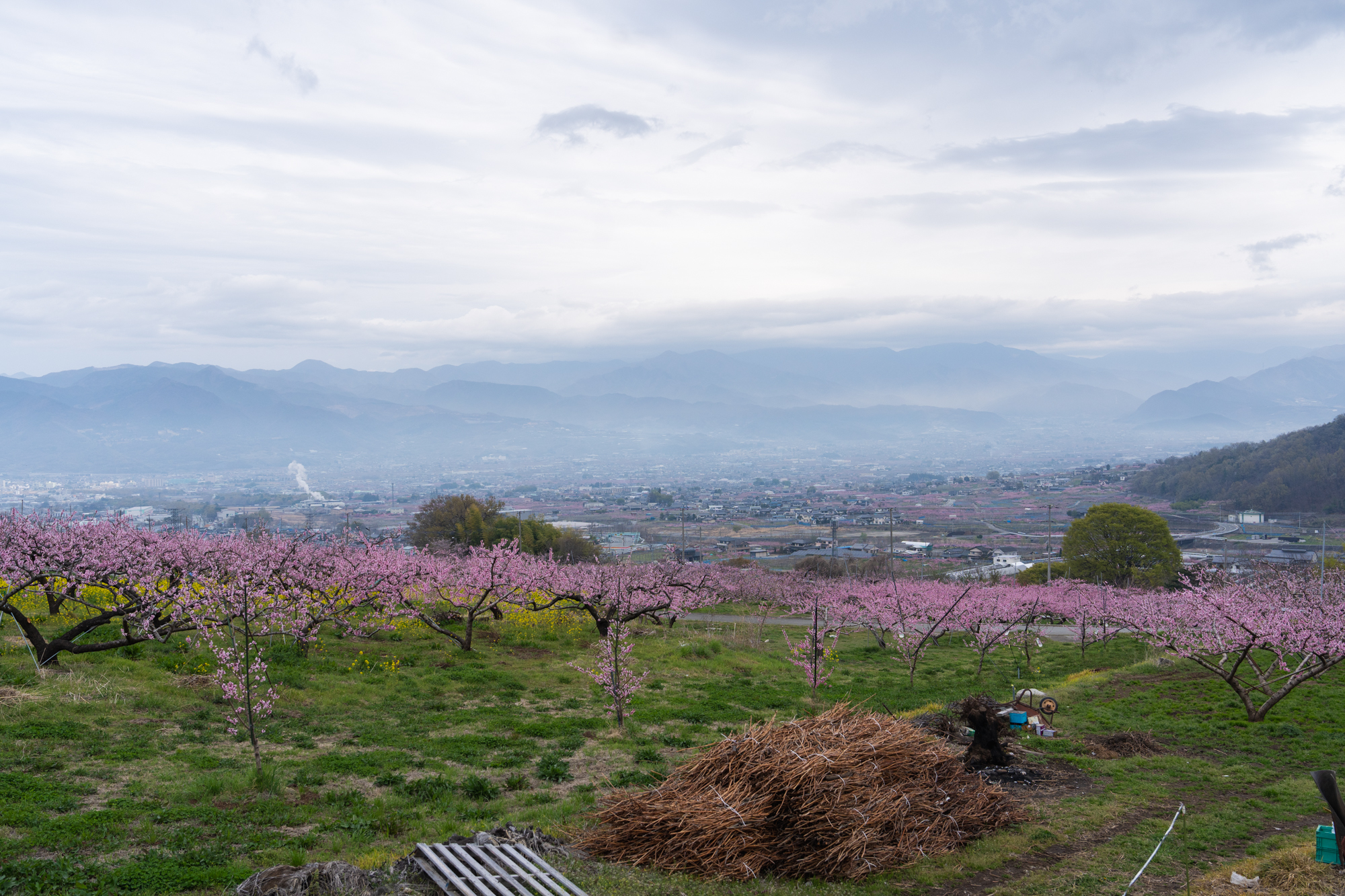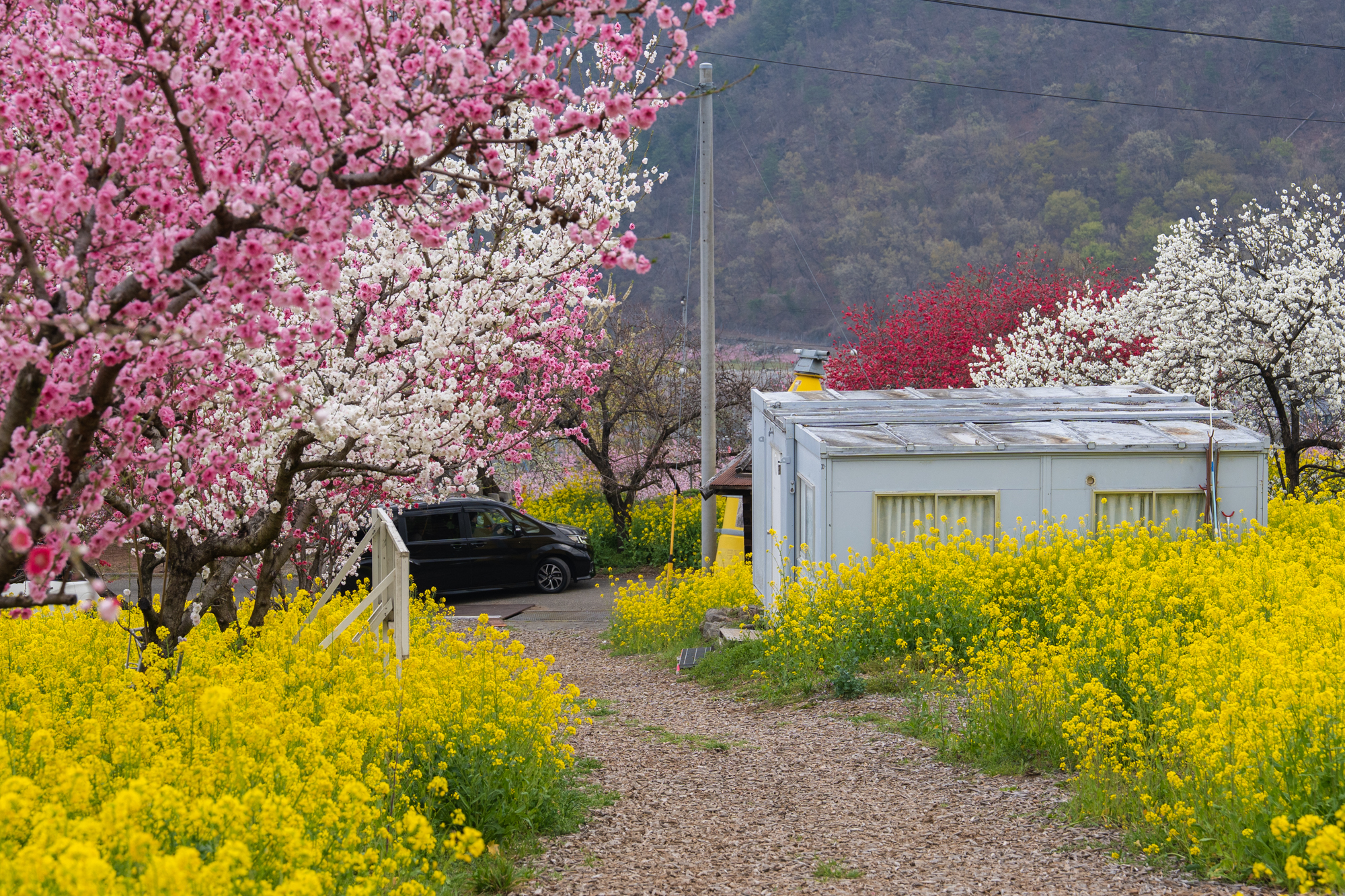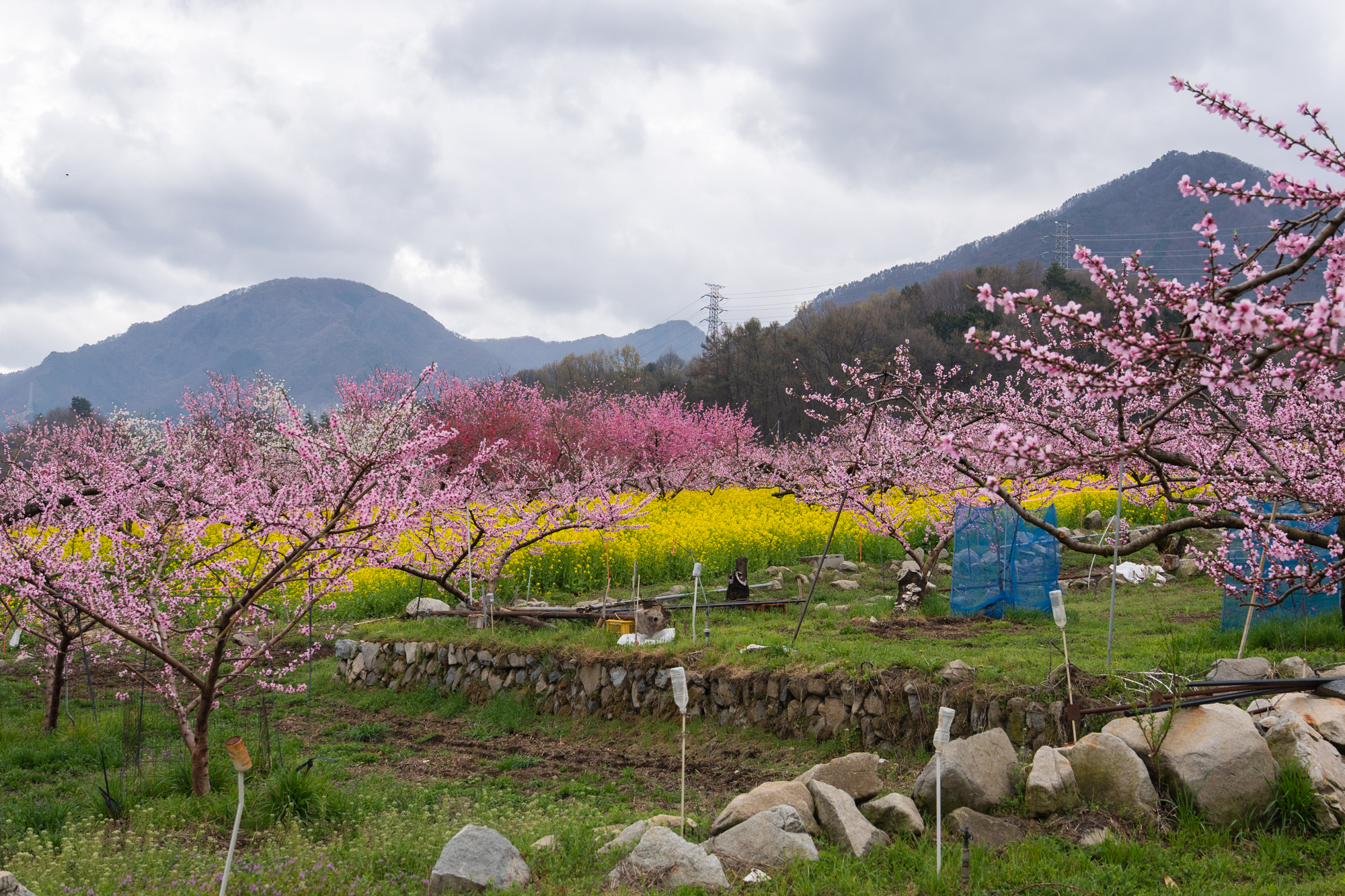 黒駒地区周辺の桃の花は、見頃を迎えています。こちらのエリアでは、桃と菜の花が織りなす美しい景色とともに、眺望の良い景色をお楽しみいただけます。景色を眺めながらドライブされる方も多いため、通行の際は十分にご注意ください。