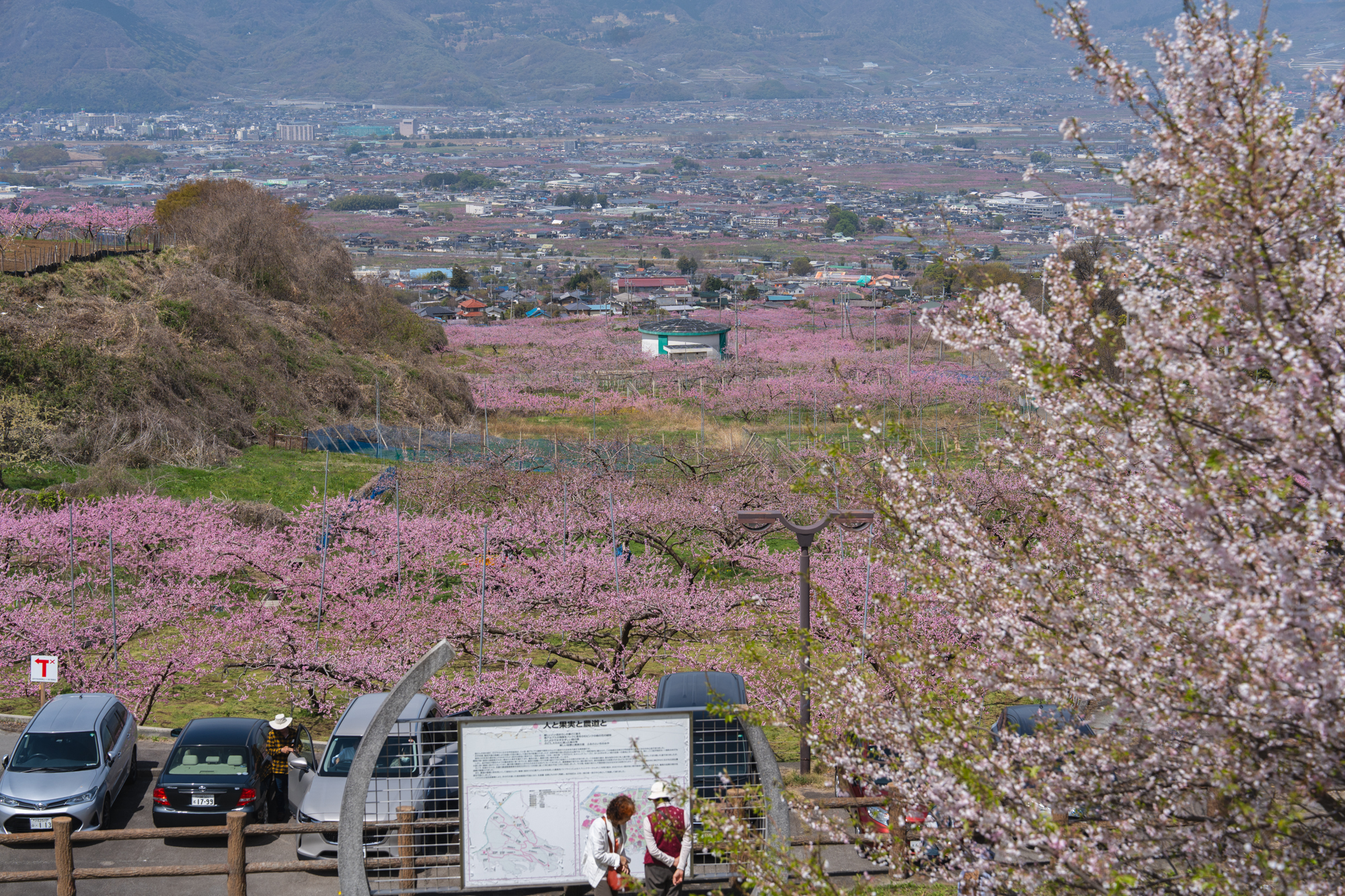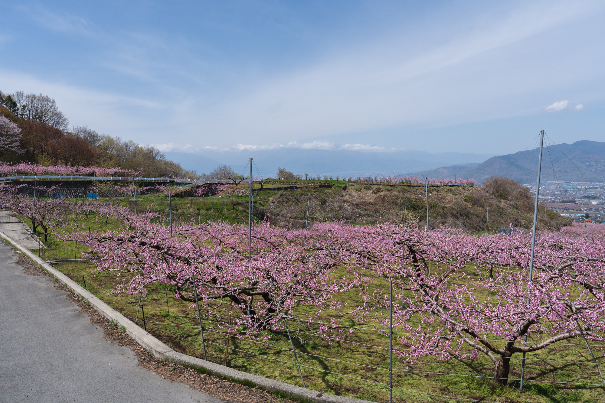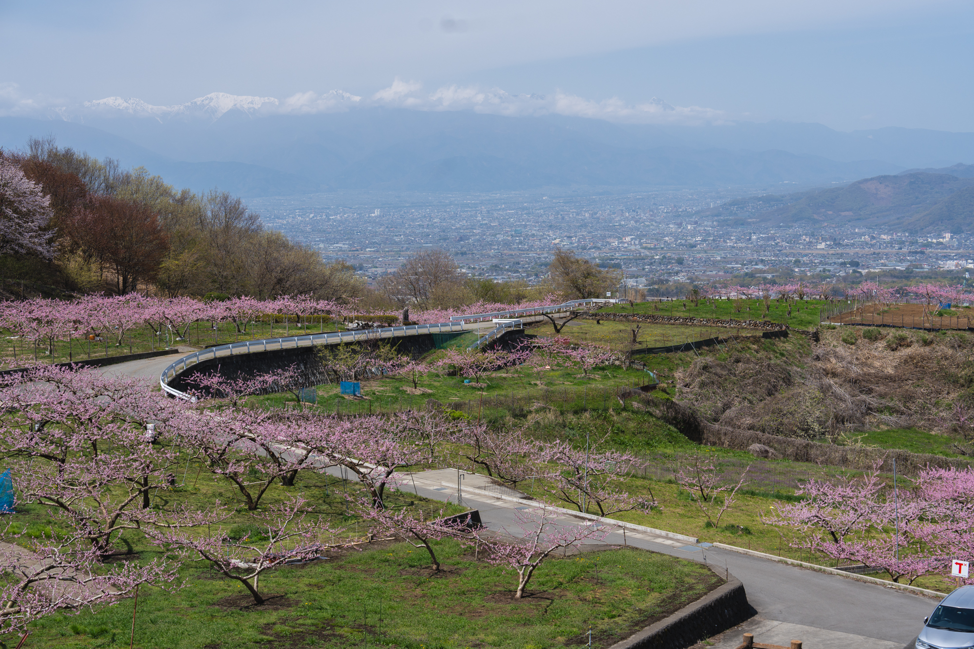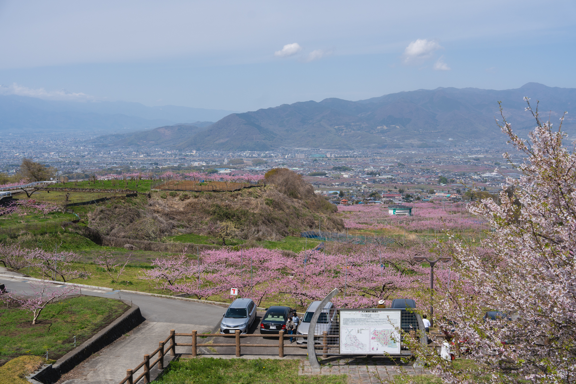 ここはいつ訪れても、眼下に広がる景色から吹き上げてくる風が心地よく、ゆったりとした時間が流れる場所です。すでに平野部では緑が目立ち始めていますが、花見台周辺ではもうしばらく桃の花を楽しむことができそうです。