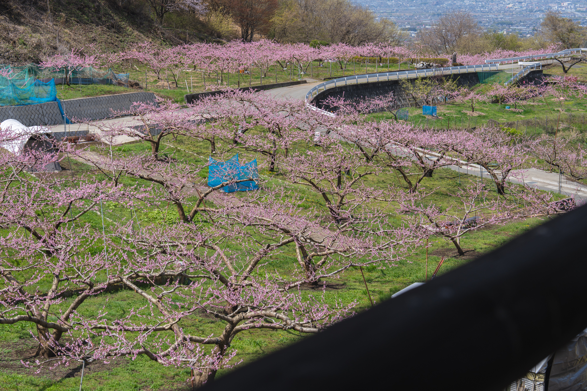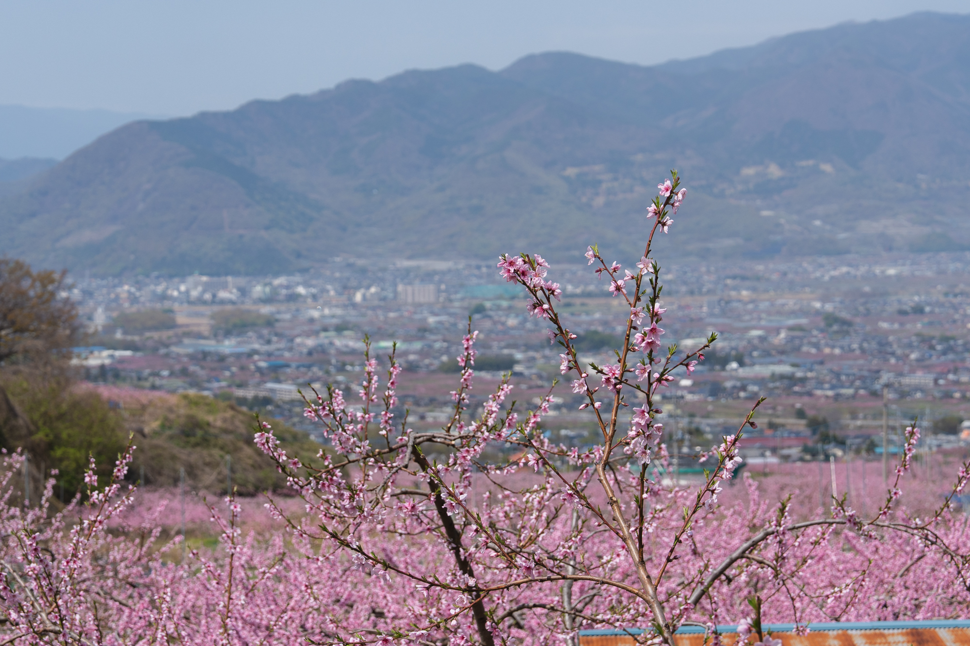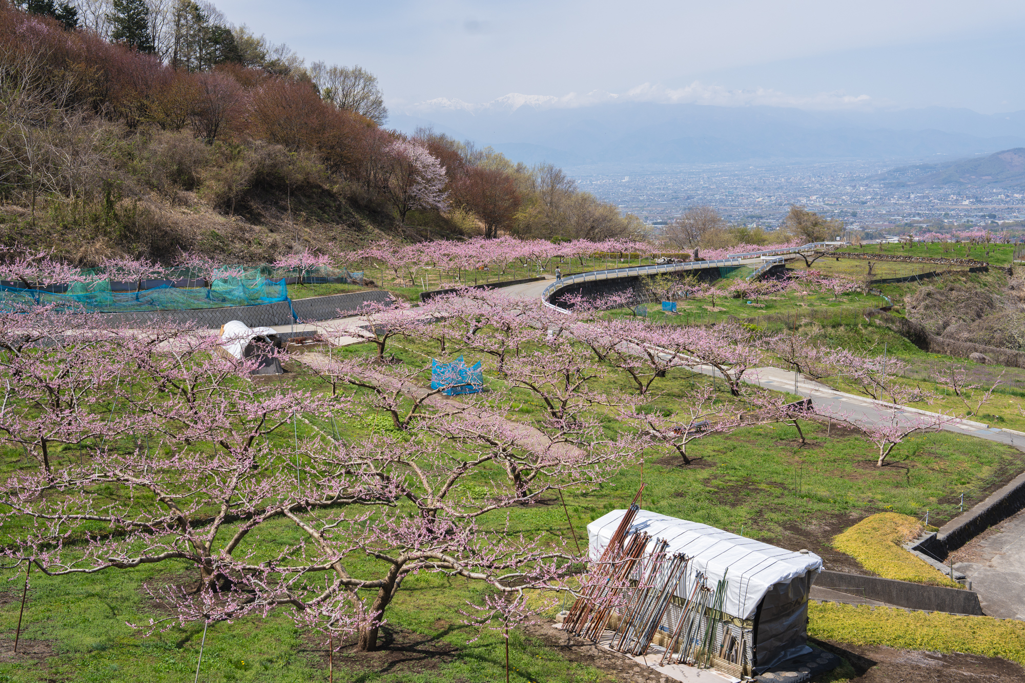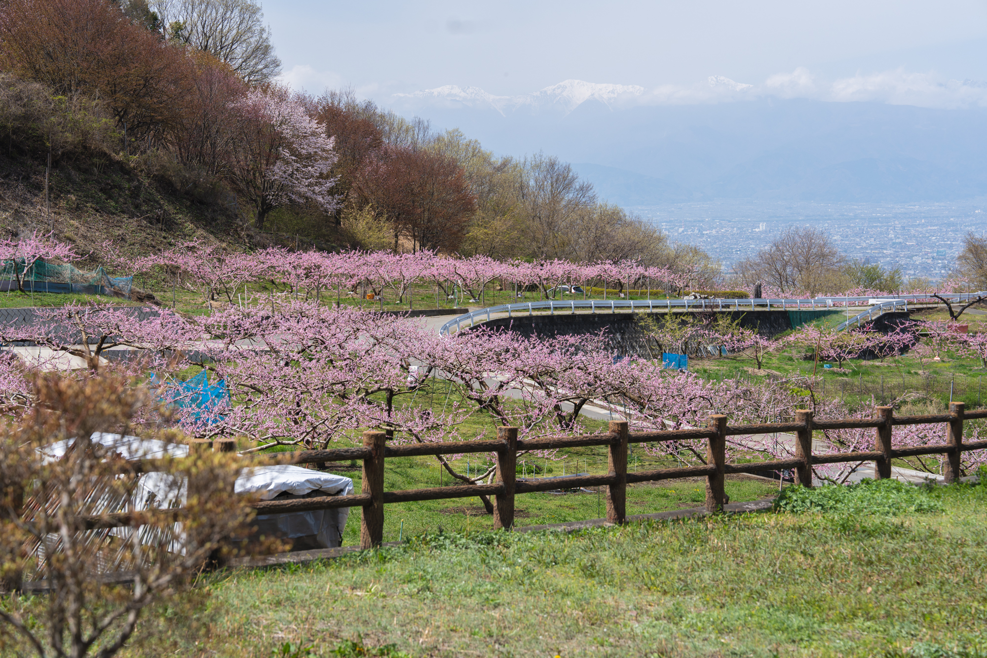 ここはいつ訪れても、眼下に広がる景色から吹き上げてくる風が心地よく、ゆったりとした時間が流れる場所です。すでに平野部では緑が目立ち始めていますが、花見台周辺ではもうしばらく桃の花を楽しむことができそうです。