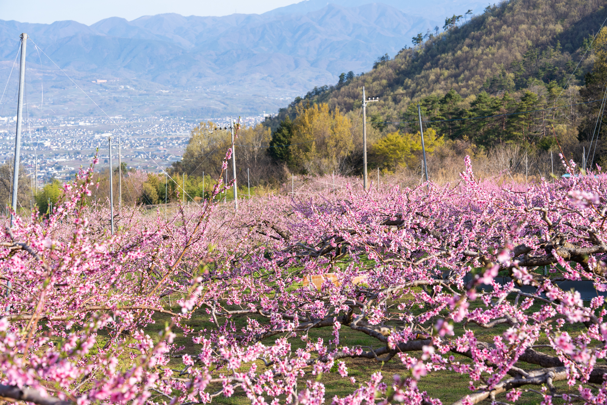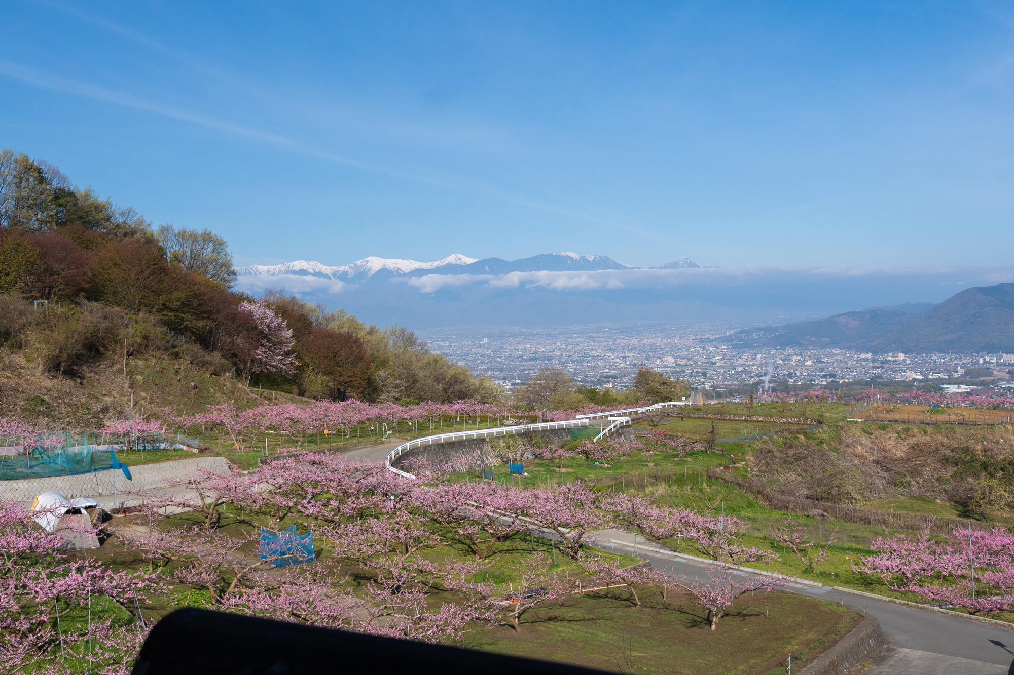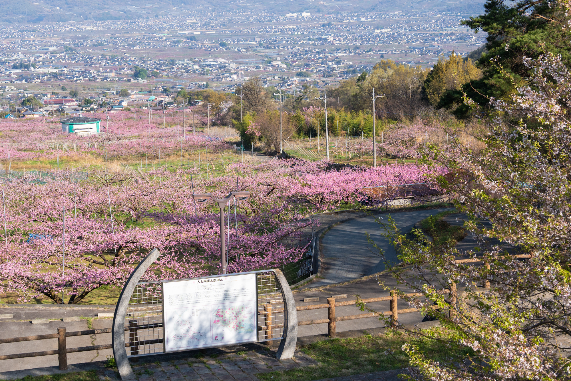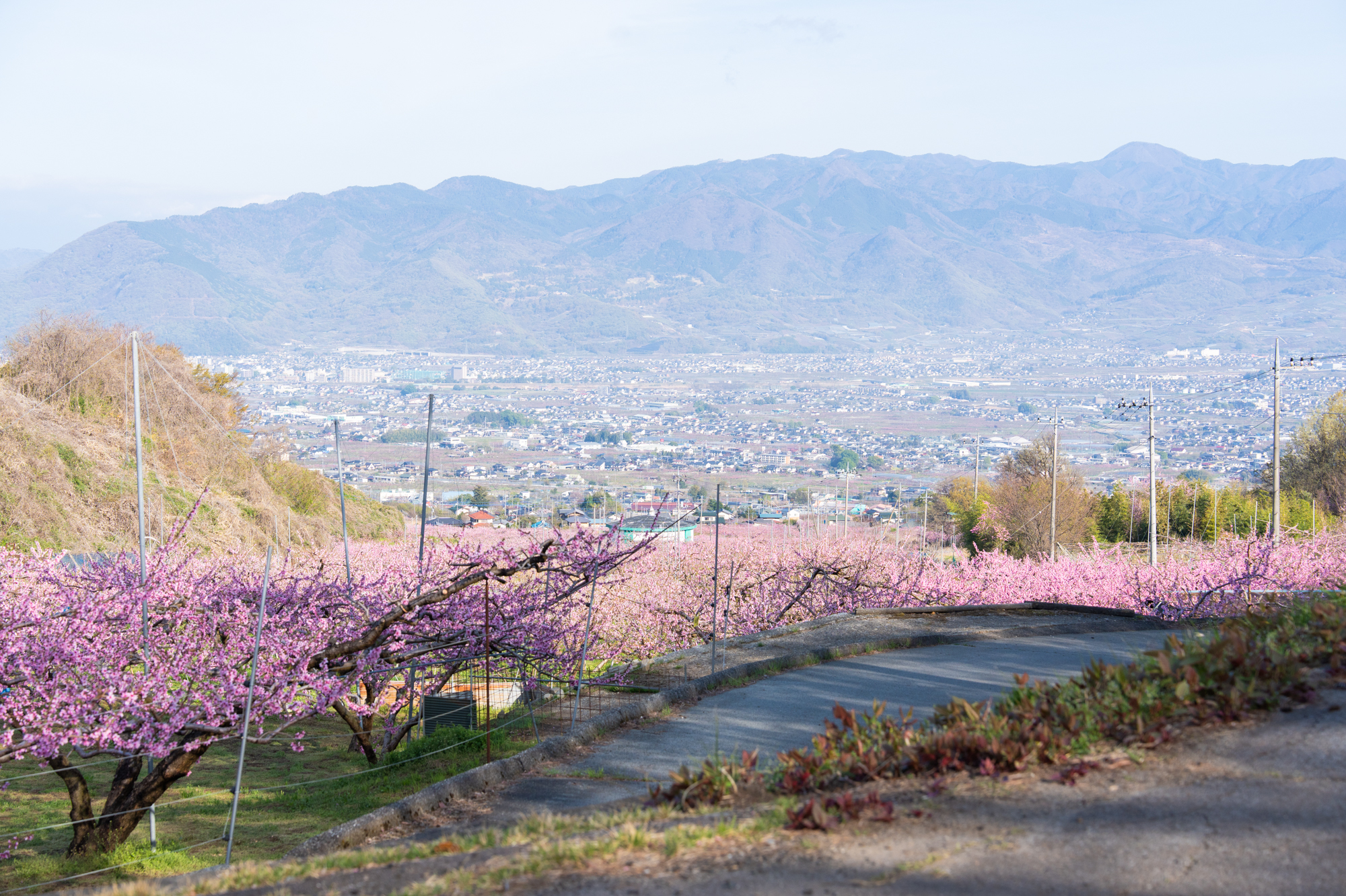 一宮町花見台周辺でも、桃の花が見頃のピークを迎えています。花見台よりさらに高い場所の畑でも、花の色が濃いピンクへと変わり、周辺一帯は見渡す限りピンク色の景色が広がっています。