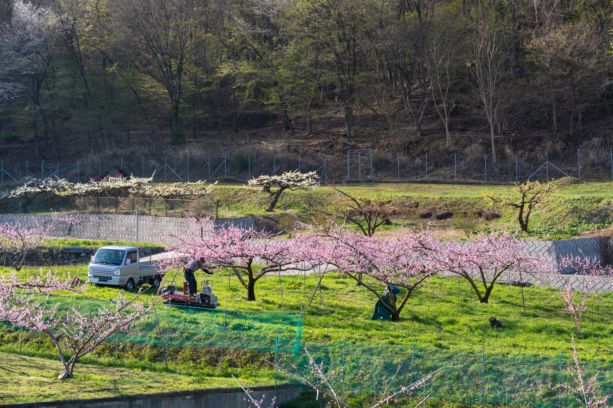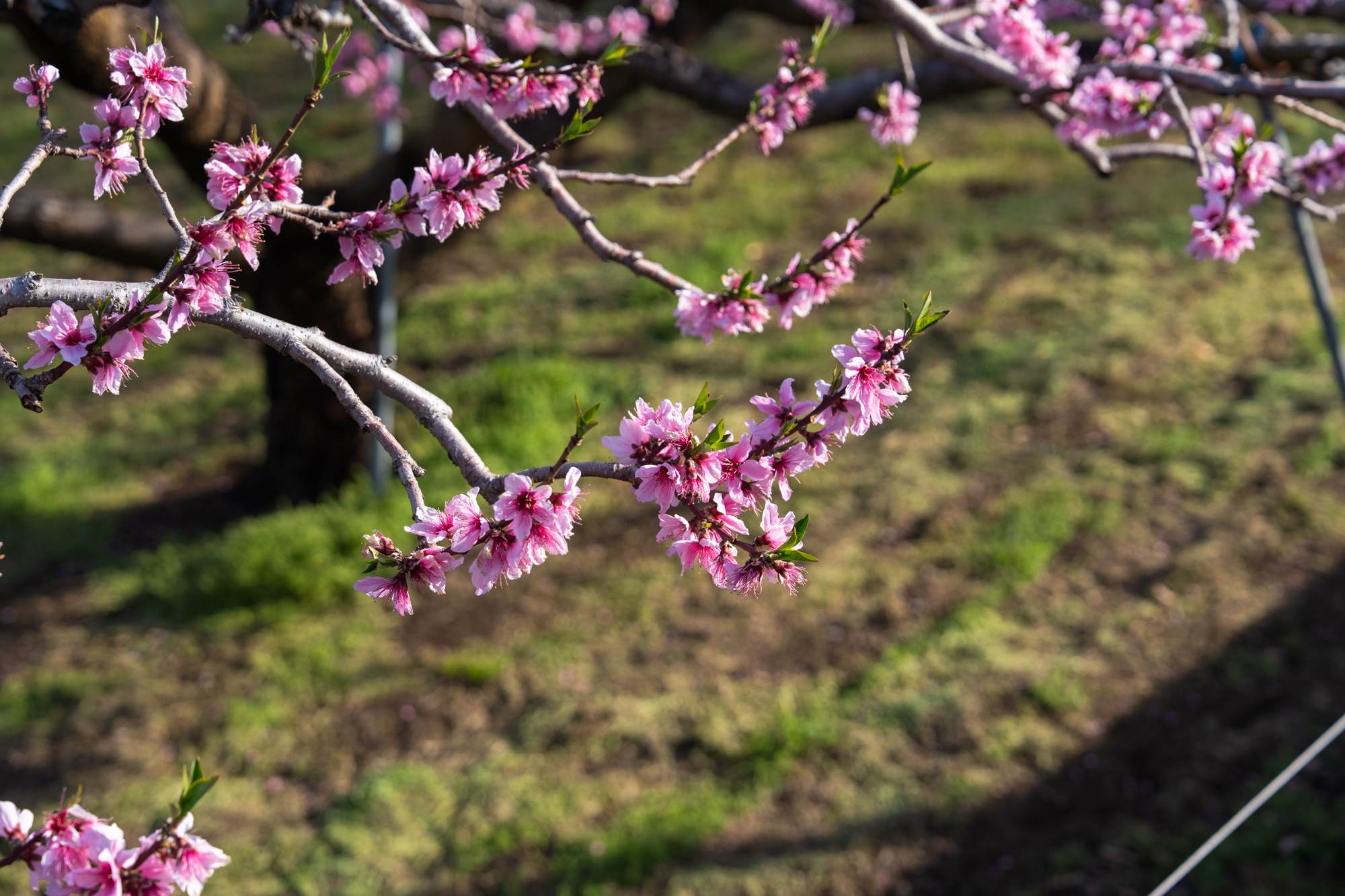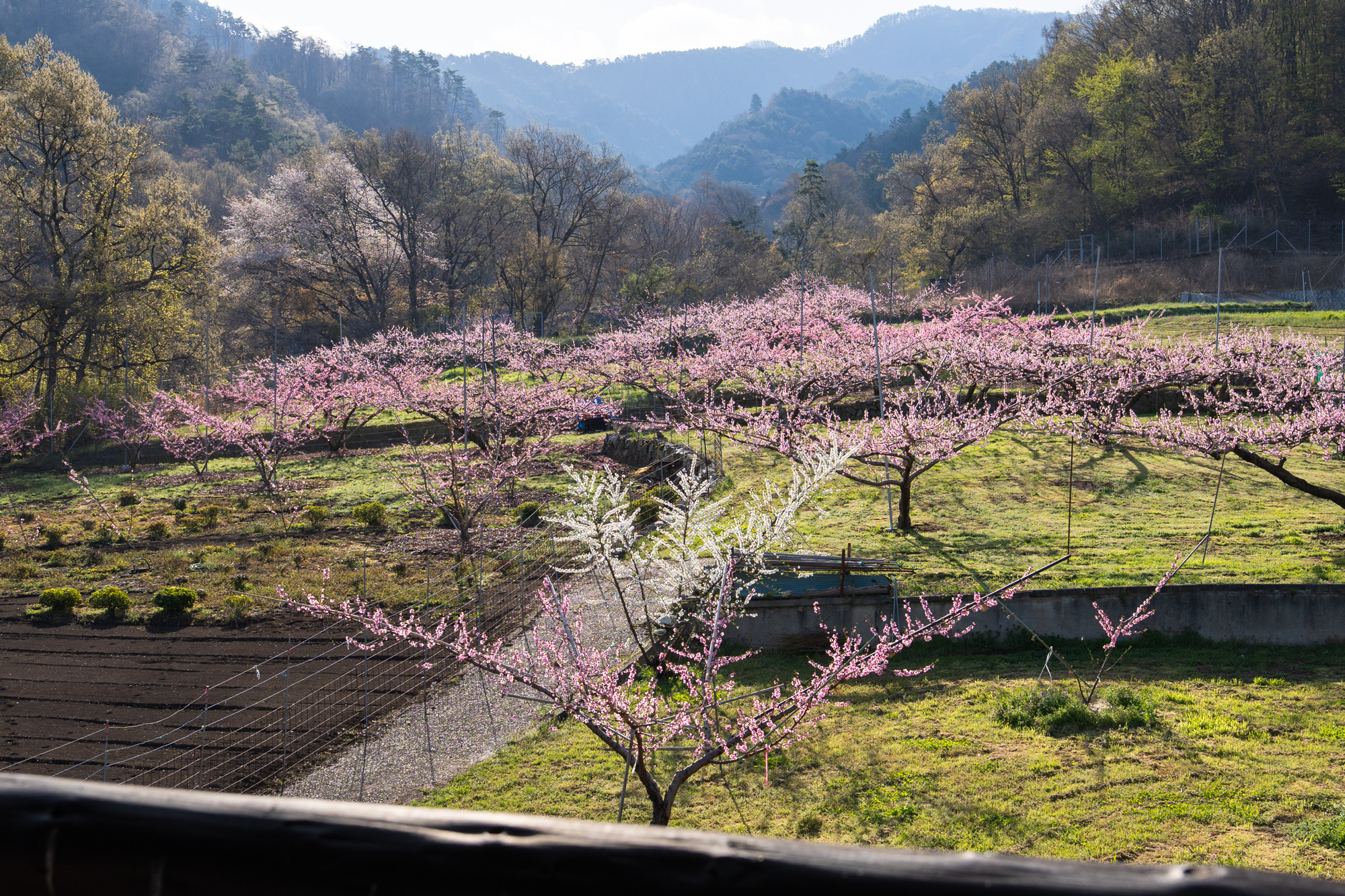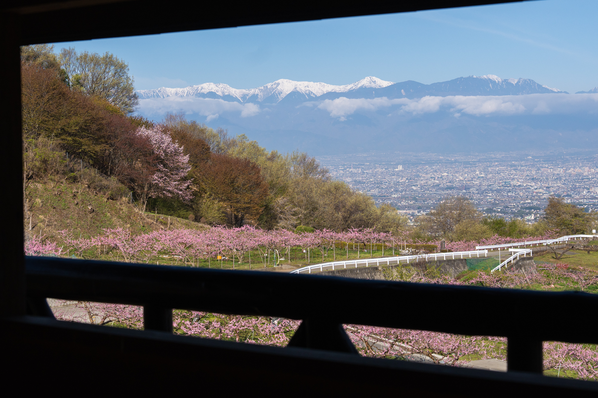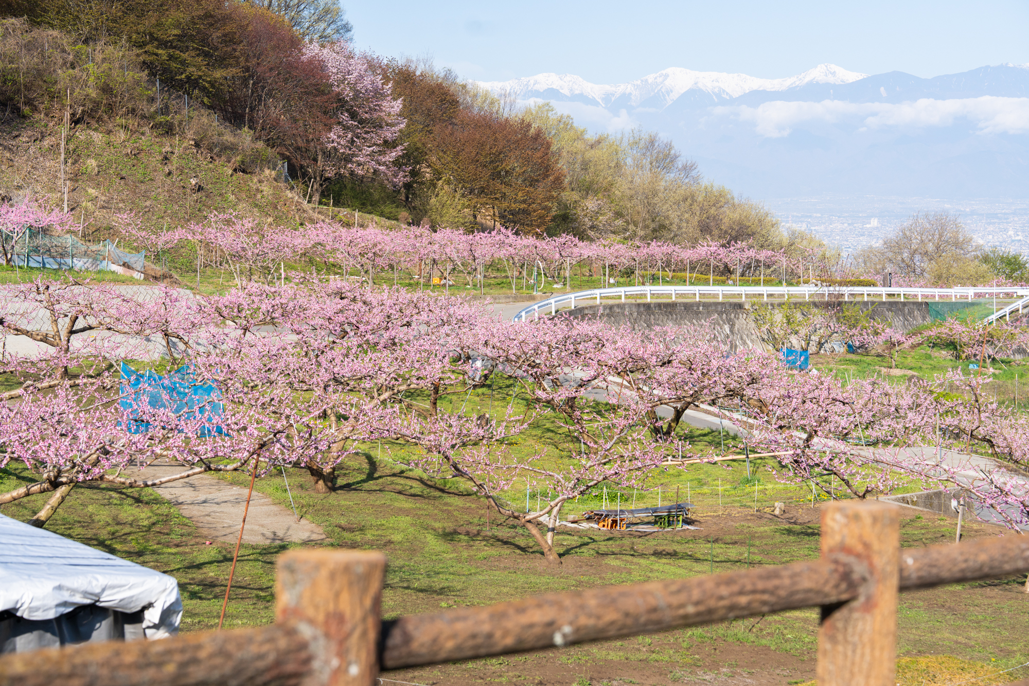 一宮町花見台周辺でも、桃の花が見頃のピークを迎えています。花見台よりさらに高い場所の畑でも、花の色が濃いピンクへと変わり、周辺一帯は見渡す限りピンク色の景色が広がっています。