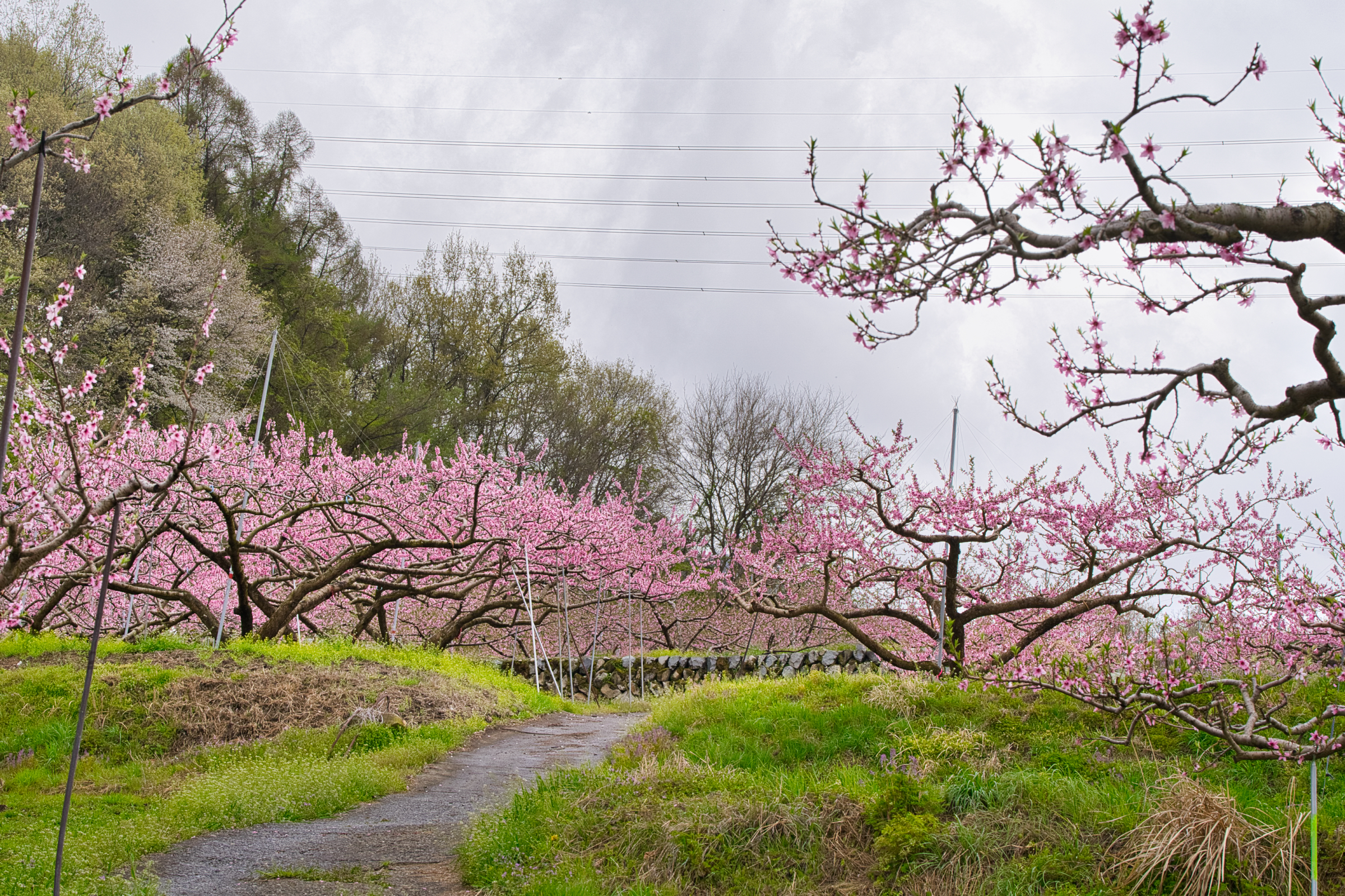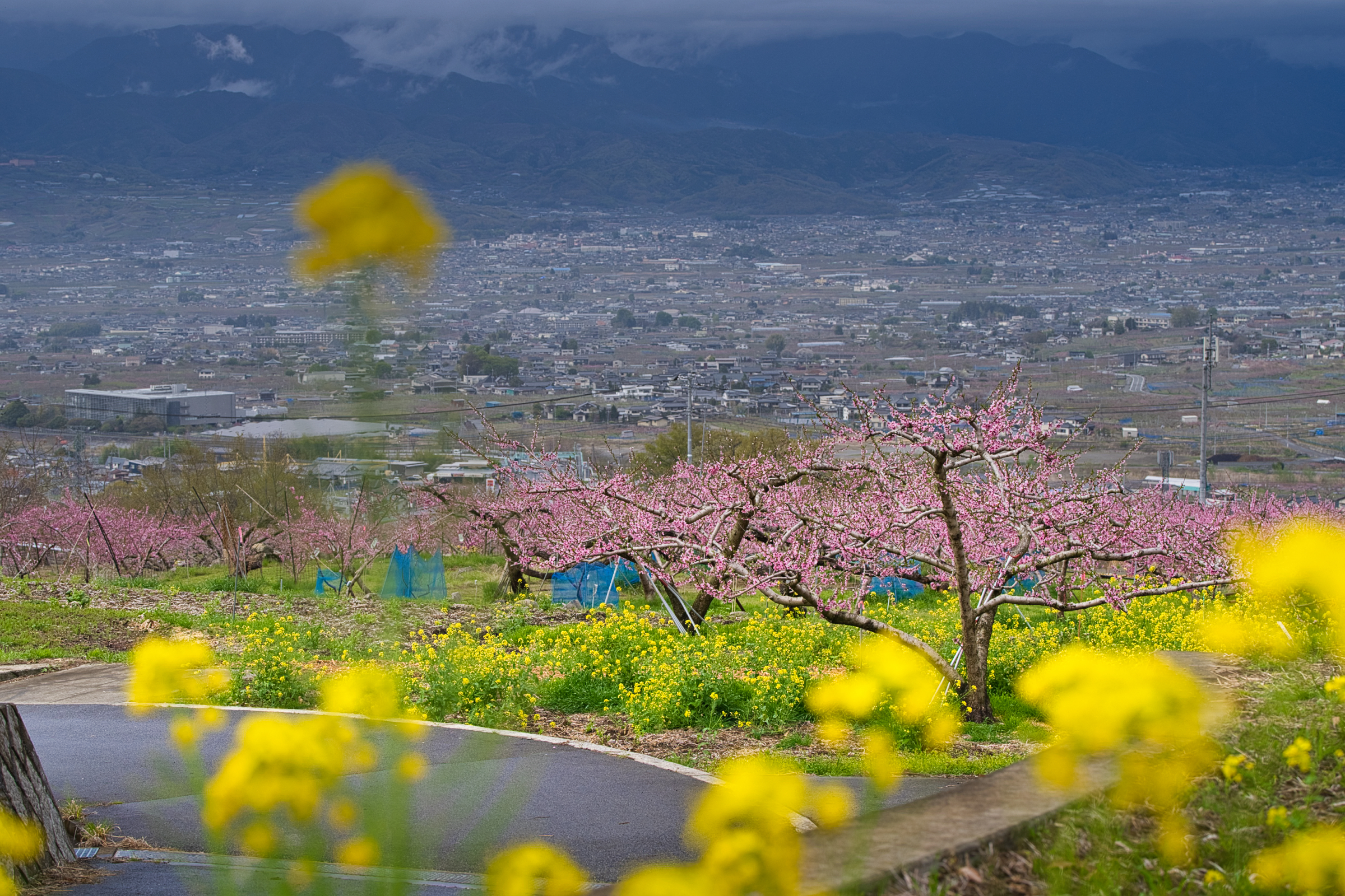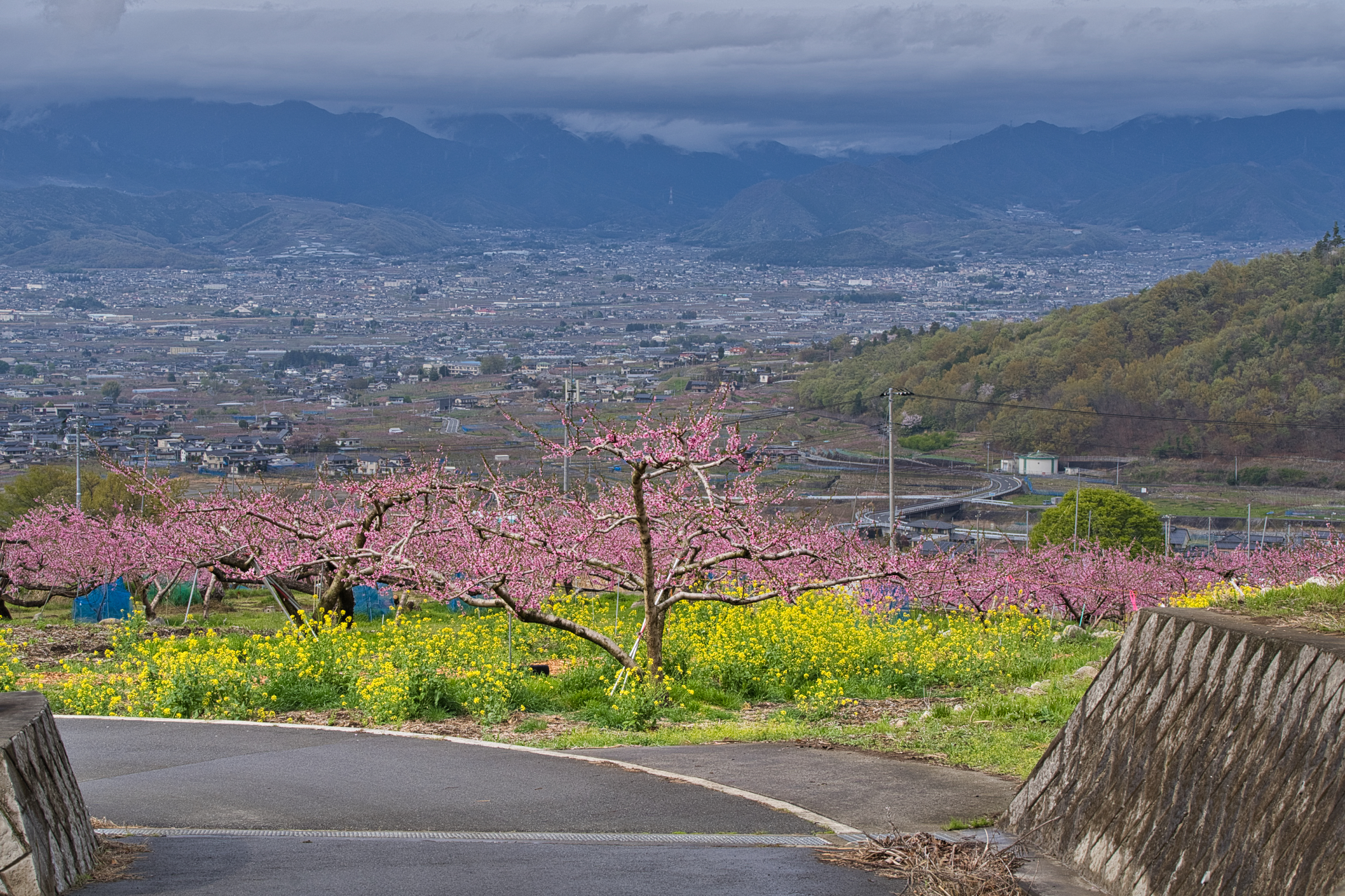 本日4月10日、小雨の合間を縫って午後の撮影になりましたが、黒駒地区エリアの桃の様子をお伝えします。「桃と菜の花ふるさと祭り」の会場でもあるこちらの場所ですが、明日からのお祭り準備などで周辺への立ち入りが難しかったため農道をぐるりと回って、お祭り会場の少し上の方からの撮影となっております。会場内はご覧のように菜の花が咲き、桃の花のピンクとの色合いがこの時期ならではの春景となっています。桃の花につきましてはすでに満開を迎え、やや過ぎた感じではありますが、補うように花桃の色とりどりの濃い色で会場が華やかになっています。明日、明後日と天候も回復し気温も高くなるようですので、お祭りをゆっくりとお楽しみください。
