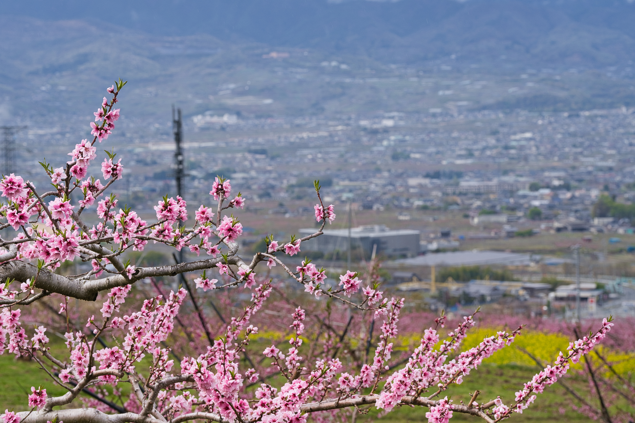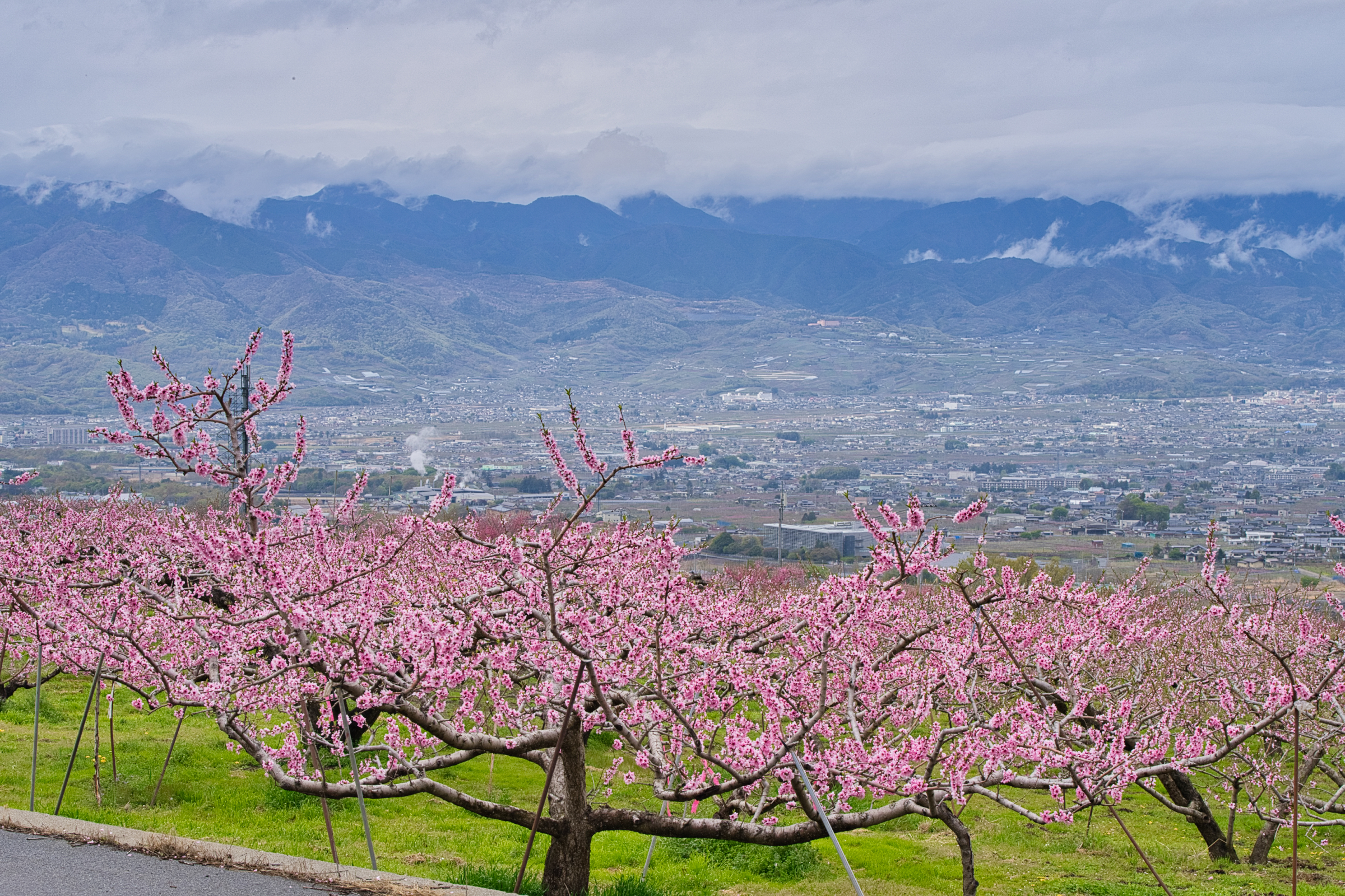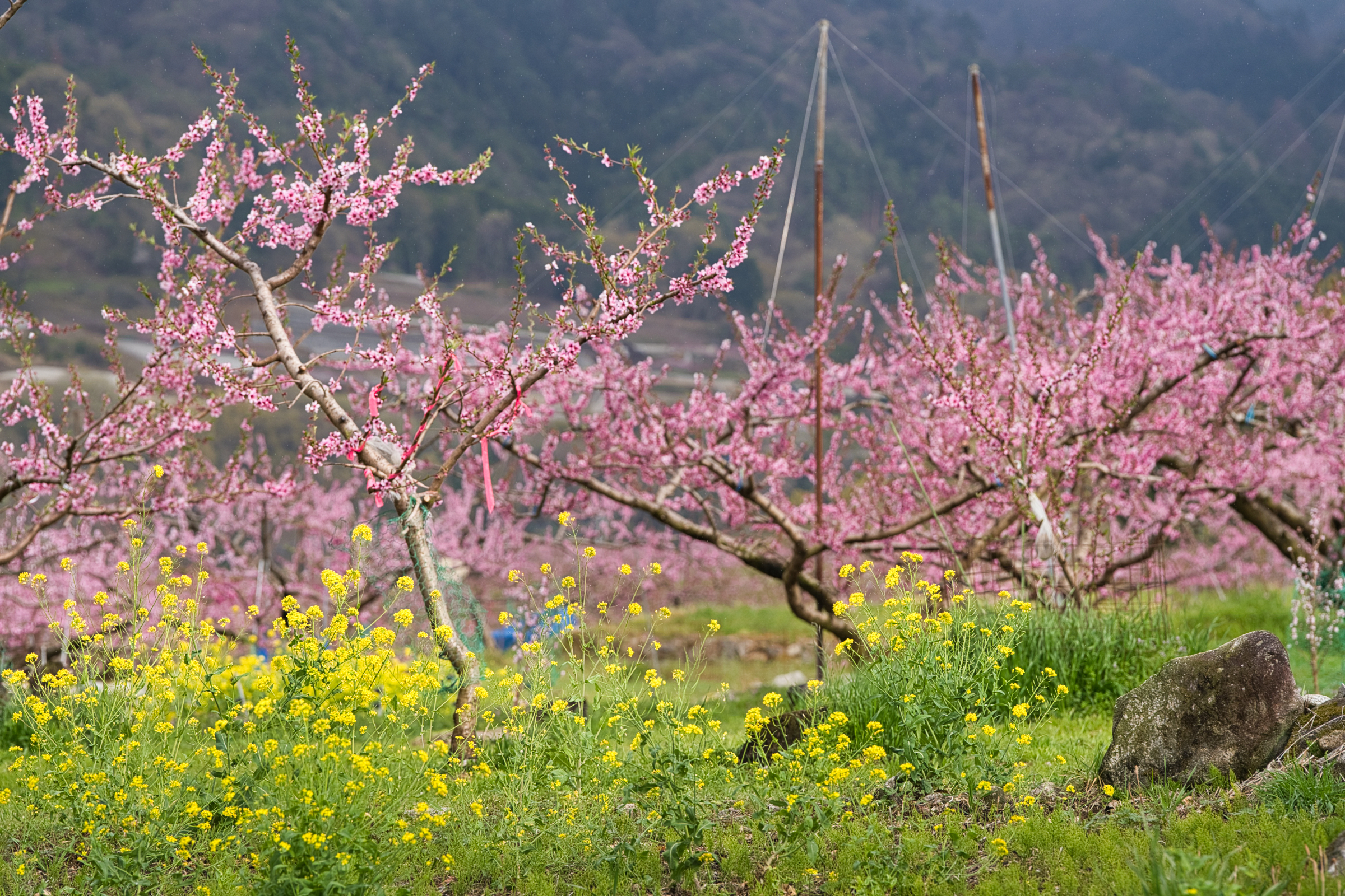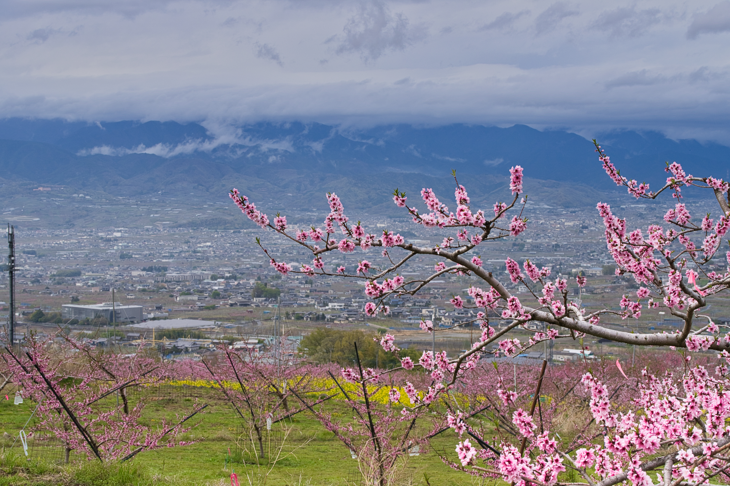 本日4月10日、小雨の合間を縫って午後の撮影になりましたが、黒駒地区エリアの桃の様子をお伝えします。「桃と菜の花ふるさと祭り」の会場でもあるこちらの場所ですが、明日からのお祭り準備などで周辺への立ち入りが難しかったため農道をぐるりと回って、お祭り会場の少し上の方からの撮影となっております。会場内はご覧のように菜の花が咲き、桃の花のピンクとの色合いがこの時期ならではの春景となっています。桃の花につきましてはすでに満開を迎え、やや過ぎた感じではありますが、補うように花桃の色とりどりの濃い色で会場が華やかになっています。明日、明後日と天候も回復し気温も高くなるようですので、お祭りをゆっくりとお楽しみください。