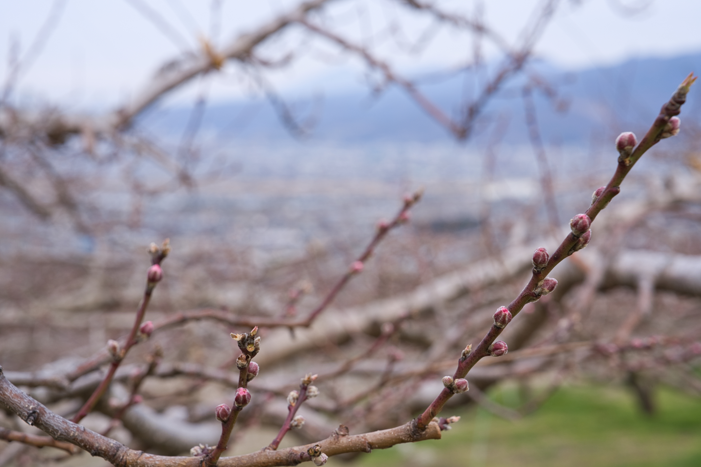 シンボル桜の大木「甲州蚕影桜」の向かいの桃畑。明らかに他よりも進んでいるのは「まさひめ」でしょうか。