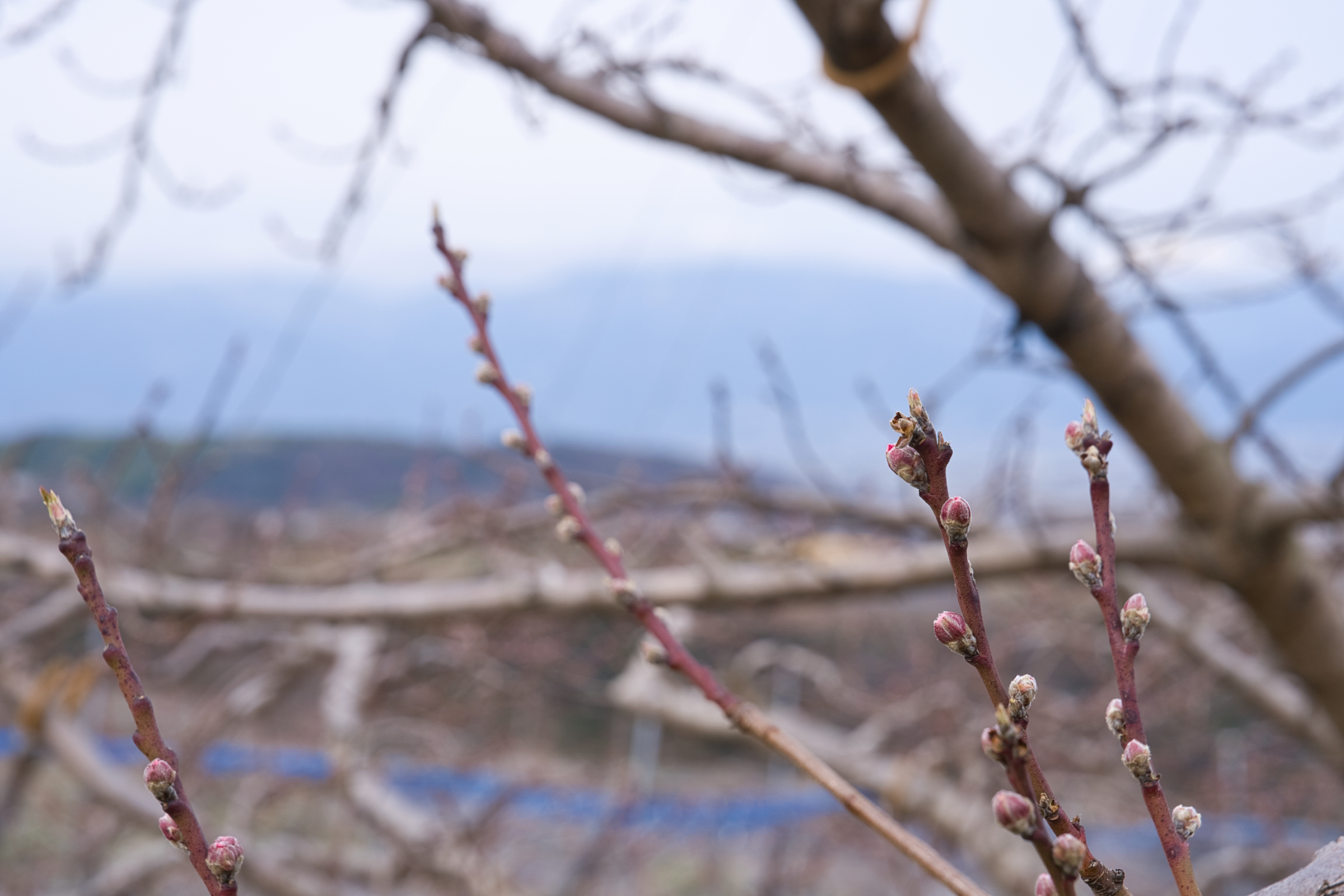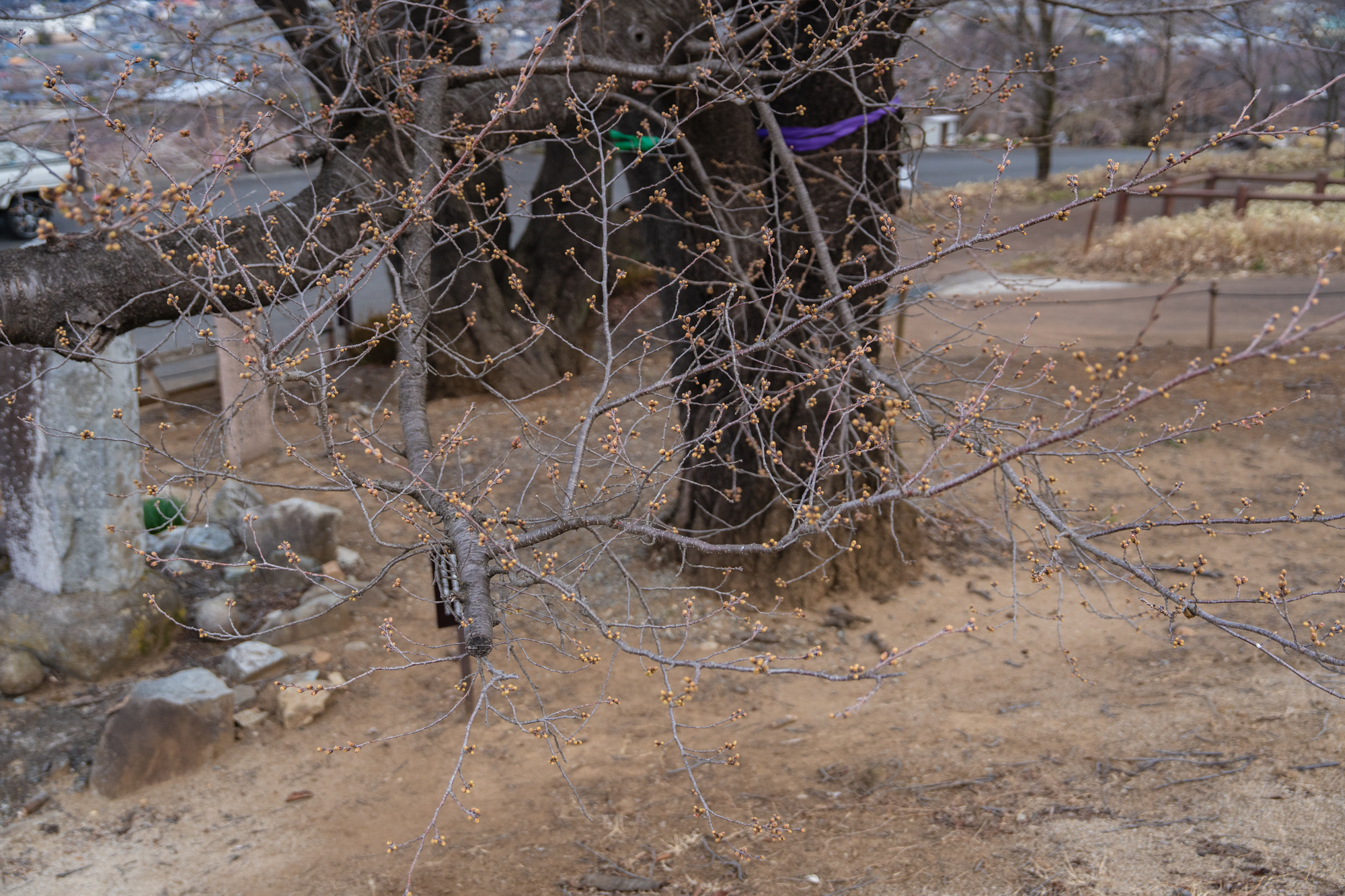 本日は気温が低く肌寒い一日となりましたが、3月後半は気温が高くなる予想もあり、今年は例年より早い開花となりそうです。現在はまだ蕾が固く閉じているものがほとんどですが、ところどころ先端がピンク色に色づき始めています。