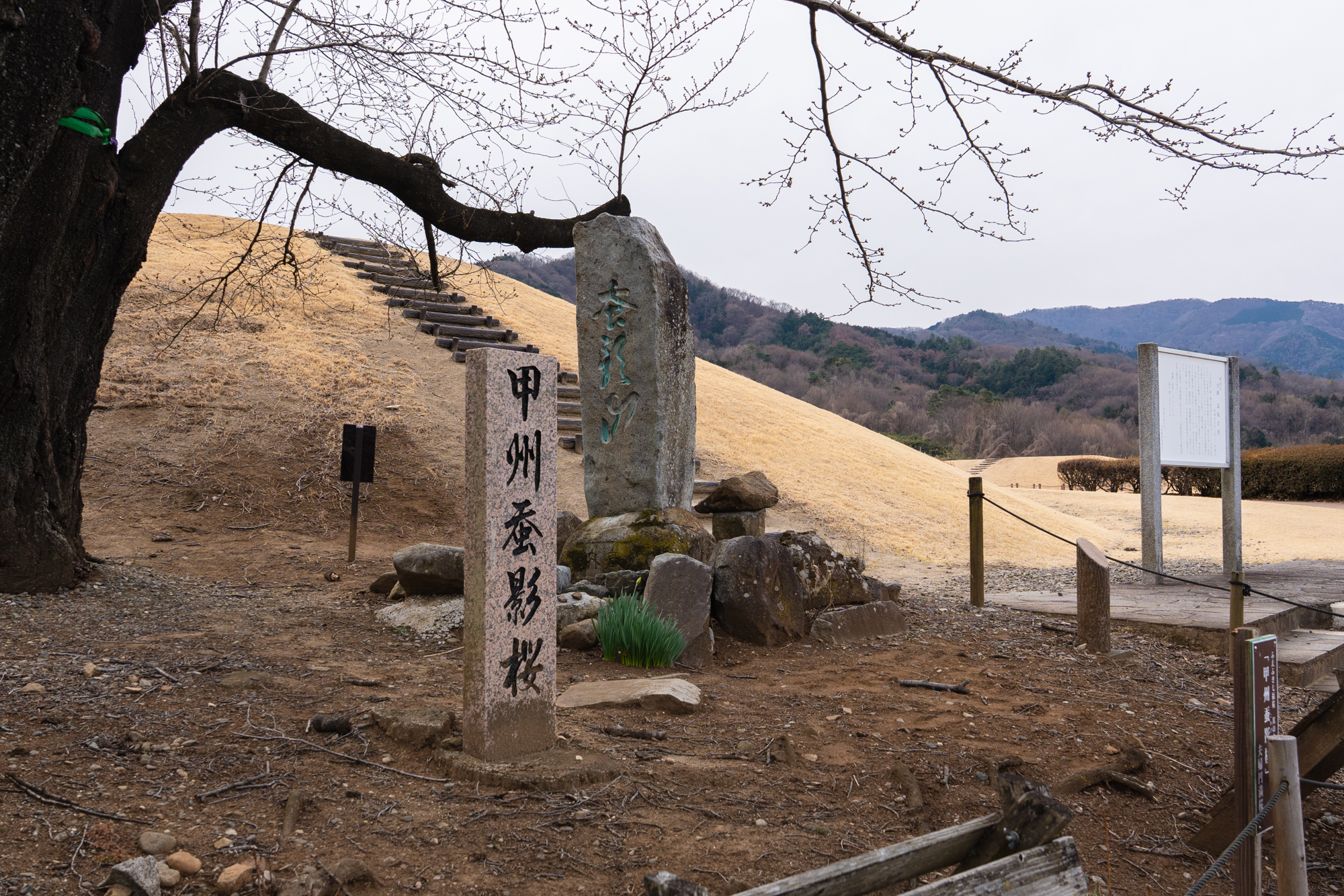 甲府盆地を見下ろす小高い丘にある八代ふるさと公園は、盃塚古墳(円墳)と岡の銚子塚古墳(前方後円墳)、そしてシンボル桜の大木「甲州蚕影桜」が並び、南アルプスや八ヶ岳まで一望できる、県内屈指のロケーションです。