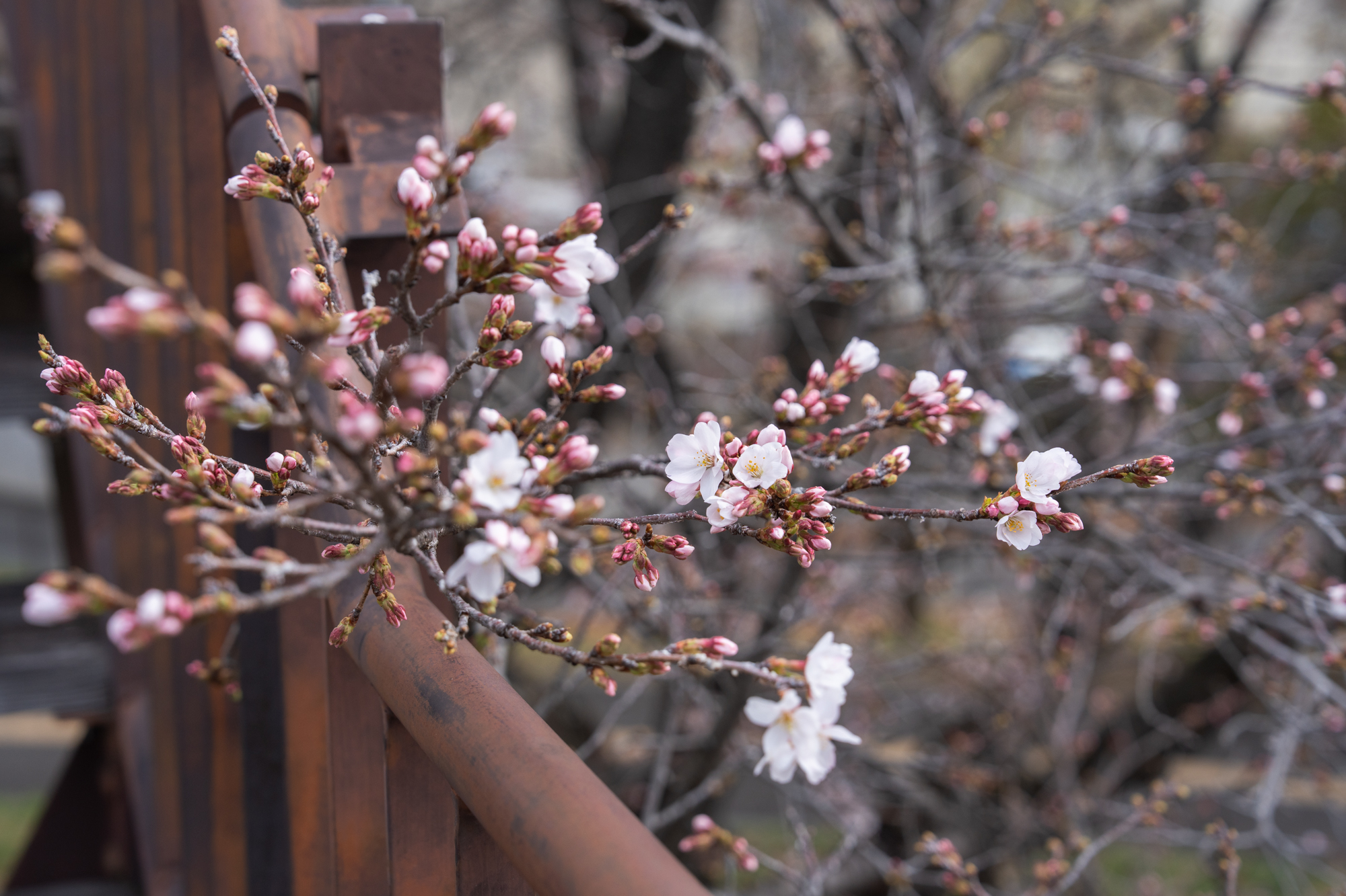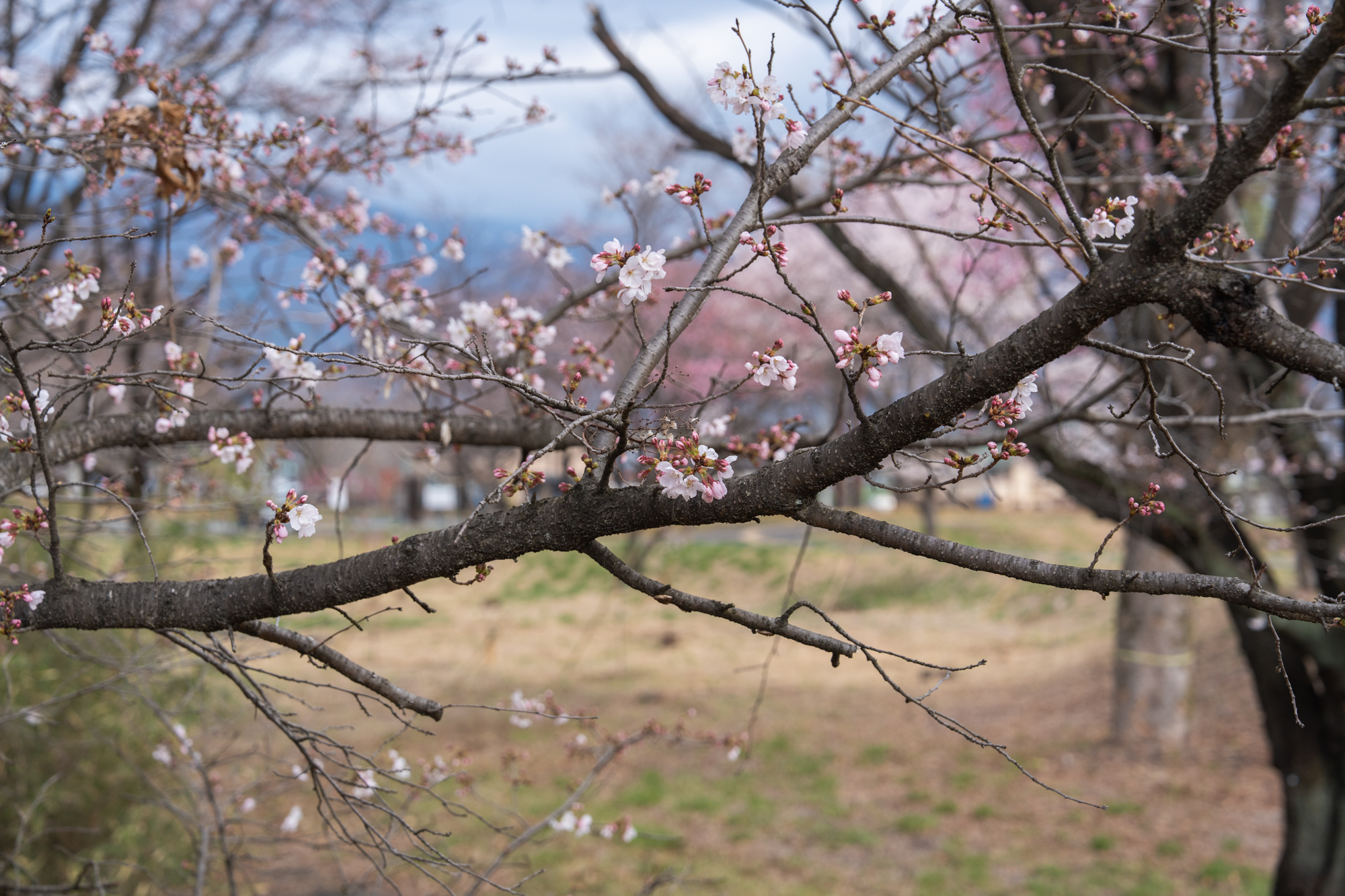 昨日に引き続き、金川の森「さくらの森」の桜の開花状況です。入り口付近の早咲きの木に加え、中央の若木でも、他より早いペースで開花が進んでいます。また遠目からでも桜の花が確認できる程、全体的にも開花が進んでいます。