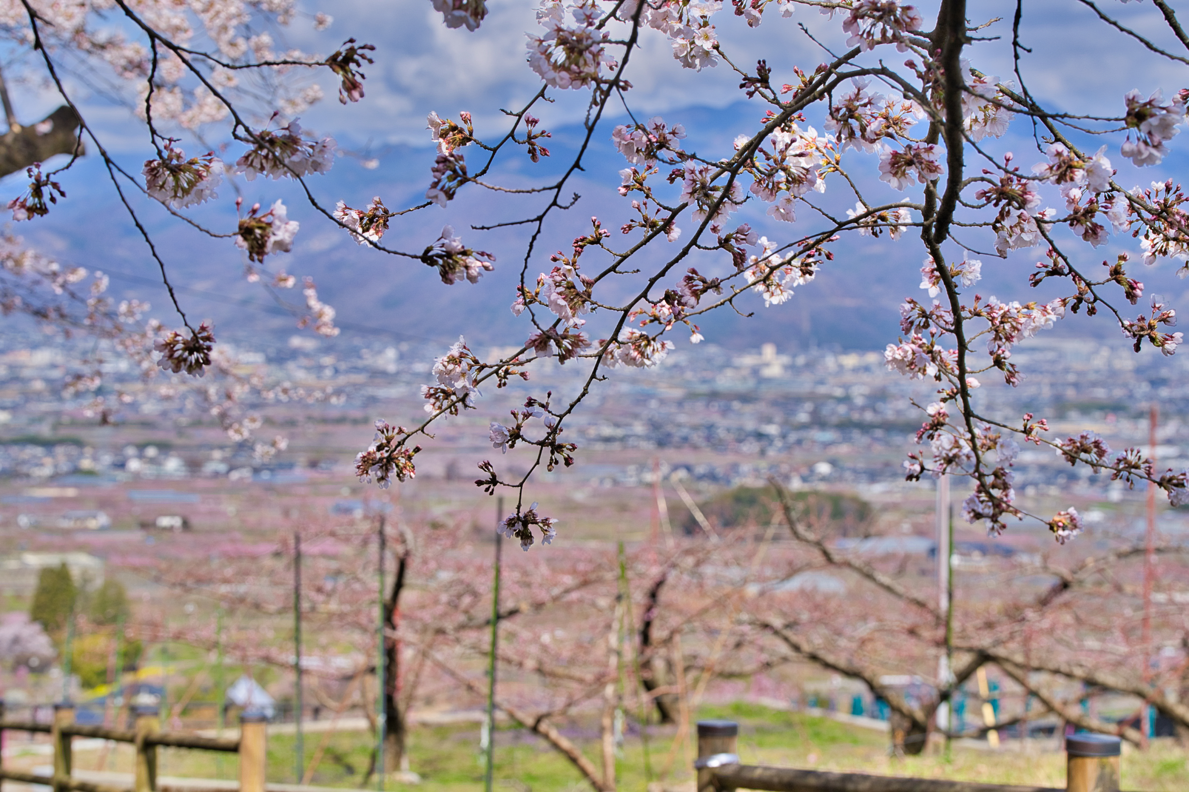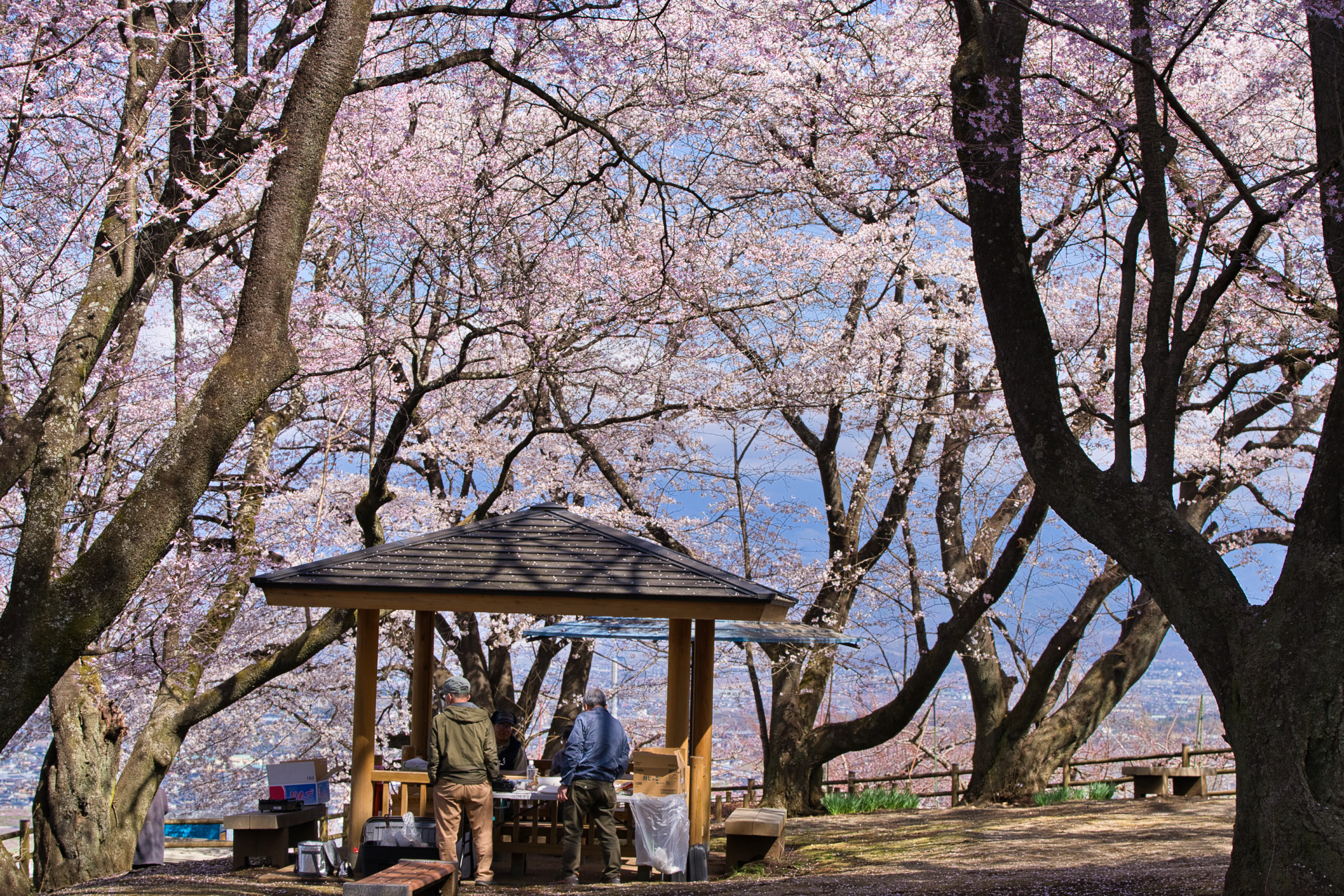 こちらの場所は、桜の名所でもありますが、眼下に広がる桃源郷を一望できる場所でもあり、花鳥の里スポーツ広場へ車を駐車し、地域の景色を目線の高さで桃の花を楽しみながら花鳥山への坂を上がると、敷き詰めた桃色絨毯の景色を堪能いただけます。ぜひ、桃源郷ウォークしてみてください。