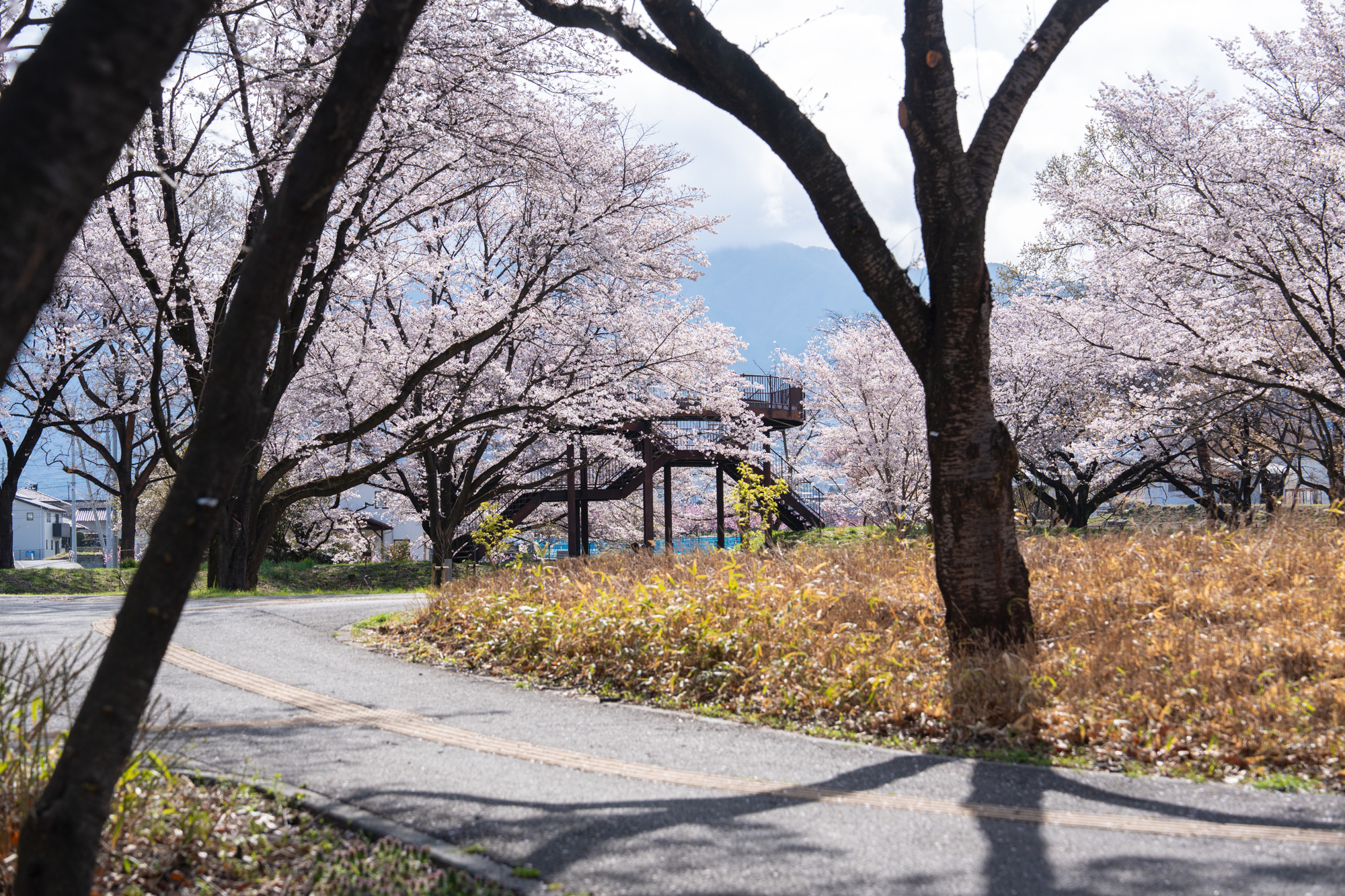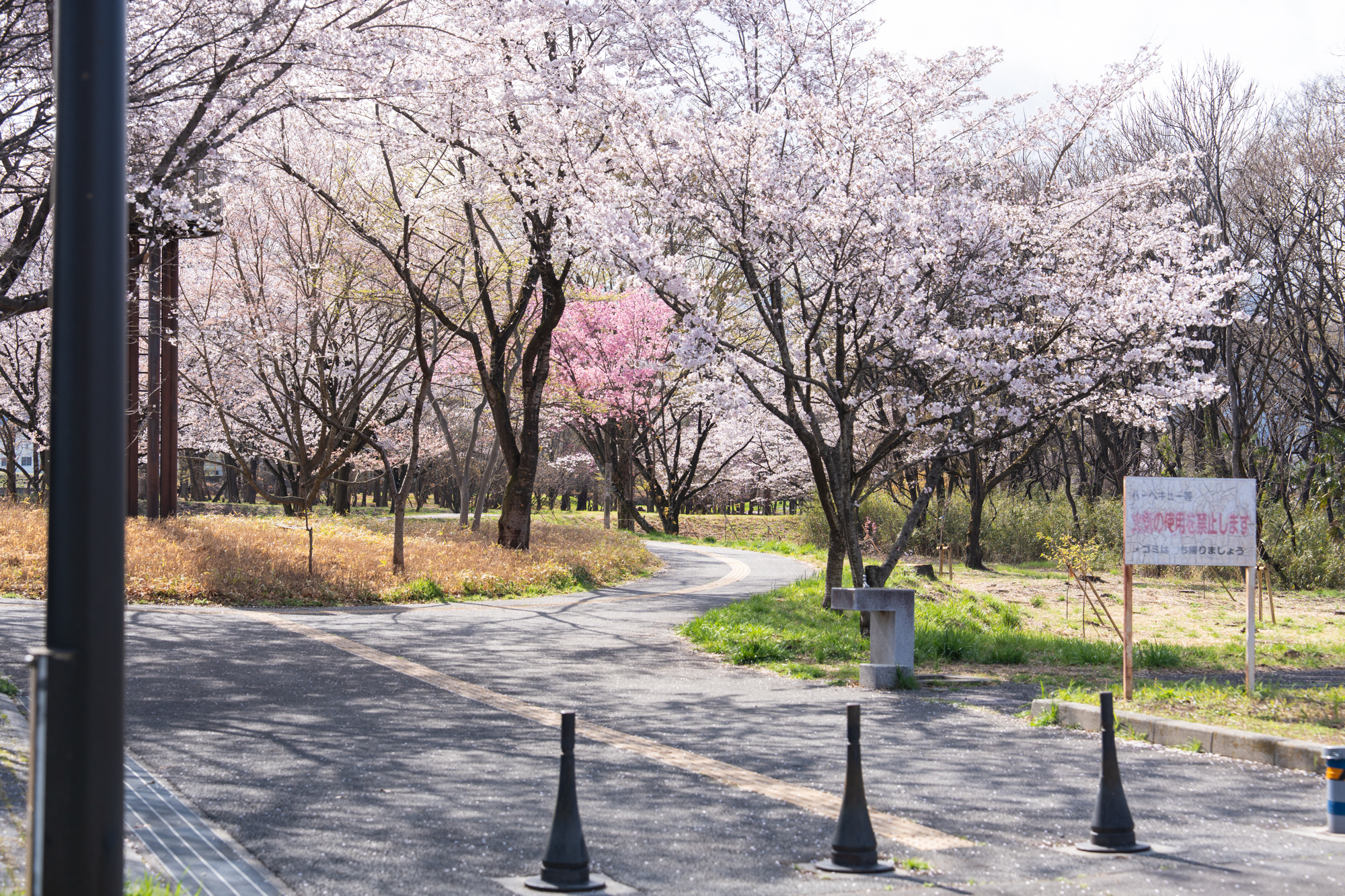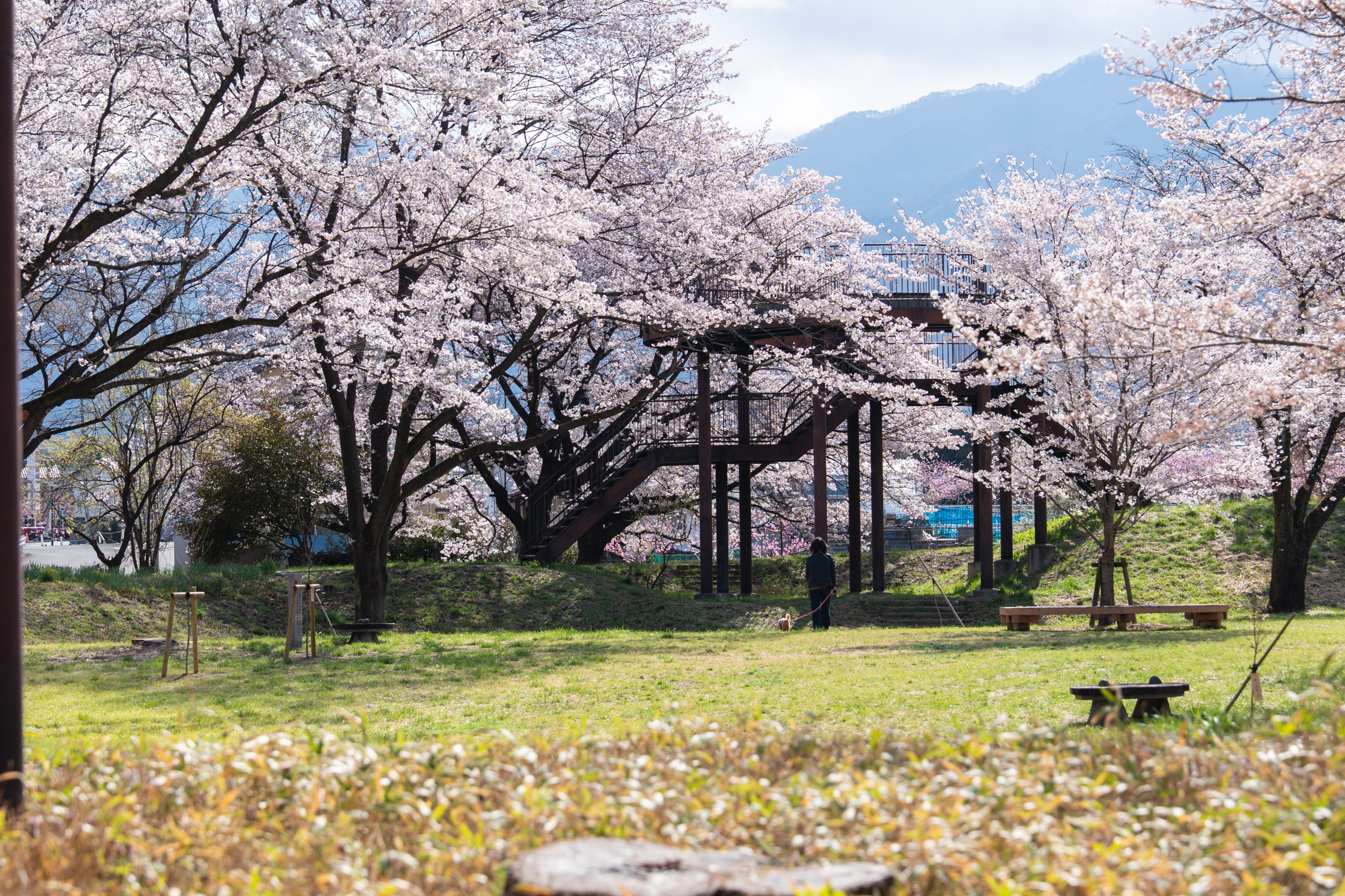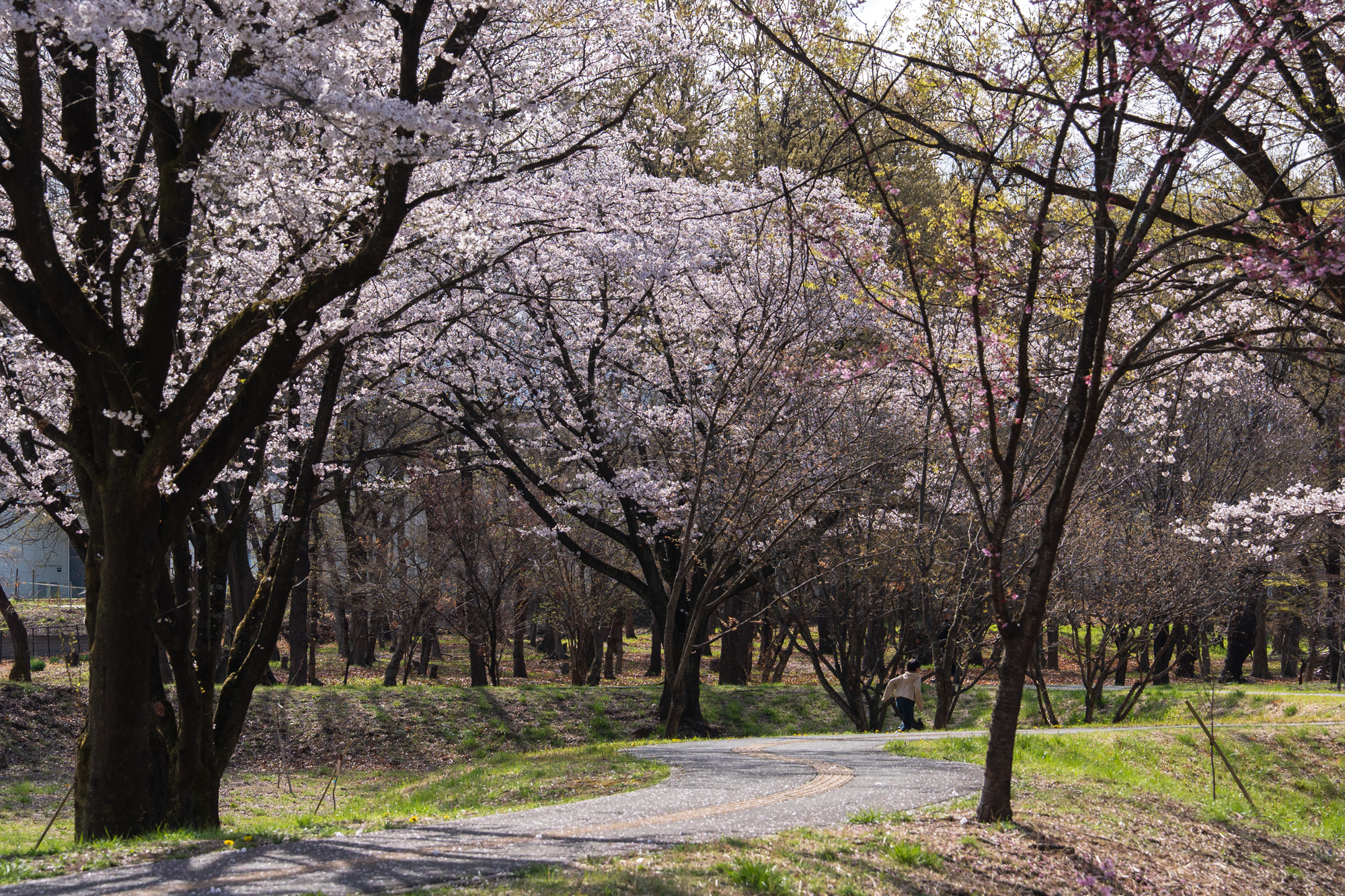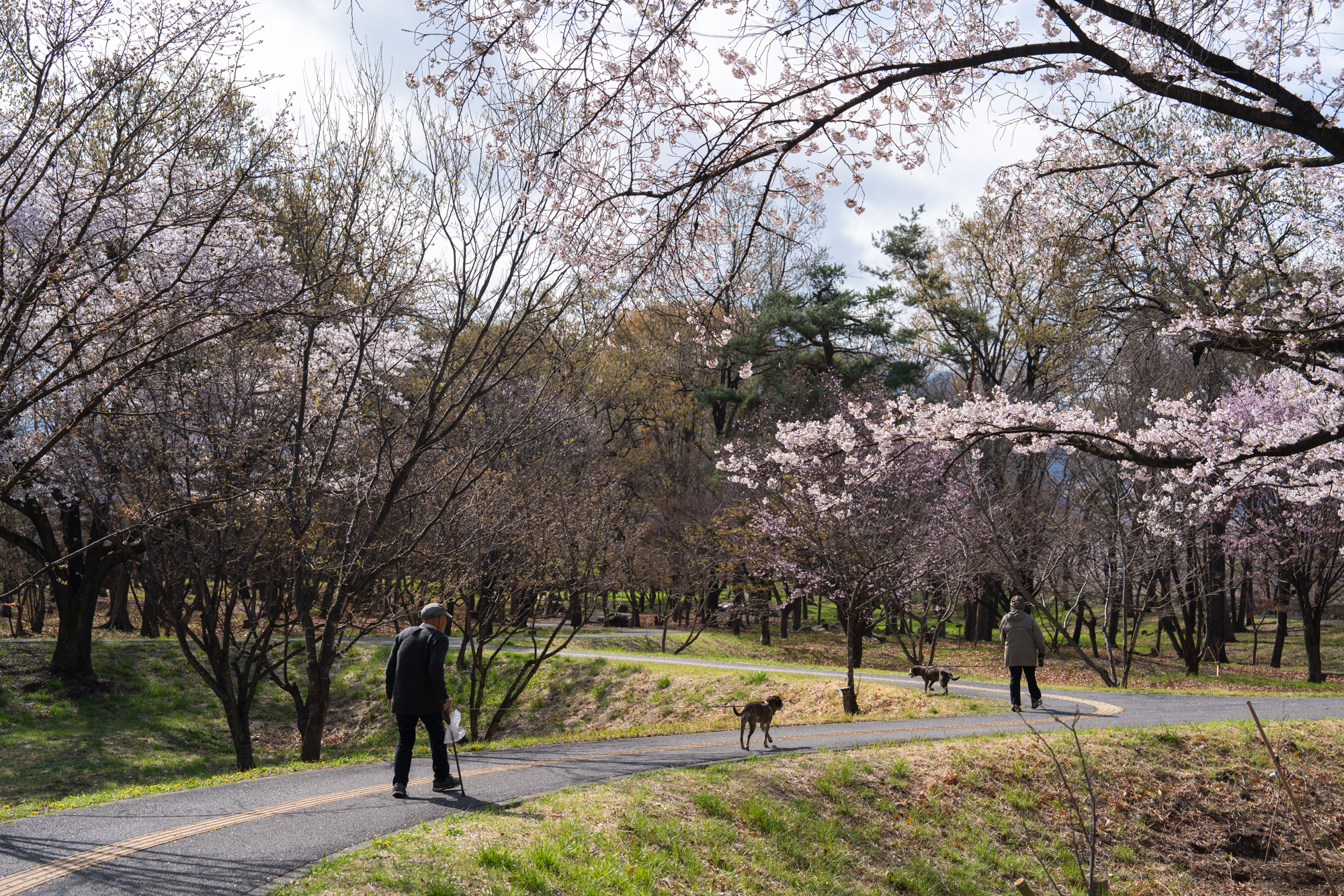 第7回目となる金川の森さくらの森の桜の開花状況です。全体的にほぼ満開を迎え、枝いっぱいに咲き誇る桜が見頃のピークとなっています。穏やかに晴れた今日は、愛犬とともに散策を楽しまれている方の姿も多く見られました。