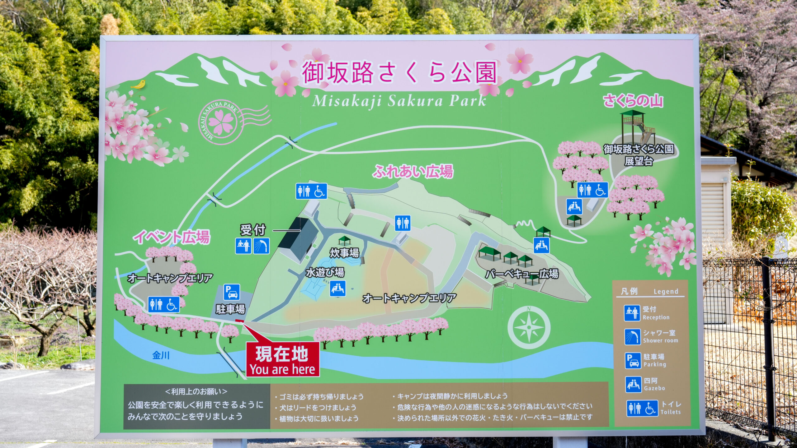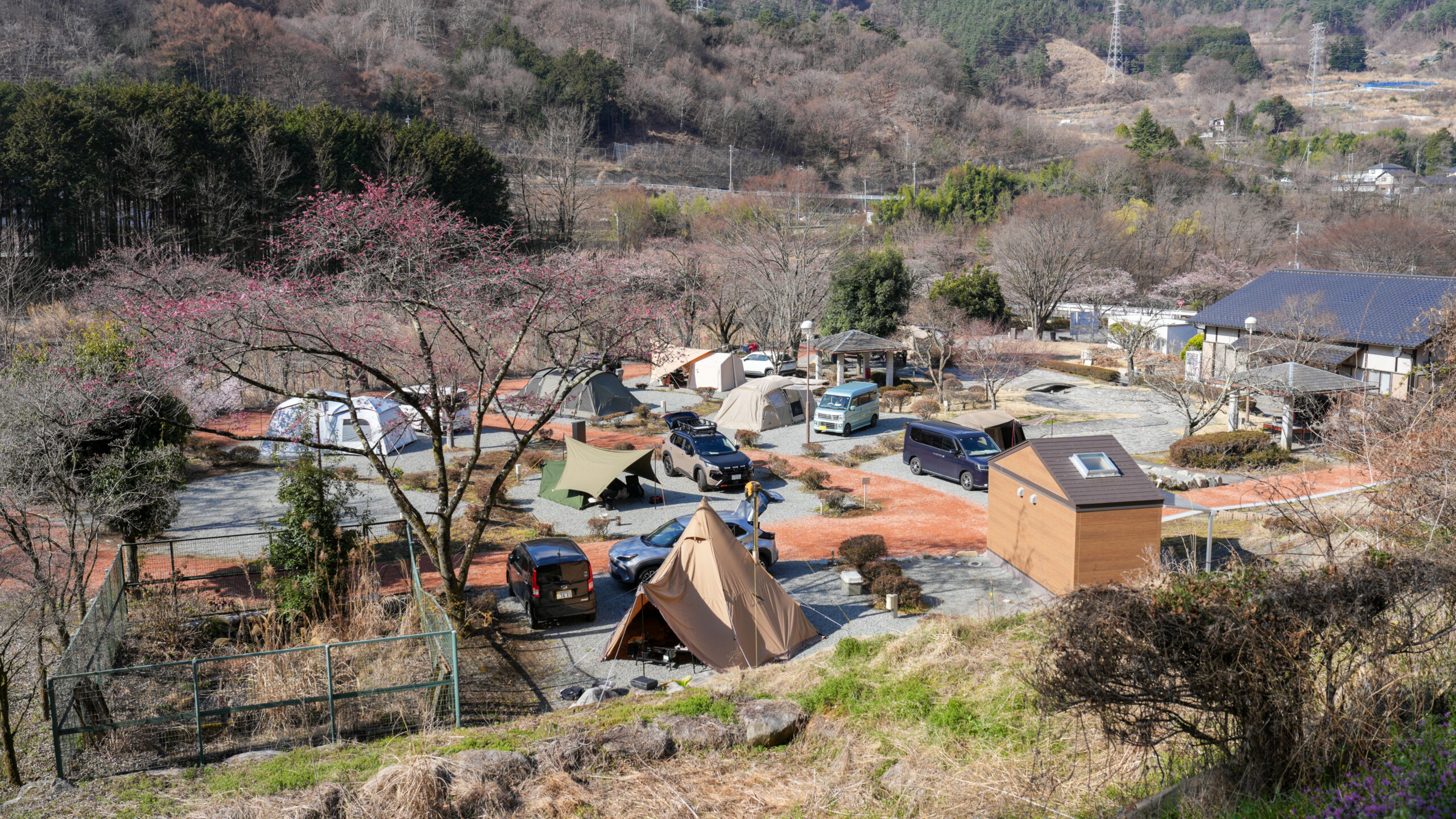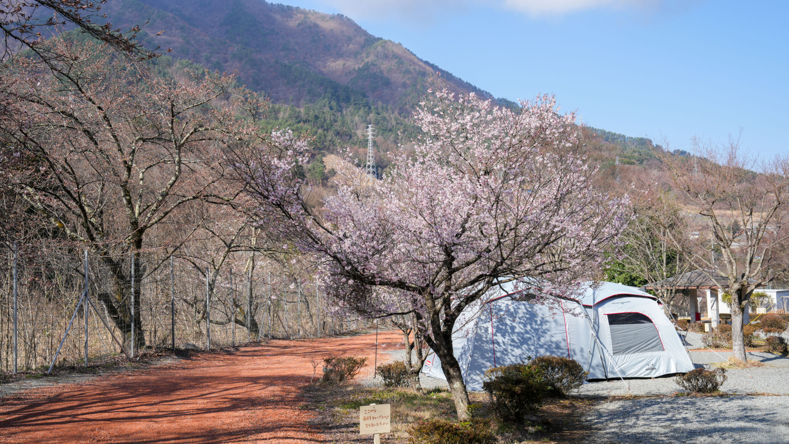 御坂町御坂路さくら公園の桜は少し開花が進み、2分咲きほどです。ここは標高が高いため、他のエリアと比べ1週間ほど遅れて見頃を迎えます。今日は多くの方がキャンプをしに訪れておりました。ここは有料のキャンプエリアもありますので、訪れた際は案内板に従いお花見を楽しんでいただけたらと思います。引き続き、開花情報を更新していきますのでチェックしてみて下さい。