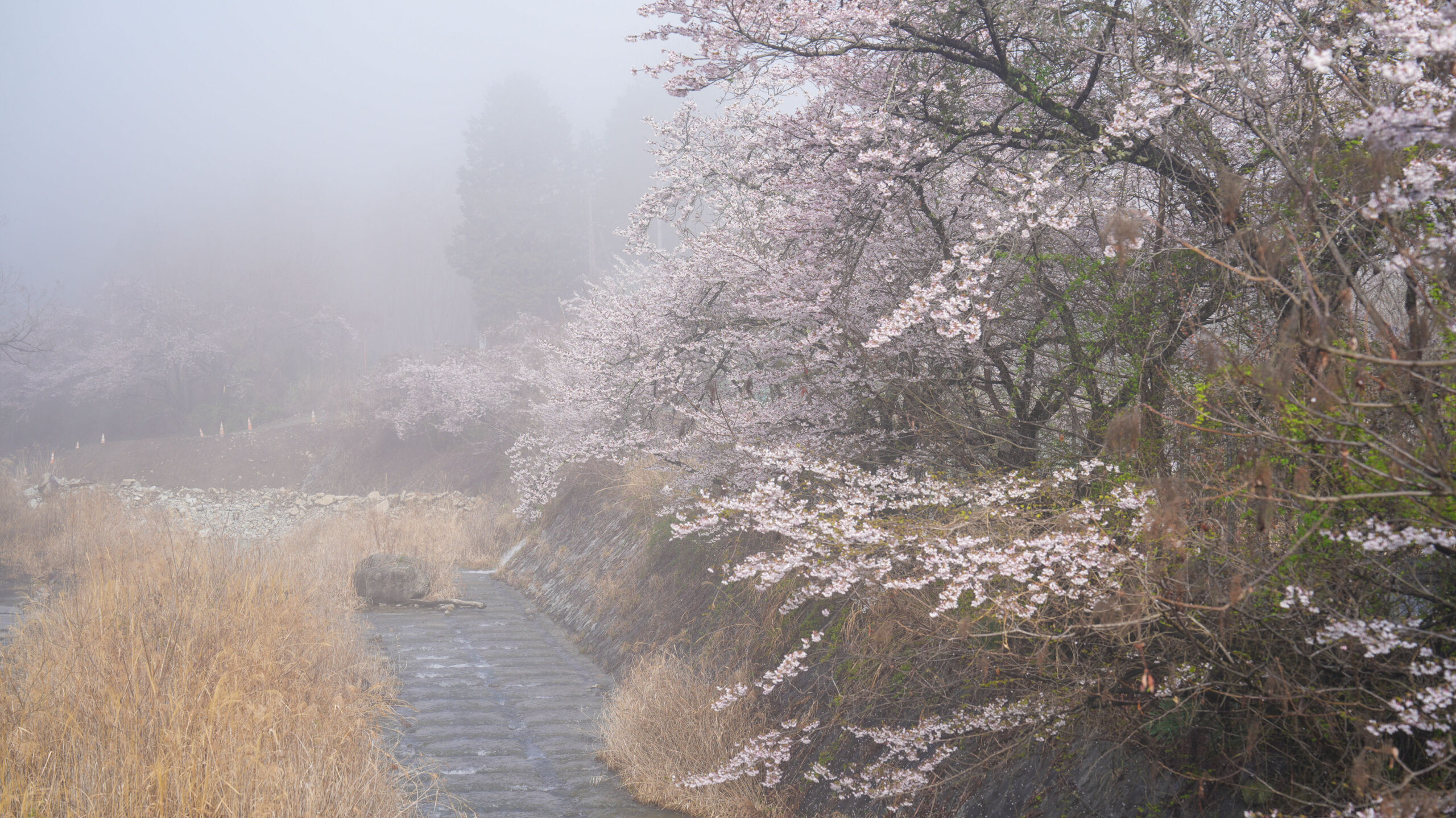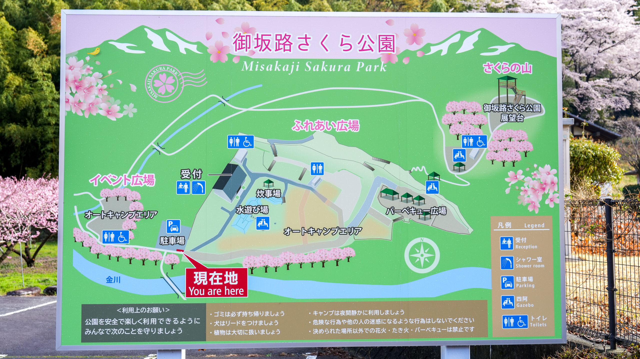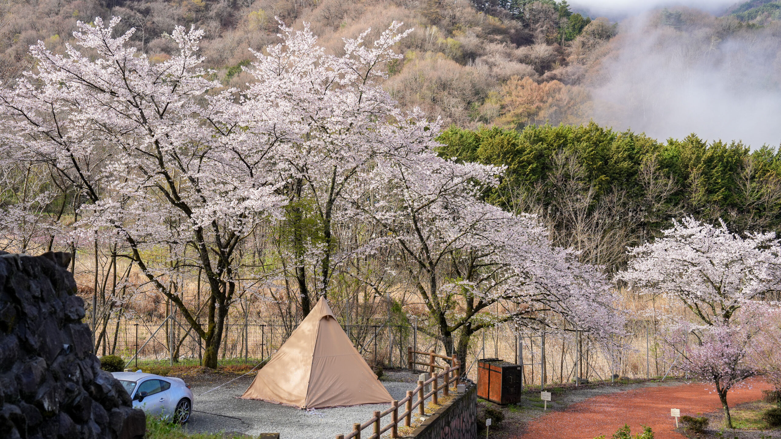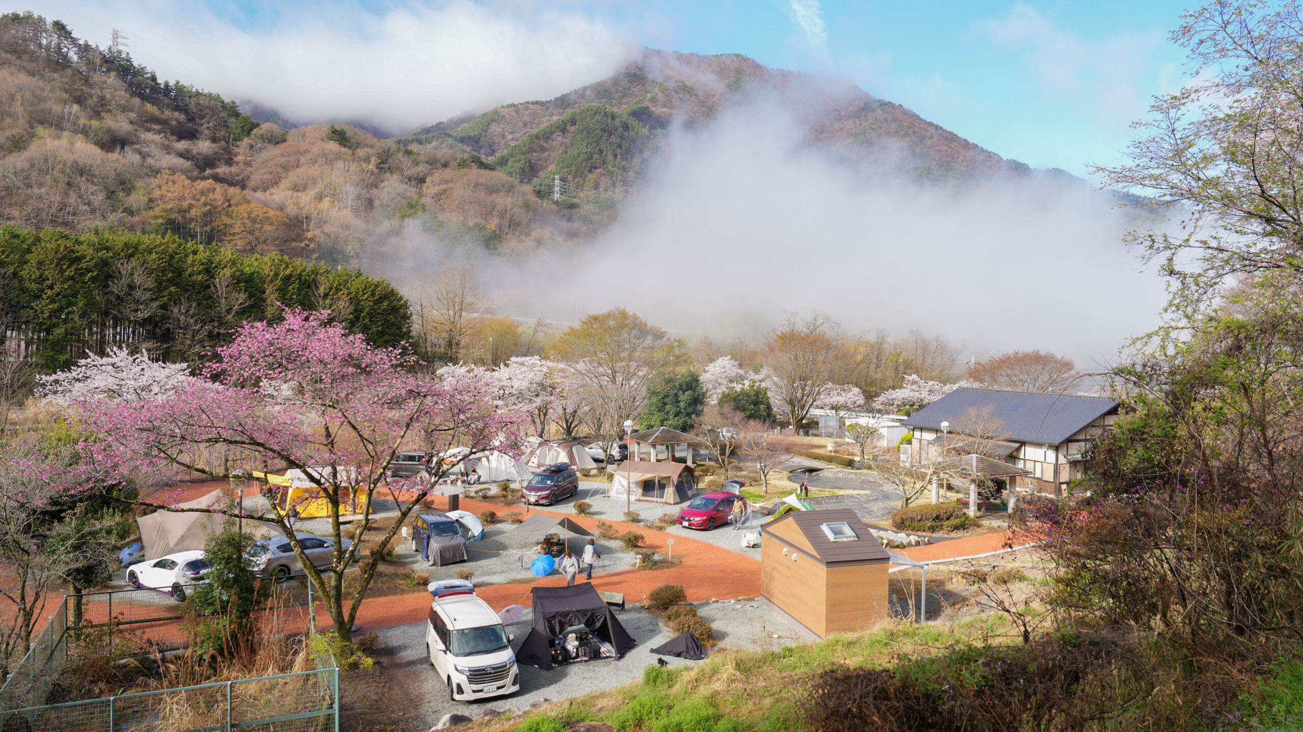今朝撮影に訪れたところ、辺りは霧に包まれ、桜と相まって非常に幻想的な景色が広がっていました。週末ということもあり、多くのキャンパーの方々で賑わっています。昨日の雨の影響が心配されましたが、桜はそれほど散っておらず、十分にお花見を楽しめそうです。一方、さくら公園周辺の桃の花はまだ蕾が多く、見頃を迎えるのはもう少し先になりそうです。ここは有料のキャンプエリアもありますので、訪れた際は案内板に従いお花見を楽しんでいただけたらと思います。